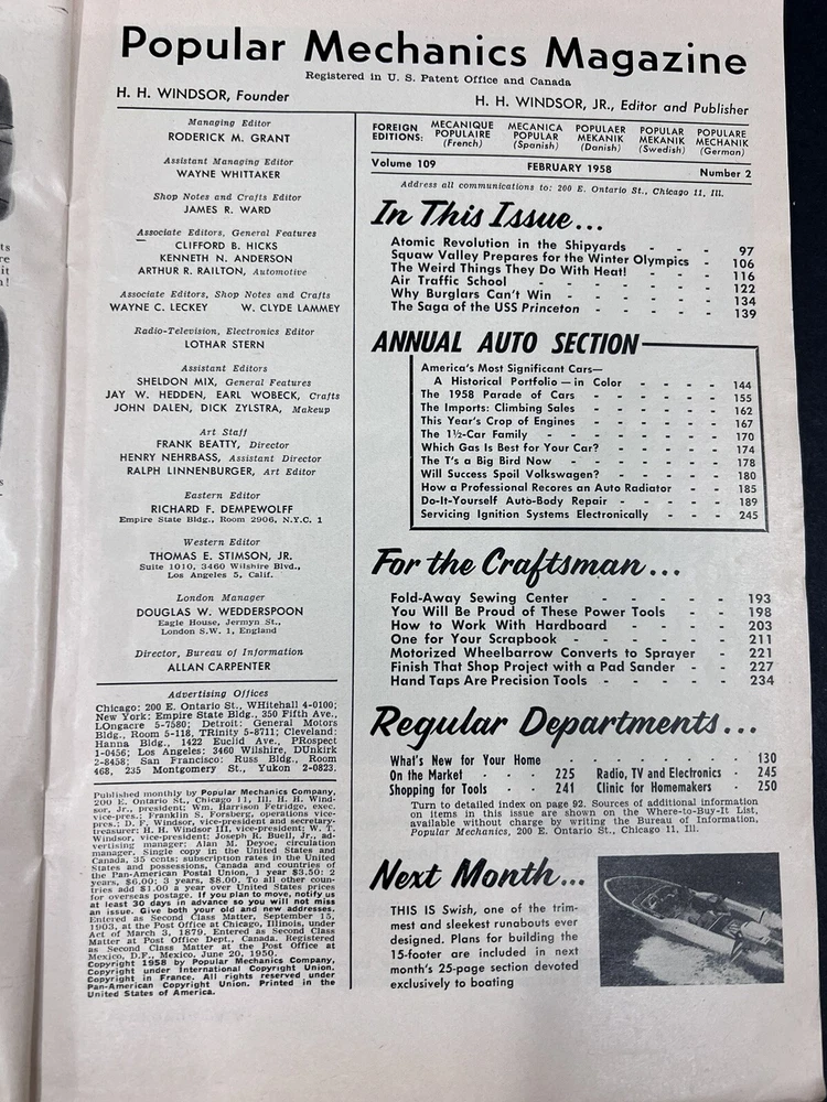 Popular Mechanic February 1958, Cars, Boats, Craftsmen Back Issue