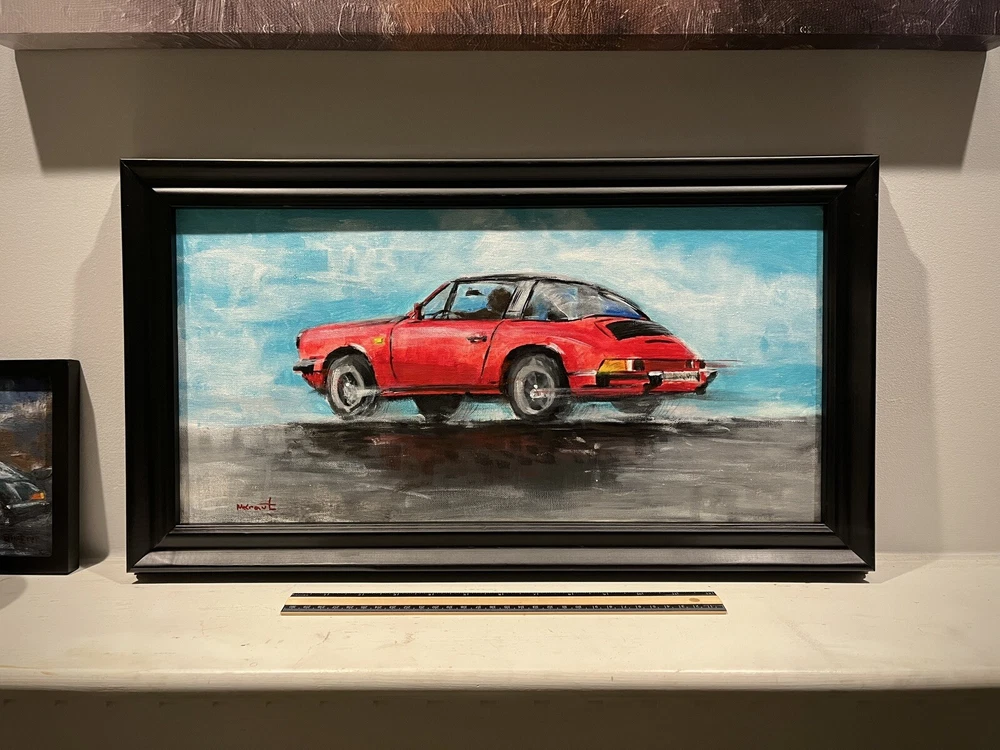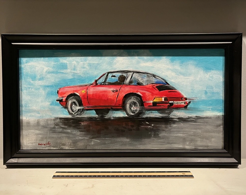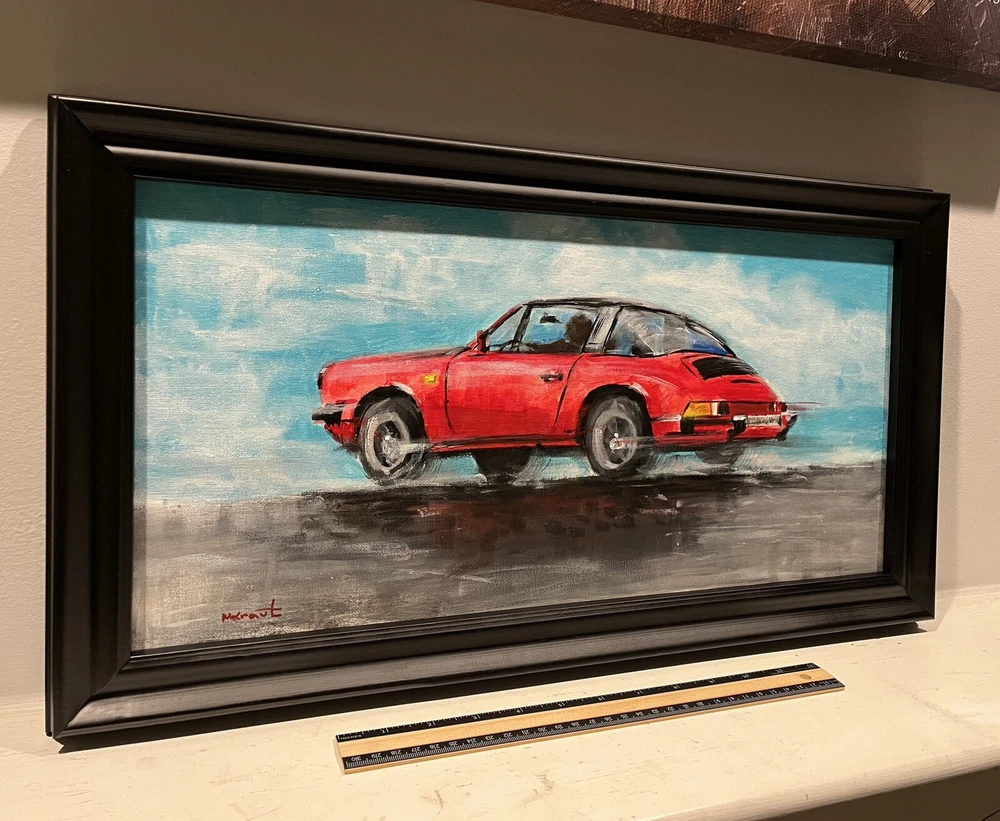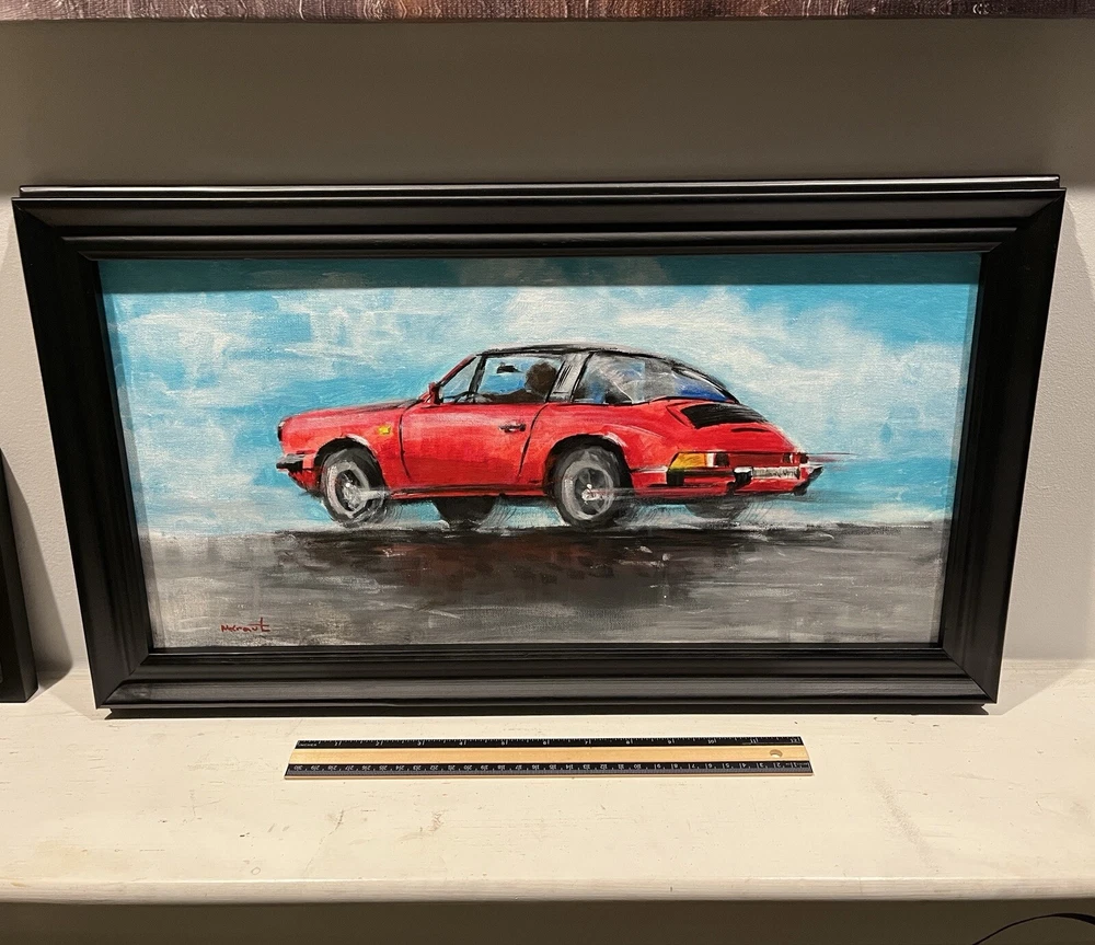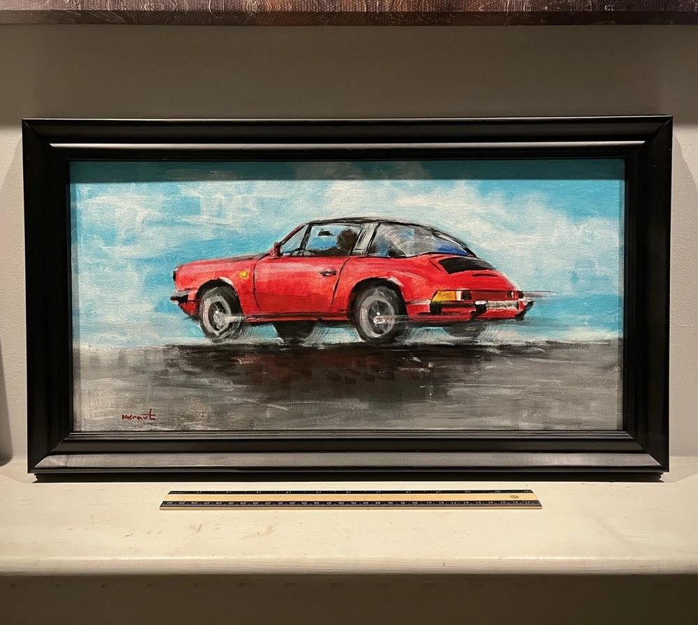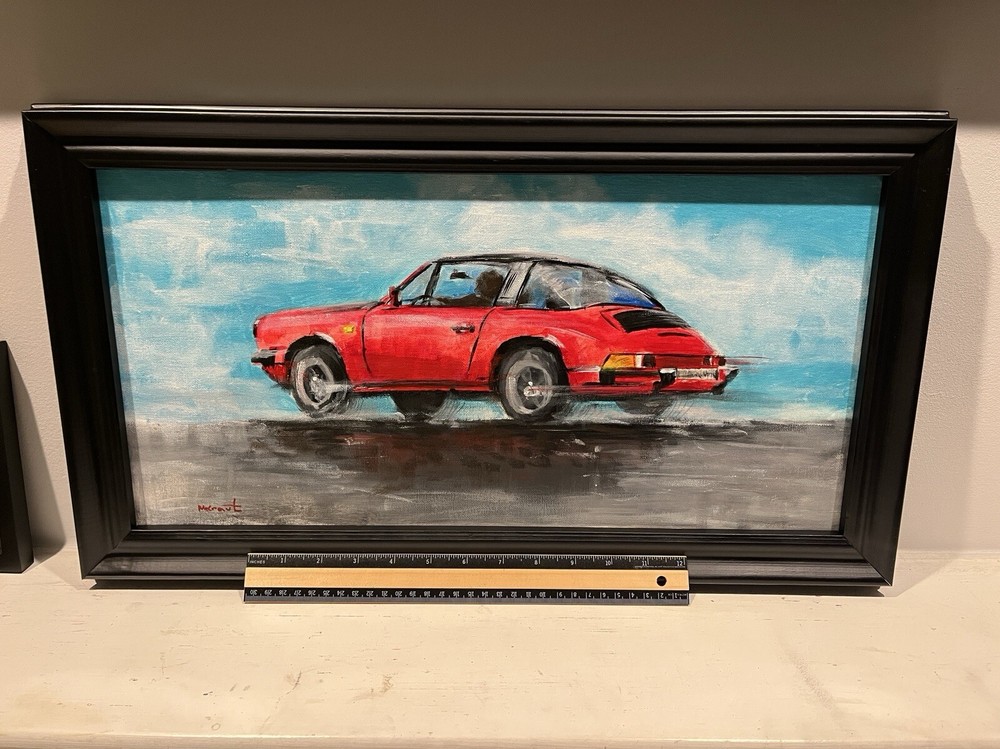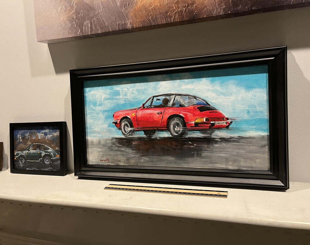 Original attractive RED / Guards Red or Continental Orange PORSCHE 911 Targa in Motion. This painting is capturing one of the best Classic Historic German Car. It is Unique traditional painting with bold brushstrokes. The artwork executed on acid free stretched cotton canvas. This Porsche 911 painting coming framed to customer and ready to be hanged. Overall framed dimensions are 12”x22”x3/4” It is original traditional artwork for automotive art collectors item is unique and handmade and it is not a print or a copy or a photograph. Free domestic shipping with insurance and tracking number provided via USPS.