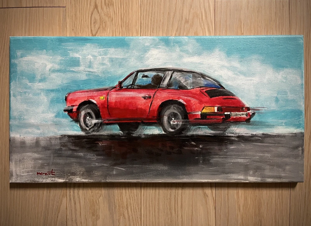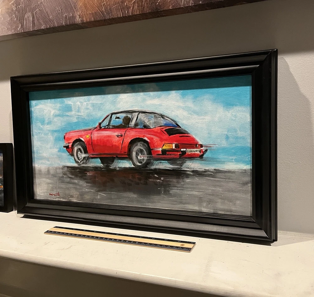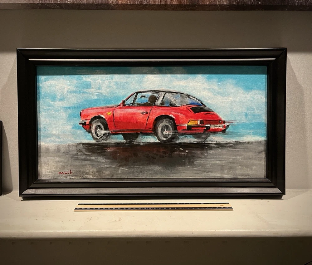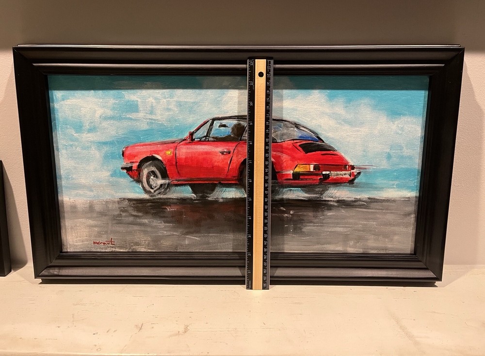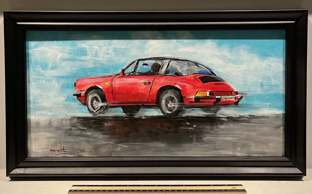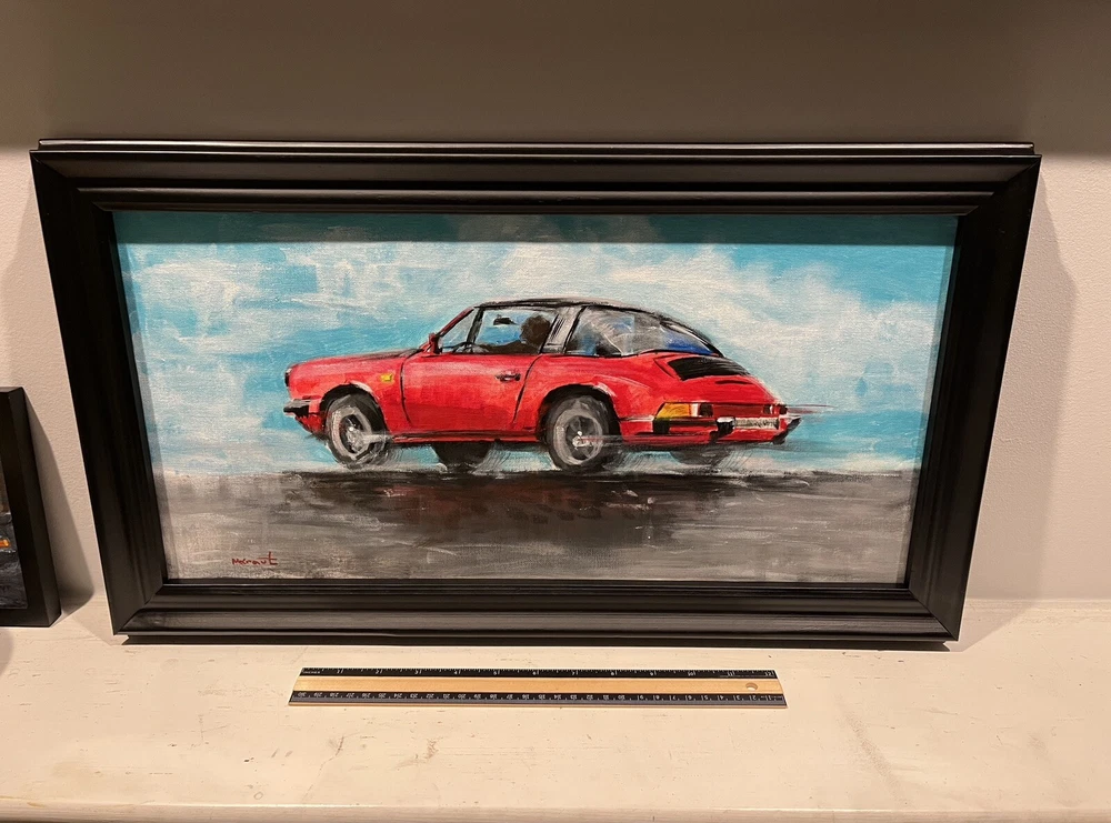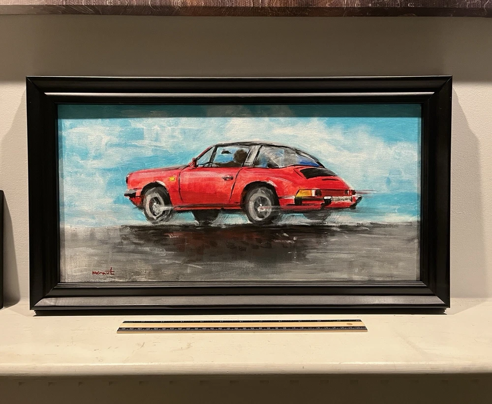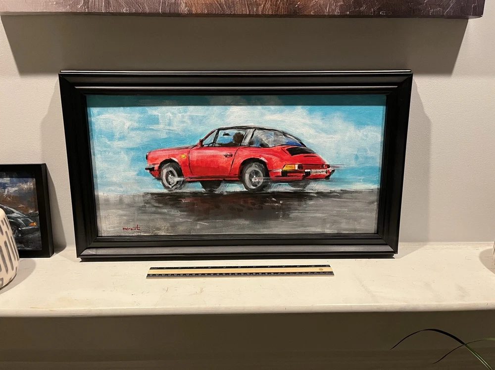 Original attractive RED / Guards Red or Continental Orange PORSCHE 911 Targa in Motion. This painting is capturing one of the best Classic Historic German Car. It is Unique traditional painting with bold brushstrokes. The artwork executed on acid free stretched cotton canvas. This Porsche 911 painting coming framed to customer and ready to be hanged. Overall framed dimensions are 12”x22”x3/4” It is original traditional artwork for automotive art collectors item is unique and handmade and it is not a print or a copy or a photograph. Free domestic shipping with insurance and tracking number provided via USPS.