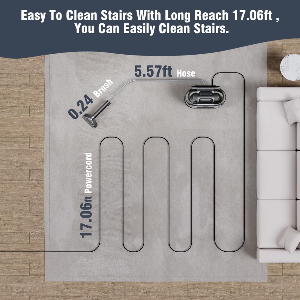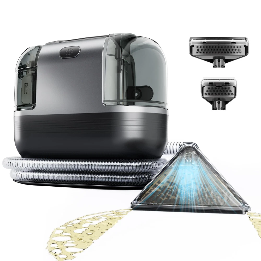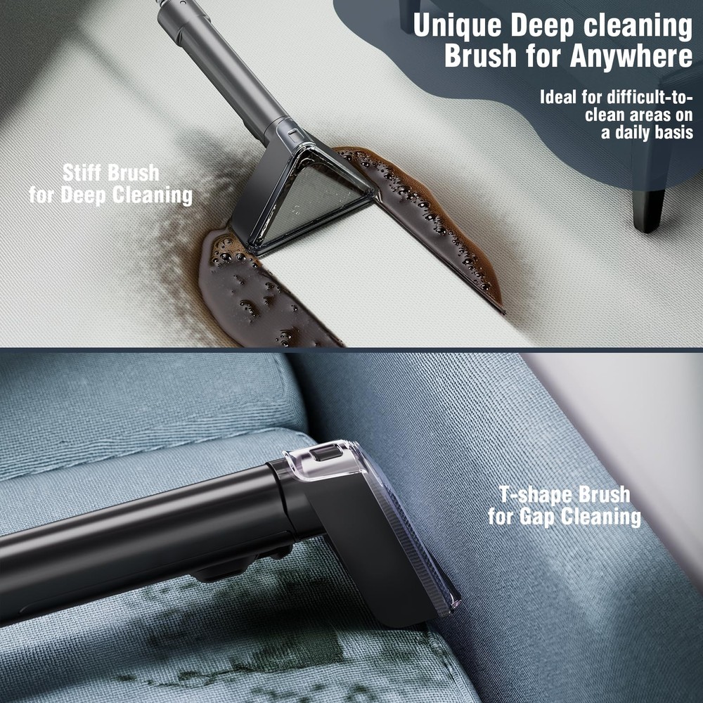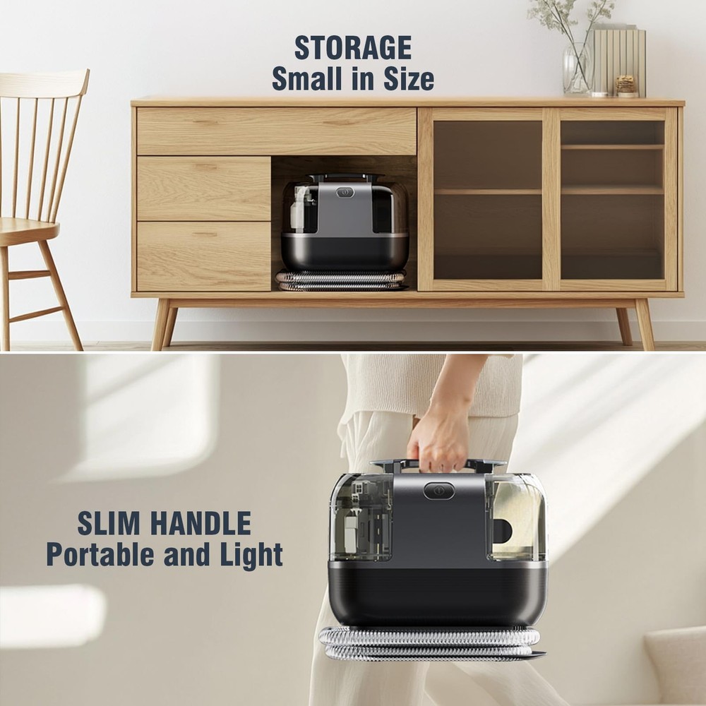 Fabric cleaning machine 【POWERFUL SUCTION FOR QUICK REMOVAL】Carpet cleaner machine is equipped with a 500W motor, which can provide a super suction force of 18Kpa, which can permanently remove stubborn spots and stains like mud, wine, pet messes and more from carpets, upholstery and car interiors. Also, equipped with a strong suction system, ensure that the carpet can dry quickly after cleaning, quickly return to its normal state. 【DUAL WATER TANK & BRUSH HEAD】0.75L sewage tank and 1.20L clean water tank are stored separately, allowing you to easily disassemble the water tank for filling, draining, and cleaning. Tips: The water volume of the dirty tank can't exceed the MAX line, otherwise it may cause the suction of the couch cleaner to stop. The upholstery cleaner machine is equipped with two sizes of brush heads, which can be used for stains in different areas. 【PORTABLE CLEANING】The upholstery cleaner machine comes with an ultra long hose (5.57ft) and power cord (17.06ft), and the small carpet cleaner machine is lightweight and easy to move from one cleaning job to the next. The brush and power cord can be stored on the machine's hook to save space. 【TOOLS FOR EVERY MESS】The carpet cleaner machine is for fabric cleaning that cannot be cleaned as a whole, such as sofa, mattress,car seats,and other hard-to-clean items, conserving water resources and minimizing damage to carpeted furniture caused by repeated cleaning, thereby extending its service life. 【7×24 Hour Customer Service】We are confident in this Carpet Cleaner Machine and so will you. If for some crazy reason you are not 100% satisfied or your Carpet Cleaner Machine accessory is damaged, please feel free to contact us! We will solve the problem for you quickly. Don't worry about after-sales service! We will always be at your service.