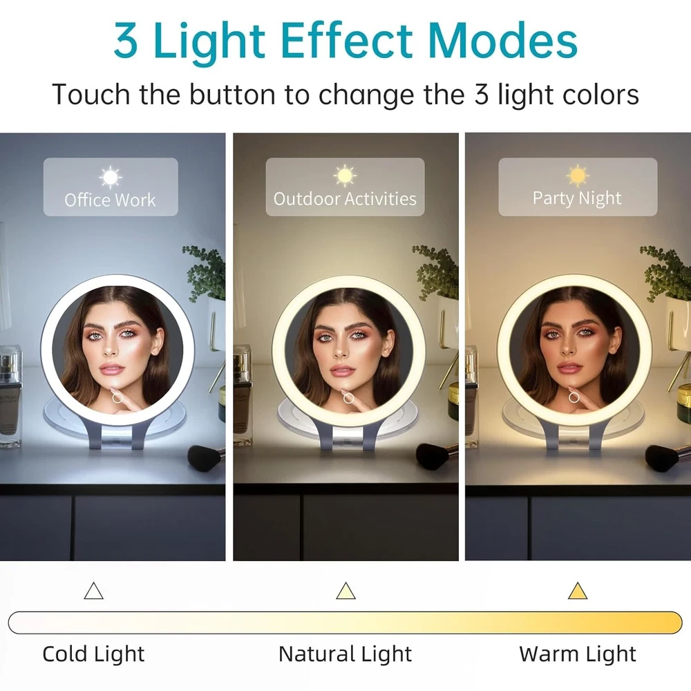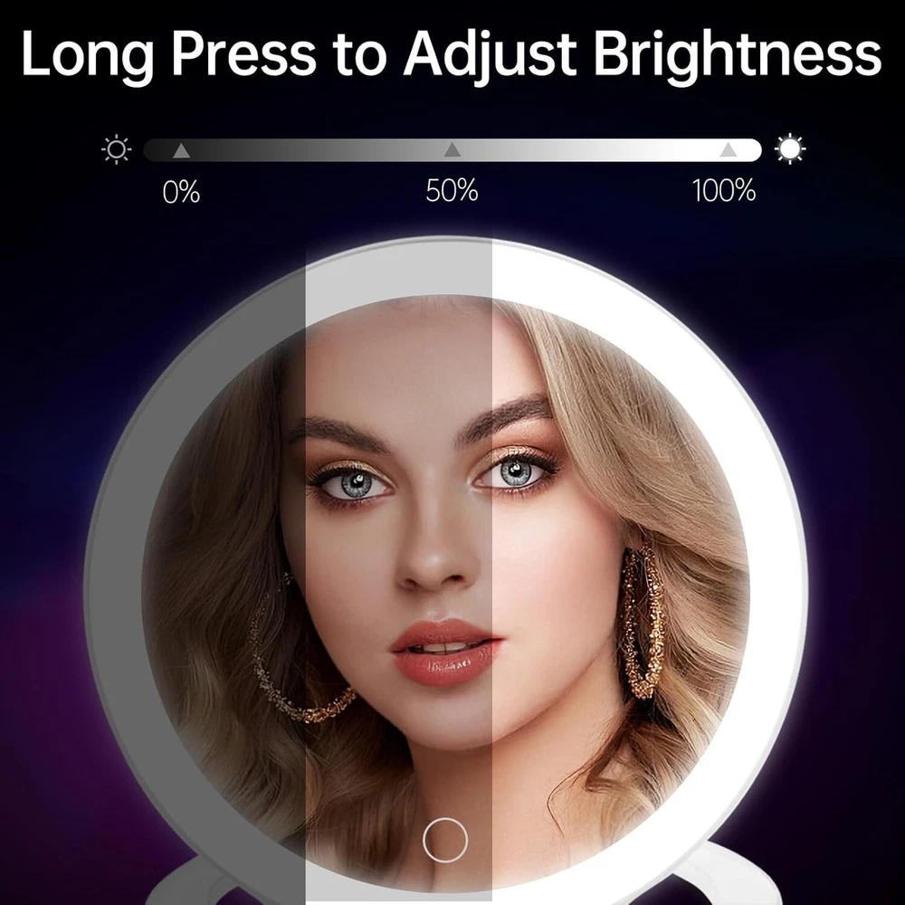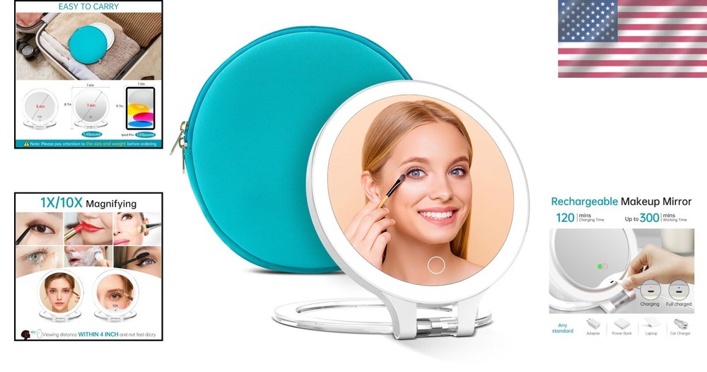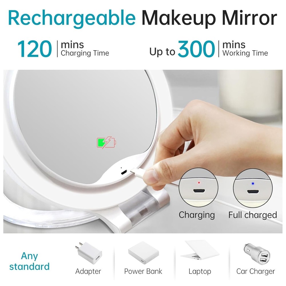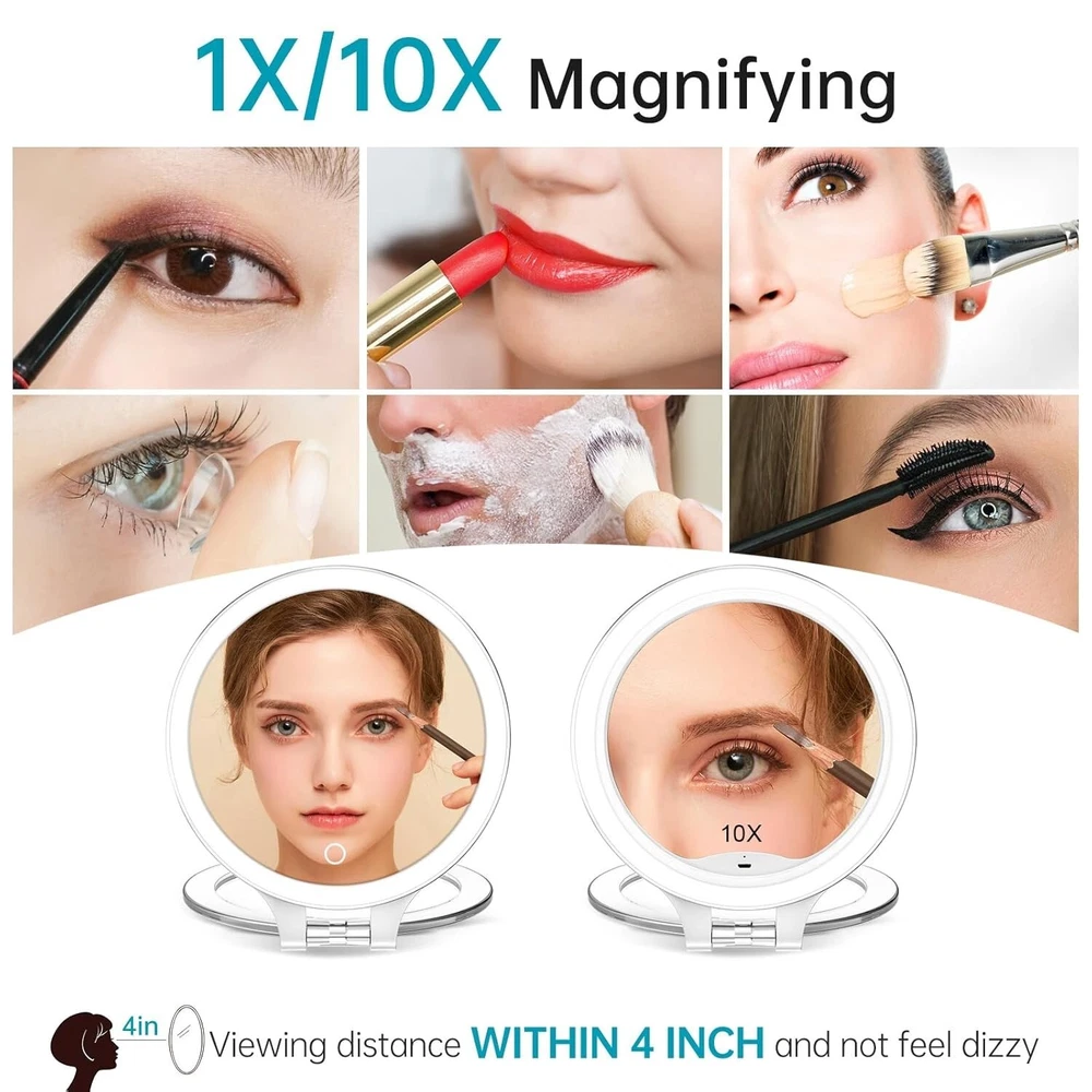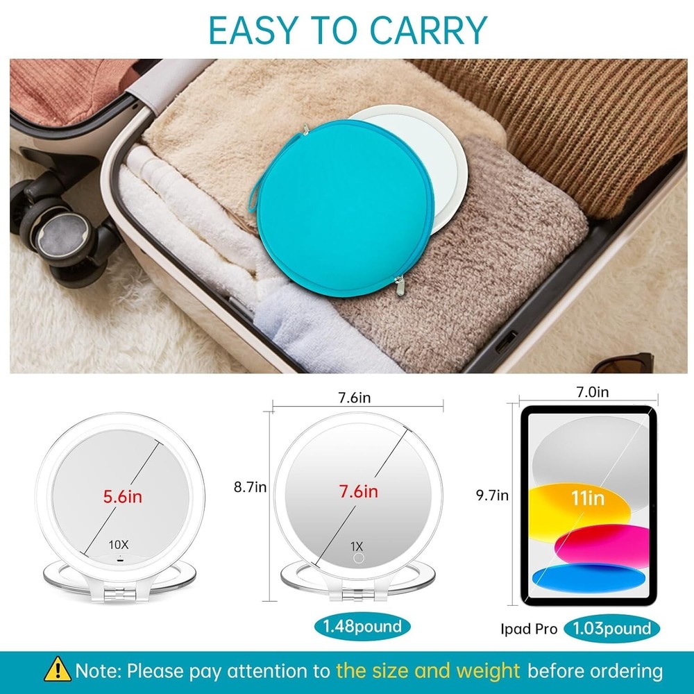 This mirror is a game-changer! The 10X magnification gives flawless precision, while the 1X side keeps everything in perspective. The rechargeable battery lasts forever, and the touch controls make adjusting brightness effortless. Super portable with its sleek storage bag—perfect for travel or daily use. The lighting is soft and natural, no harsh shadows! A must-have for anyone who loves makeup or skincare. Worth every penny!