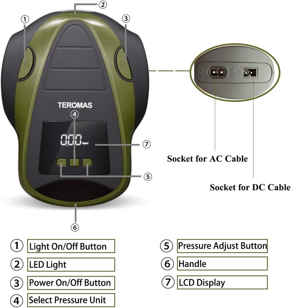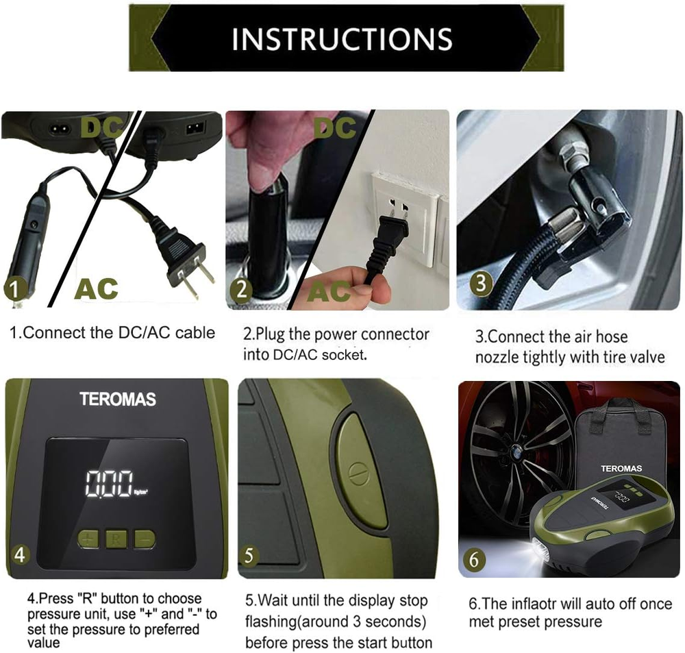AC/DC OUTLET & MULTI-PURPOSE: TEROMAS tire inflator unique AC/DC with 12V car cigarette light plug as well as 110/120V wall plug for home outlet makes this inflator more useful since you can use it anywhere. Come with 3 additional adaptors which makes it perfect for cars, RV, motorcycles, bikes tires, air mattress, inflatable boats, balls and other inflatables.(NOTICE: NOT SUPPORT FOR HEAVY DUTY TRUCK OR TRACTOR TIRES) STRONG POWER & SPACE-SAVING: Up to 150 PSI, Inflate the P195/65R15 car tire from 0 to 35psi under 4min. It makes inflating tires in emergency easier and more convenient. Portable size which take up very little space and allow you keep it in your automobile or home. PROGRAMMABLE INFLATION: Use the "R" button to set your desired pressure unit, and then press the "+" and "-" buttons to set the desired pressure. The air compressor will automatically shut off when it reaches the pre-set pressure (Please make sure the pressure you set is higher than the current pressure of your tire). DIGITAL DISPLAY & LED Lighting: Bright backlight LCD display makes for convenient use at night. As well as being bright enough to see under strong sunlight, The air compressor gauge can display the pressure in PSI, BAR & KG/CM². TEROMAS air pump is equipped with bright and long-lasting LED lights, easy to use even in the dark. 100% SATISFACTION: This is a great tool to take along with your driving tours, use it anytime you need. Meanwhile, any problems, please feel free to contact us. We will do our best to help you. GET 100% SATISFACTION. Product Description Package includes: 1 x Air Compressor 4 x Nozzle Adapters 1 x User Manual 1 x AC Cable for Home Use 1 x DC Cable for Car Cigarette Lighter 1 x Replaceable Fuse Not Included the Carrying Bag Specific features of our air compressor: Auto shut-off function; Set of nozzle adaptors; Digital display and LED work-light for easy use; AC (110V) and DC (12V) adaptable for home and car using. Digital Portable Powerful AC DC Tire Inflator TEROMAS presents you with a premium quality programmable air compressor. This portable tire inflator comes with two power cords (110V and 12V) making it convenient to use both on the road and indoors. This product is designed for compact portability. Kindly Notes: The air compressor can not be used on big truck and motor lorry. When connect the AC outlet at the first time, please wait 5 seconds to let the air pump energize. Avoid over-inflating, never exceed the recommended pressure. Items over inflated may burst and cause serious injury. Inflate 10 or 15 minutes let it have a break for 10 minutes. Digital LCD Display Four Nozzle Attachments Bright LED Light Replaceable Fuse