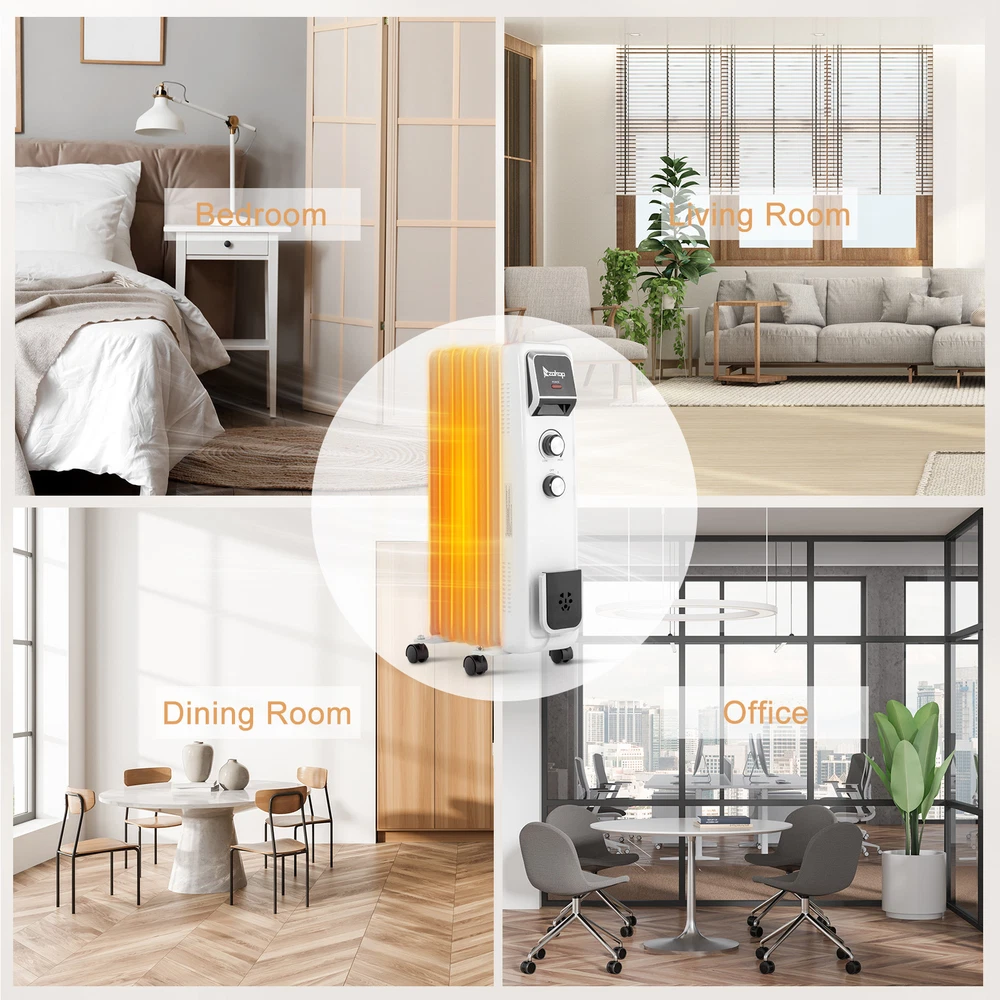 Introductions: Stay warm and cozy throughout the winter with this 1500W Oil Filled Radiator Heater. Designed for optimal comfort, this portable electric space heater is perfect for heating up bedrooms, offices, and other indoor spaces up to 200 sq.ft. With three heat settings, you can easily customize the temperature to your liking. Built with safety in mind, it features overheat and tip-over, ensuring peace of mind while you enjoy consistent warmth. Its quiet operation and portable design make it a practical and versatile addition to any home. Features: 1. Powerful and Efficient Heating: This 1500W oil-filled radiator heater quickly warms up rooms up to 200 sq.ft. The oil-filled fins efficiently retain heat to ensure consistent warmth throughout the day. With three heat settings and an adjustable thermostat, you can easily set the perfect temperature for your space. 2. Whisper-Quiet Operation: Enjoy a serene and cozy environment with this ultra-quiet heater. It operates with minimal noise, making it ideal for bedrooms and offices where silence is essential. 3. Overheat & Tip-Over: If the unit overheats or is accidentally knocked over, it will automatically shut off to prevent any potential hazards. This makes it a safe choice for households with children or pets, giving you peace of mind while staying warm. 4. Cord Storage Rack: Keep your space tidy and organized with the built-in cord storage rack. When the heater is not in use, simply wrap the power cord around the storage rack for easy, clutter-free storage. 5. Portable Design with Wheels: Effortlessly move this heater from room to room with its four 360° swivel wheels. Whether you need extra warmth in your bedroom, living room, or office, this heater's portable design makes it easy to transport and use wherever it's needed most. Specifications: 1. Voltage: 120V/60Hz 2. Rated Power: 1500W 3. Coverage Area: 15-20 sq.m / 200 sq.ft 4. Heating Element: Heating Tube 5. Timer: No 6. Heat Settings: Low - High 7. Digital Display: No 8. Base Included: Yes 9. Remote Control: No 10. Certification: FCC 11. Warranty: 1 year 12. Product Dimensions: (12.6 x 5.9 x 15) in / (32 x 15 x 38) cm 13. Weight: 7.5 lbs / 3.4 kg Package Includes: 1 x Radiator Heater 4 x Wheels 1 x User Manual
