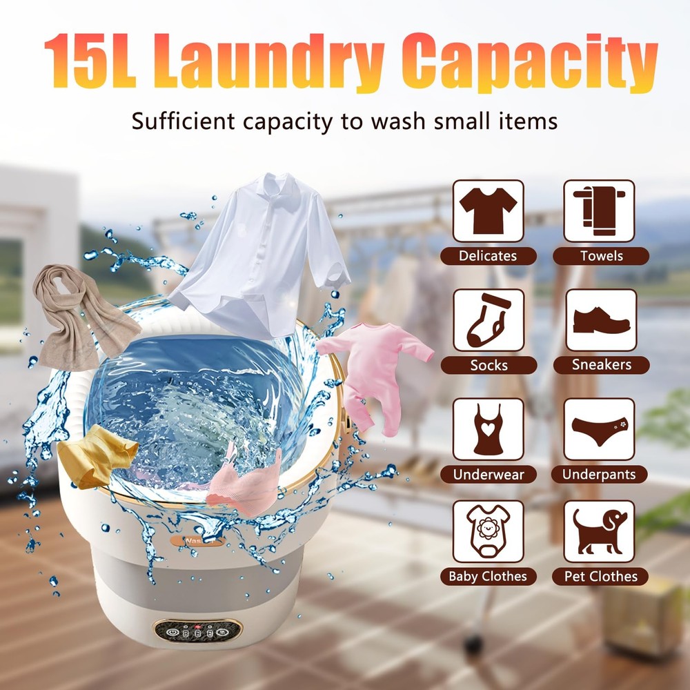 Specifications: Product Name: Portable mini washing machine Capacity: 15L Color: off-white Material: TPE and food-grade silicone Function: washing, drying Time Setting: 3 minutes, 5 minutes, 10 minutes Package: 1* Portable Folding Laundry Machine 1* Drain Basket 1* Power Adapter 15 L Compact Size: Designed for efficient small-volume laundry, 15L mini washing machine can wash multiple pieces of clothing at once, especially for delicate fabrics; the powerful motor produces strong vortexes to deep clean clothes and make them look brand new; can be connected to the kitchen faucet or sink for easy filling and draining Convenient and Foldable: Introducing the ultimate portable washing machine for small spaces and busy lifestyles! The lightweight body with folding structure adopts a stylish design, providing complete washing in a compact device, is very suitable for travel, camping, RV travel or small spaces such as apartments, dormitories, and hotels; the external handle is convenient for carrying, and it is easy to store after folding, which does not take up space Washer and Dryer 2 In 1: Foldable washing machine can not only wash clothes, but also the equipped drain basket can help remove most of the moisture from the clothes after washing and speed up the drying of clothes; after washing clothes, drain the water in the washing machine, install the drain basket on the buckle at the bottom of the washing machine, put the clothes in the basket, select the time mode, and it can be rotated to drain; do not use the drain basket when washing clothes Easy Operation: Mini washing machine is equipped with an intuitive one-touch control panel, which makes washing simple and convenient; equipped with 3-minute, 5-minute and 10-minute timer buttons, just press the button to start the washing program; whether you are a busy office worker, an elderly person not familiar with electronic products, or a first-time user, this portable washer can make washing easy and worry-free Durable Material: Made of excellent TPE and food-grade silicone materials, portable washer machine is durable and safe for daily use; designed for washing delicate clothes such as underwear, socks, and baby clothes, provides a gentle and efficient washing experience; blue light deep washing protection can improve cleanliness and promote healthy living Energy and Quiet: Collapsible washing machine significantly reduces water and electricity consumption, helping you save water and electricity bills while reducing green burden; equipped with a low-energy noise reduction motor to ensure smooth operation of the washing machine and reduce shaking during operation, allowing you to enjoy a quiet washing experience