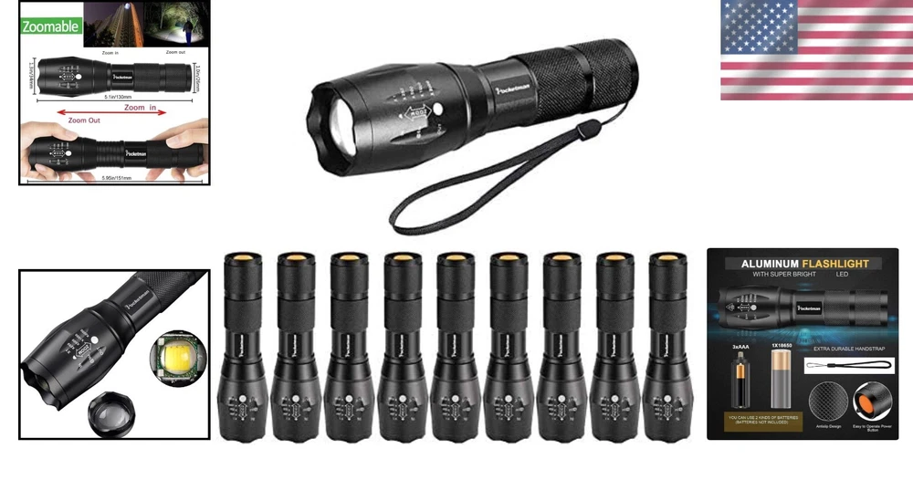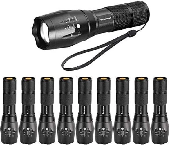 Power Source: Battery Number of Batteries: 1 Lumens: 2000 lumen Brightness: 2000 Lumen Operating Range: 200 m Item Length: LED Tactical Flashlight Battery Technology: AAA Features: Waterproof, Rechargeable, Handheld, Batteries Included, Adjustable, Durable, Portable, Skid-proof Number of Lights: 1 Item Height: LED Tactical Flashlight Light Source Type: Led Bulb Base: Gu5.3 Included Components: Battery Battery Type: Alkaline Item Weight: 19 grams IP Rating: IPX-5 Water Resistance Level: Water Resistant Personalize: No Operating Time: More Than 10 Hours Finish Types: Aluminum Style Name: Compact Brand: Unbranded Runtime: 50000 Hours Light Path Distance: 656 Feet Supported Battery Types: 18*65mm Or Aaa UPC: Does Not Apply Number of LEDs: Not Specified Color: 10 pack Package Dimensions: 14.02 X 12.01 X 2.36 Inches; 0.67 Ounces Material Type: Aluminum Voltage: 4.5 volts (dc) Special Feature: Adjustable,durable,portable White Brightness: 2000 Lumens Lighting Technology: LED Additional Features: Adjustable,durable,portable gtin13: Does Not Apply Type: Flashlight Material: Aluminum, Rubber
