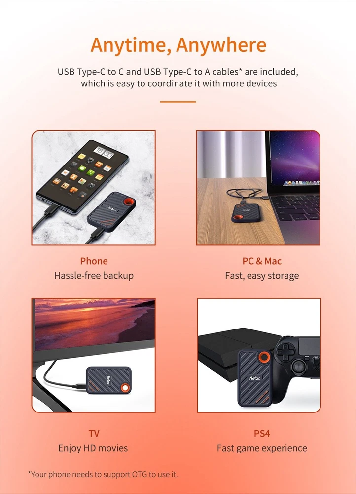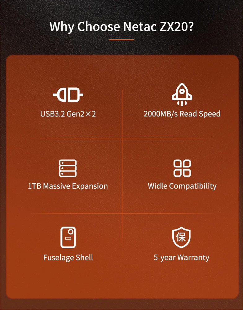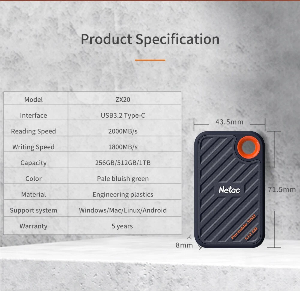 Christmas Black Friday Sale!!! Free 2 day Shipping! High Performance: With a USB 3.2 Gen 2x2 Type-C external interface and a PCIe internal interface, the Netac ZX20 Portable SSD has the read and write speeds up to 2000MB/s and 1700MB/s respectively, allowing you move files faster and edit right from the drive. Universal Compatibility: Netac ZX20 supports laptops, desktop computers, mobile devices and expansion of game consoles. In addition, the ZX20 also supports Win To Go, which can meet the dual system requirements of MacBook users without occupying computer hard disk. Aluminum alloy body, SSD External Drive, Shockproof & Waterproof & Drop Resistant. Lighter, stable and durable for recording 4k videos and storing pictures. Equipped with USB Type-C to C cable and USB Type-C to A cable in the package for working on PC or MAC computers. Netac provides a 3-year limited warranty. Kindly Reminder We recommend having back-up for reducing the chances of loss of data High speed, file transfer at speeds up to 2000MB/s and 1700MB/s A pocket-sized design Robust design Pefect for business travel, students, photographers, vlogger, content creators and gaming. The ZX20 is traveling light, and small pen drives like these are great for storing and transporting photos, music, important documents, and even data files and firmware upgrades. Keep your most important files with you at all times Steady for transferring a library of materials. Use it to house images, portfolio, and music Great for Business Travelling Portable-slim and sporty design Netac external SSD help you hold everything and more. Games are getting bigger and bigger so this is a simple solution. Making regular backups of your computer a priority will save you money and time in the event of an emergency. The Nvme Portable SSD read and write speeds up to 2000MB/s and 1700MB/s. Get NVMe Solid State Fast Transmission Speed Plug-and-play Ideal for transferring large-sized data including 4K videos, high-resolution photos, games and more. What You Get The pocket-sized drive A USB Type-C to C cable and a USB Type-C to A cable Welcome guide, 3-year limited, and friendly CS are included.