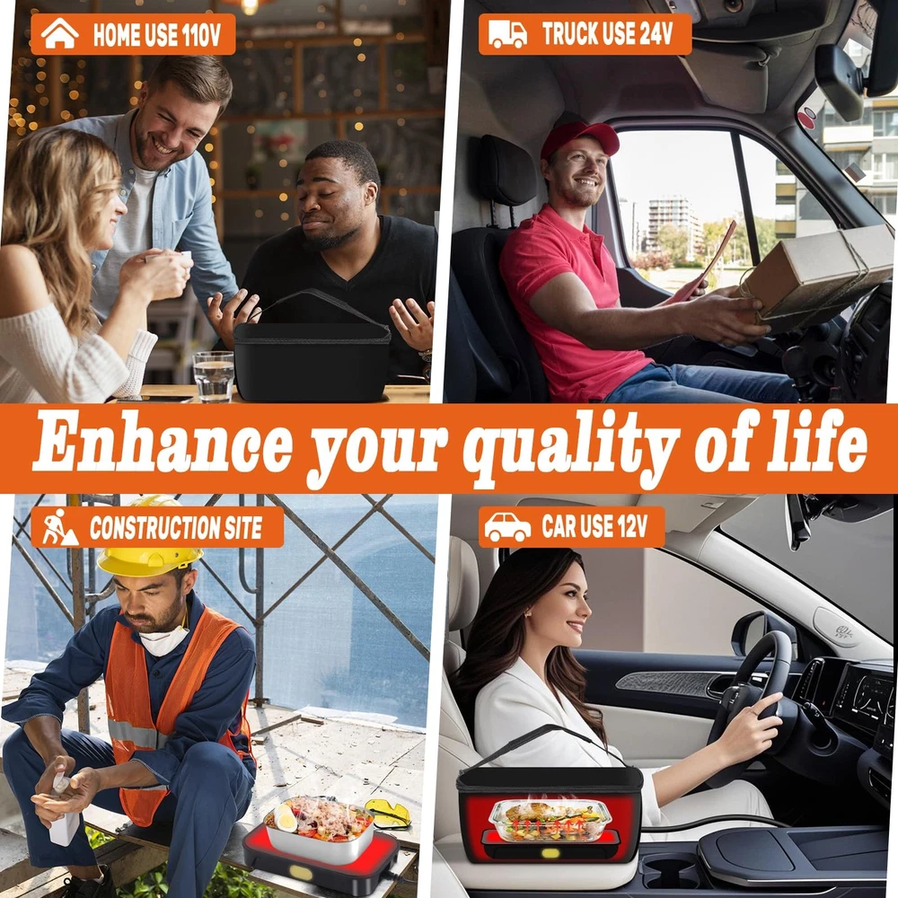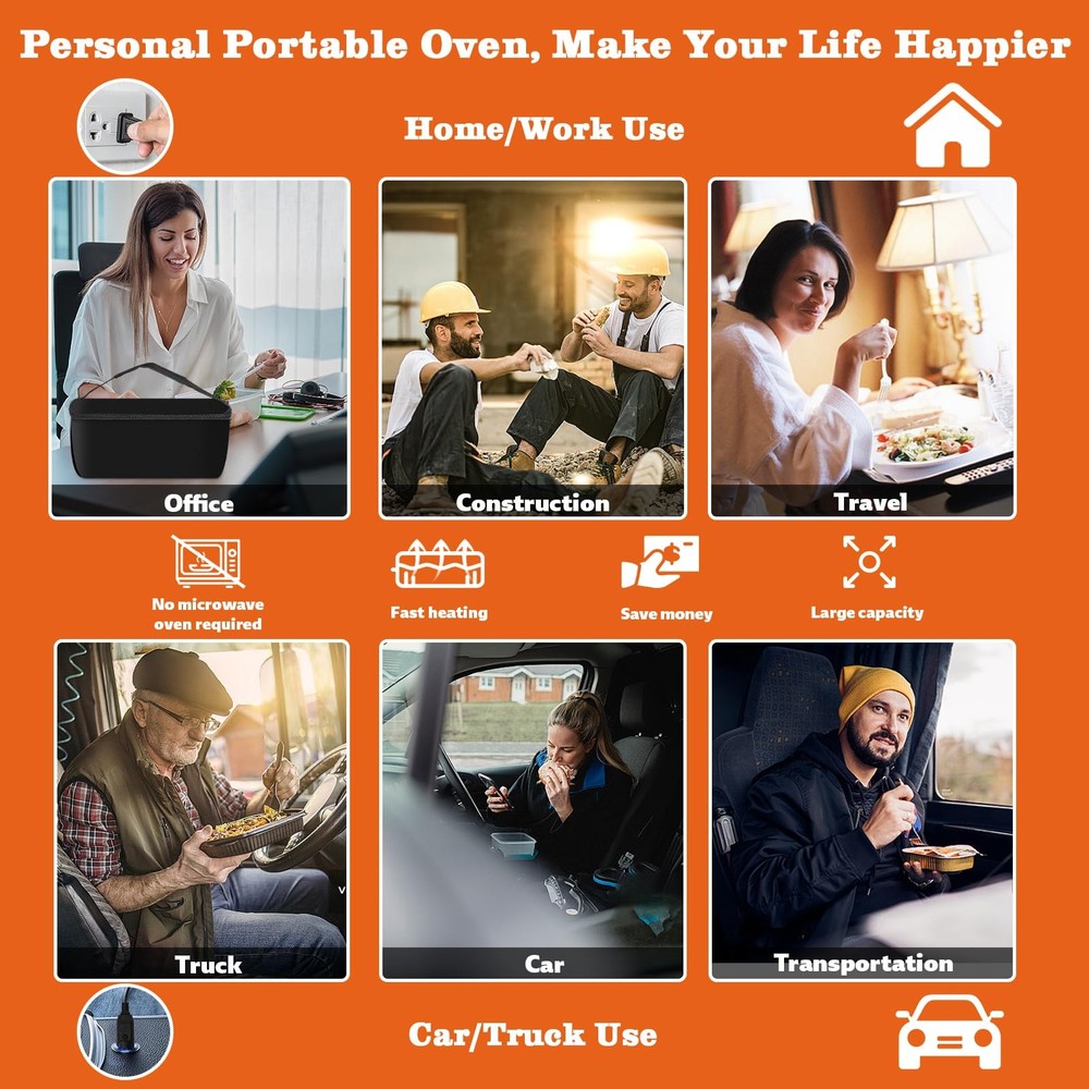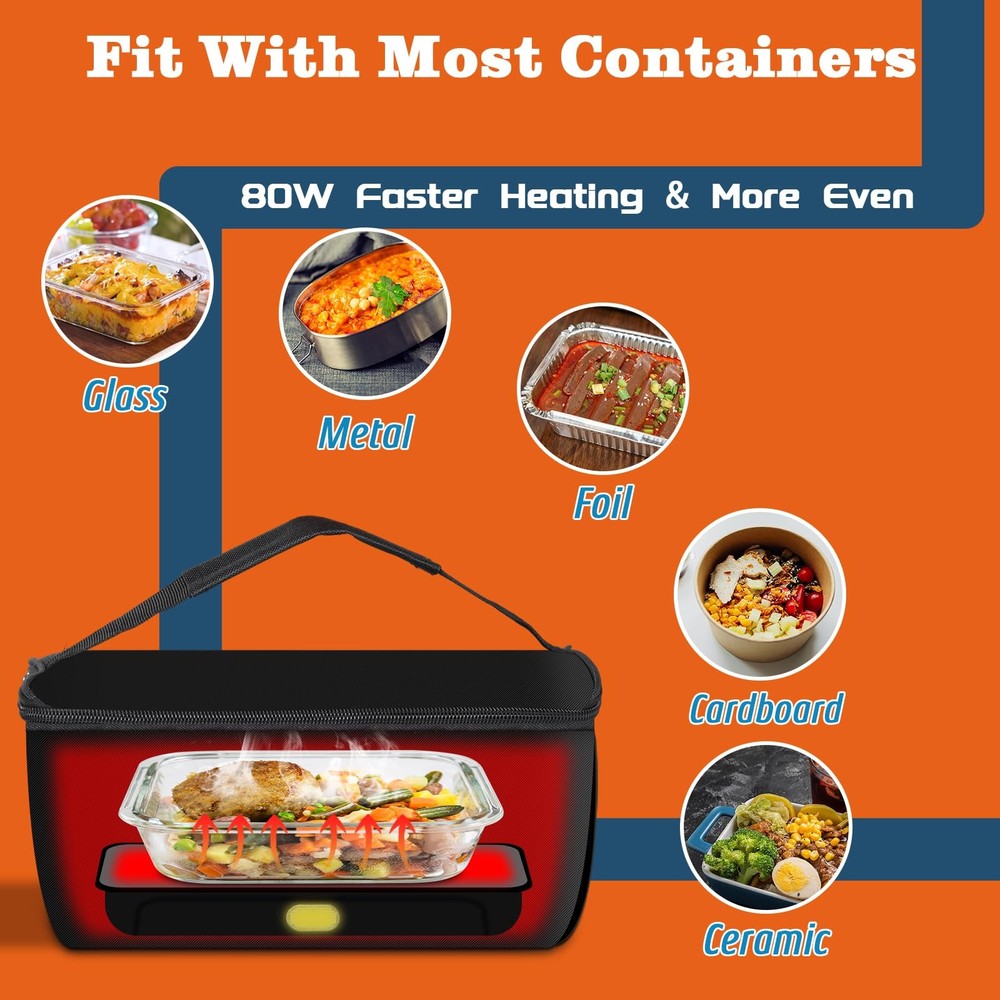 portable oven lunch box electric lunch box for adults , 12V, 24V, 110V food warmer, portable mini personal microwave heated lunch box warmer for cooking and reheating food in car, truck, travel, camping, work, home [3-In-1 Portable Microwave Oven] --- Wherever you are - at the office, in your car/truck, or on the move - enjoy piping-hot nutritious meals anytime. This compact microwave redefines mealtime convenience with its portable design, delivering home-style comfort wherever you dine. [Smart Heating Technology] --- Equipped with intelligent thermostatic heat transfer system, simply plug into 12V/24V/110V sockets for instant meal revival. Maintains freshly-cooked temperature and texture, ideal for office workers, long-haul drivers, construction crews and mobile professionals. [Lightweight & Hassle-Free Maintenance] --- Engineered for portability with a premium insulated carry case. Features odorless heating process and detachable components. After use, simply wipe clean with damp cloth - no complex cleaning routines required. [Multi-Container Compatibility] --- Supports heat-safe materials including glass, ceramic, stainless steel, aluminum foil trays, and rigid cardboard. Accommodates containers up to 9.84"L x 7.08"W x 4.13"H (1.8 quarts), ideal for family-sized meals. [Satisfactory After-Sales Service] --- The package includes one insulated bag, one heating plate,one instruction manual, two power cords. Due to the uncertainty of the transportation process, if you arrive with no heating or other problems, please contact us in time [HEARTWARMING GIFT IDEA] --- The ultimate lunchtime companion for working loved ones. This personal food warmer makes an exceptionally practical yet thoughtful gift for spouses, parents, or anyone who values warm homemade meals on busy days.