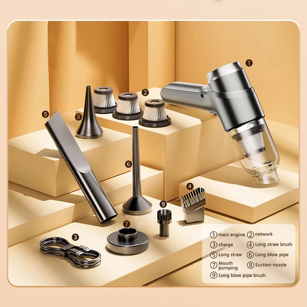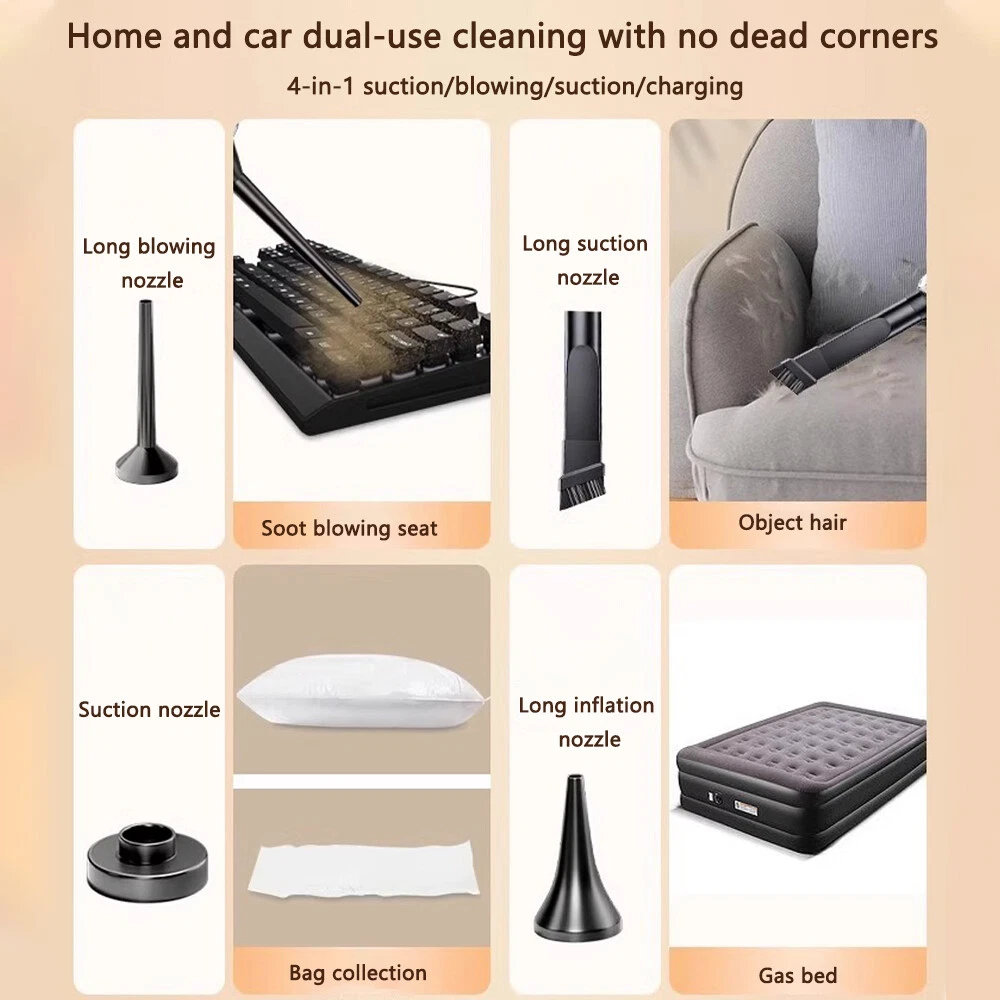 DESCRIPTION: Condition: 100% New Colour: As the picture shown Features: 1. The suction, blowing, and charging system features a lightweight and handheld design that comprehensively removes dust from all gaps and dead corners in the car. 2. Intelligent AI variable frequency motor, intelligent adjustment mode, prioritizes motor speed as power decreases, ensuring a increase in strong suction and endurance 3. Ultra durable battery, long-lasting battery life 4. Pure copper dual motor, brushless motor suction increased by 200% 5. New generation DC eight duct, intelligent noise reduction technology+acoustic Active noise control, more silent 6. Exquisite and compact, convenient for storage Introduction: 【 Product Material 】: ABS Vacuum degree: 5500PA Lithium battery capacity: 2 * 1500mAh 【 Charging method 】: USB charging cable Package List: As the picture shown NOTE: 1. Due to the hand measurement, there may have error measurement about 1-5mm. 2.Item color displayed in pictures may be showing slightly different on your computer monitor since monitors are not calibrated same. Your understanding will be highly appreciated. SHIPMENT: 1.Buyer take responsibility in import / tax cost (not included in item price) 2.Pls contact with us to confirm extra cost if you need to upgrade the shipping option 3.If there's any concern about shipping, pls contact with us for further confirmation RETRUN POLICY: -30 DAY MONEY BACK RETURN POLICY: 1. If you are unhappy with your item or changing of mind purchases for whatever reason, pls keep the item and package original. Buyer needs to afford the return postage. Besides, original postage will not return. 2. Please contact us within 30 days if you have a faulty item and we will cover the return postage where necessary, we do not cover this outside 30 days of purchase. -ADDRESS CHANGES: 1. If you enter the incorrect name or shipping details before purchasing, we will arrange shipment for you according to your ebay address. 2. We are not responsible for these changes if there is a mistake entered by the buyer. CONTACT US: 1. Our working time is from Beijing time 9:00am to 18:00pm on working days. 2. We hope to give you a good shopping experience. We will glad to help you solve problems once we receive your letter on working time. 3. If you have any questions or advice about the product you receive, pls contact us and send the pictures about the item firstly, we will check the issue for you ASAP and make you sastified.