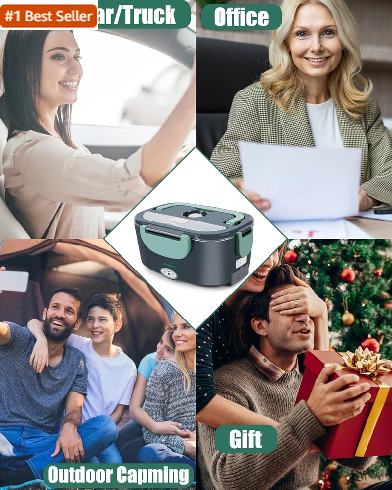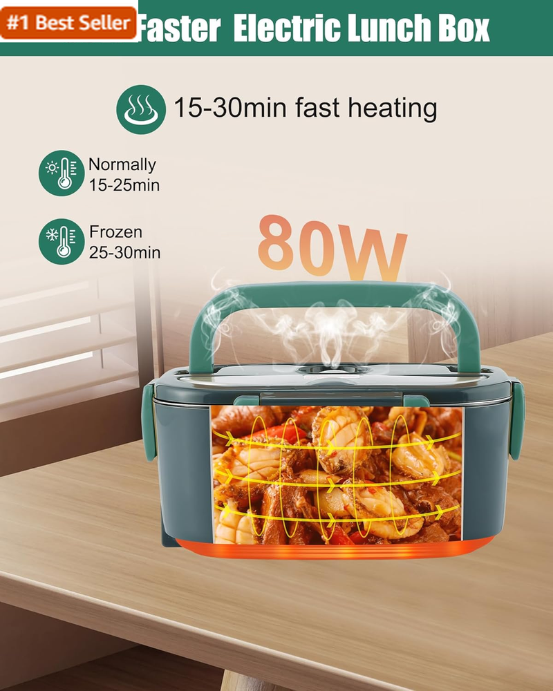 This lunch box is a game-changer! Heats food quickly and evenly, keeping it fresh and moist. The dual containers are spacious, and the included fork, spoon, and insulated bag make it super convenient. Perfect for work, travel, or on-the-go meals—no more cold lunches or fast food. The green color is stylish, and it’s energy-efficient too. Highly recommend!
