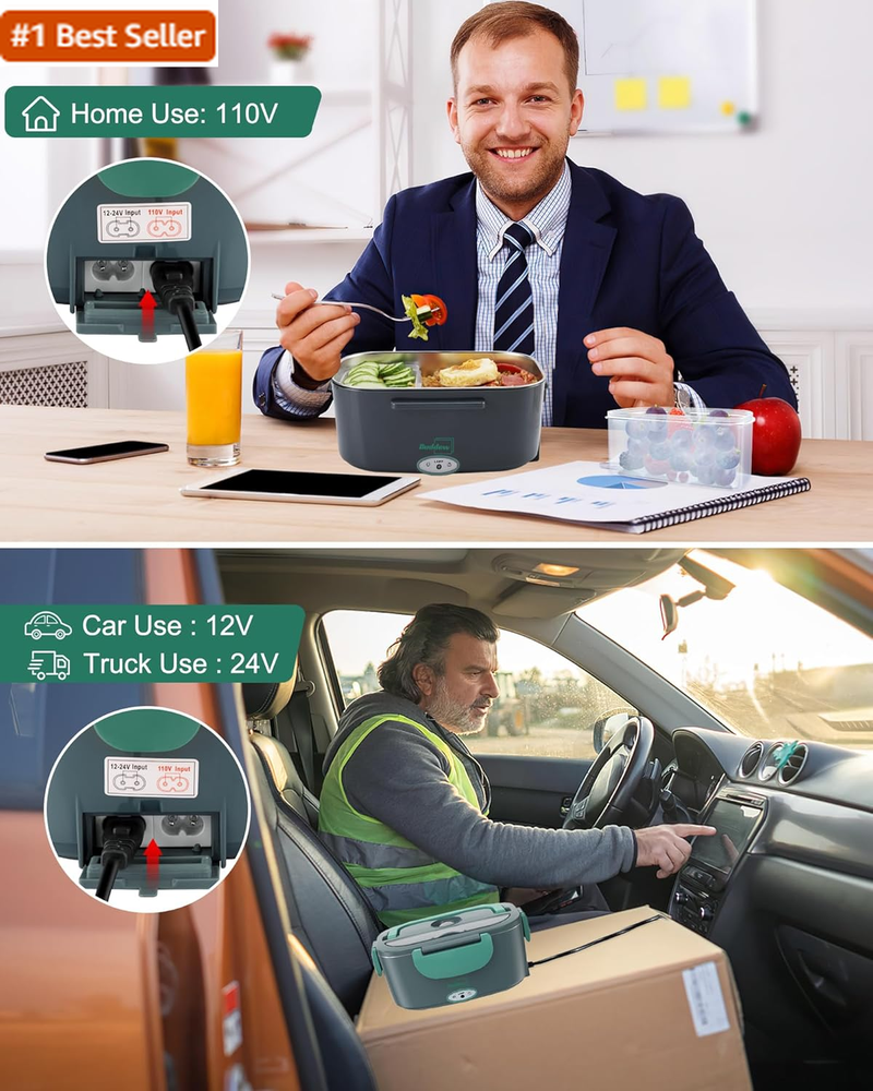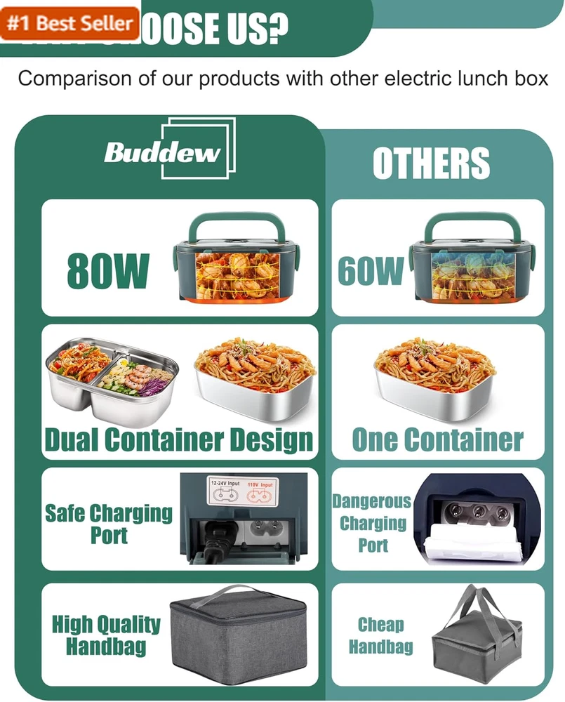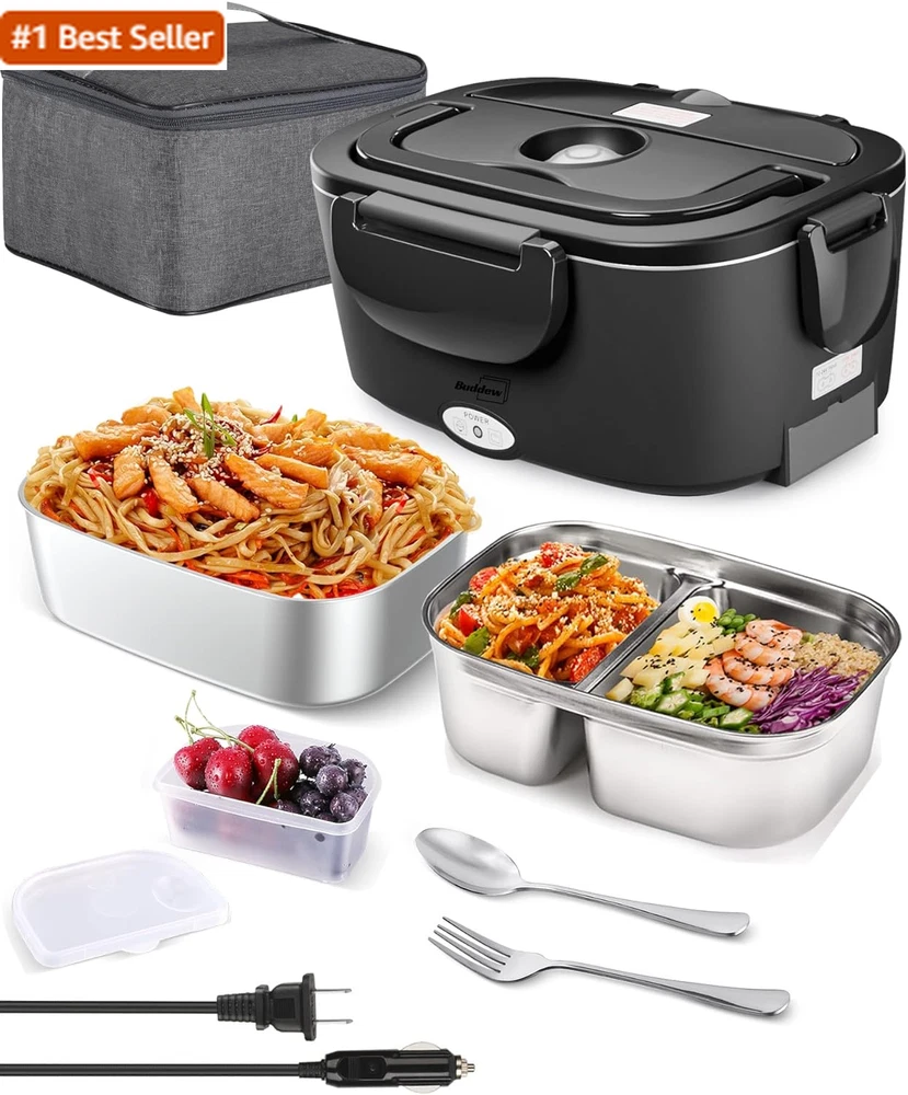 Buddew Electric Lunch Box 80W Food Heater with Dual Container, Portable Lunch Warmer for Adults, Upgraded Heated Lunch Box for Car/Truck/Office with SS Fork&Spoon and Insulated Carry Bag (Green) 80W Fast Heating --- It adopts the latest designed PTC constant temperature heating, and uses 80W high power.Low-consumption and high-efficiency thermal cycle, heating your lunch at the fastest speed, while maintaining the moisture and freshness of the food. No need to eat unhealthy sandwiches and fast food anymore. You can eat fresh and warm home-cooked food in the shortest time office, and construction site! A healthy way of eating Two Replacement Container Design --- This lunch box includes 2 additional 1.5L stainless steel containers for your convenience. You can choose a food container in one compartments or two compartments based on the different types of food. More user-friendly design Why choose Buddew Electric Lunch Box? --- Great alternative to cold sandwiches. That's the reason why I found this Electric lunch box so great and useful. It comes with everything and it is really practical: easy to use, comes with everything (spoon, fork, fruit box, two kinds of charging cables), the space for the portion of food is good (you can eat very well). It takes 20 to 25 minutes to heat up, depending on the food and portion size, but you can use this time to do other things 3-in-1 Electric Lunch Box --- Instead of eating unhealthy fast food and cold sandwiches every day, This electric heated lunch box supports 110V home/office +12V car and 24V truck use. car / trucker drivers can eat home cooked warm meal healthily on the go, construction worker and office workers can enjoy hot meal at construction site or in office Now Beloved is Happy He Eats Hot Meal Every Day --- Prepare a Buddew Electric Lunch Box for your husband/lover/father who likes to bring lunch to work, After alot of cold sandwiches he will fall in love with this electric lunch box. We also love the fact that you can also use it on the go, in your car, boat etc...Great product for the cost, The Perfect Choice for Gifts Grab-and-Go Carry Handle --- Each Buddew electric lunch box also features a strong carry handle on top that makes it easy to take with you in the car or place at your desk. The AC and car plug-ins also make it easy to warm up food anywhere.Coming with an insulated carry bag. Don't worry about heavy rain and dust, keep the food fresh and clean Provide You with Satisfactory After-Sales Service at Any Time --- Because the product may be subject to some uncontrollable factors during transportation. If you find that the lunch box cannot be heated or has any other issues after receiving it, feel free to contact us and we will provide you with the perfect solution. Contact us Product Description Car/Truck Use You can also enjoy warm and healthy home cooked dishes in the car. Home/Office Use By bringing homemade meals, savetime and money on dining out. Outdoor Use Enjoy a hot meal on the go Construction Site Hard work requires nutritious and healthy home cooked dishes even more! 1 Car/Truck Use 2 Home/Office Use 3 Outdoor Use 4 Construction Site 80W High Power We have increased the heating power so that you can heat up your lunch in a shorter time.while ensuring the freshness of the food. Two Replacement Container You can choose a food container in one compartments or two compartments based on the different types of food. More user-friendly design! 3 in 1 Car and Home Dual Use Buddew portable electric lunch box contains 2 plugs: 12V/24V for cars and 110V for household use, allowing you to eat hot food anytime, anywhere. High quality lunch Bag Equipped with a lunch bag, the quality is higher than ordinary lunch bags on the market. Easy to carry, waterproof and dustproof, sturdy and durable. Buddew's Various Series of Electric Lunch Boxes Add to Cart Add to Cart Customer Reviews 4.6 out of 5 stars 578 4.5 out of 5 stars 6,090 4.5 out of 5 stars 6,090 4.4 out of 5 stars 2,138 4.4 out of 5 stars 2,138 4.4 out of 5 stars 2,138 4.4 out of 5 stars 2,138 Price $24.57 $ 24 . 57 $20.57 $ 20 . 57 $25.47 $ 25 . 47 $19.99 $ 19 . 99 $20.95 $ 20 . 95 $20.95 $ 20 . 95 — Power 80W 80W 80W 70W 70W 70W 70W Capacity 1.5L*2 1.5L 1.5L 1.8L 1.8L 1.8L 1.8L Removable Container ✔ ✔ ✔ ✔ ✔ ✔ ✔ Widely Use ✔ ✔ ✔ ✔ ✔ ✔ ✔ Voltage 110V/12V/24V 110V/12V/24V 110V/12V/24V 110V/12V/24V 110V/12V/24V 110V/12V/24V 110V/12V/24V Advantage Two Replacement Container Affordable High Power Large Capacity Large Capacity Large Capacity Large Capacity Item model number YY-3066 Style Lunch box Capacity 1.5 Liters Number of Items 1 Pattern BUDDEW Theme Car Number of Pieces 2 Unit Count 1 Count Manufacture Year 2025 Number of Compartments 2 Brand Buddew Material Stainless Steel Age Range (Description) Adult Is Discontinued By Manufacturer No Included Components 1 x Electric Lunch Box, 1 x Socket Powering Cable(110V), 1 x Spoon and Fork, 1 x Vehicle Powering Cable(12V/24V), 2 x 1.5L Replacement Container Item Weight 2.61 Pounds Special Feature Manual Color GREEN-Dual Container1 Item Form Multi-compartment container Shape Car Manufacturer Buddew Product Dimensions 4.56"D x 8.86"W x 6.1"H Product Care Instructions Dishwasher Safe Shipping Fast shipping is very important for us. Our standard US shipping service is FREE. Your order will be shipped within 2-3 business days upon full payment received. Your order will be delivered within 2-3 business days after the handling time. We only ship to the confirmed PayPal address. We reserve the right to cancel any order for any reason at any time. We are not responsible for undeliverable addresses. Returns and payment We offer a 30 days return policy from checkout winning date. We allow only PayPal as payment method FeedBack Your feedback very important to us, after you get your package and you are satisfied with our service please leave us positive feedback If you have any problem with your order / any questions 