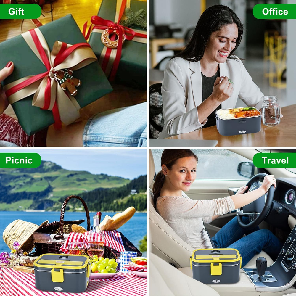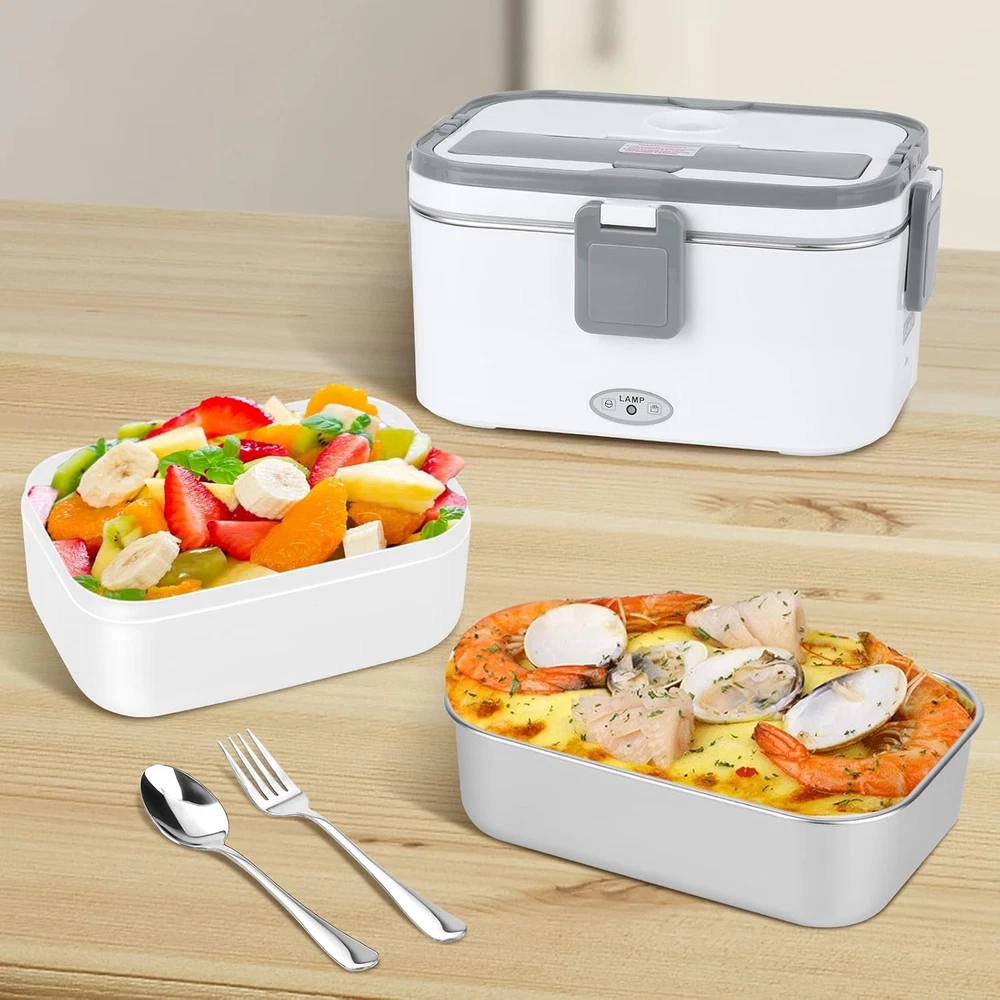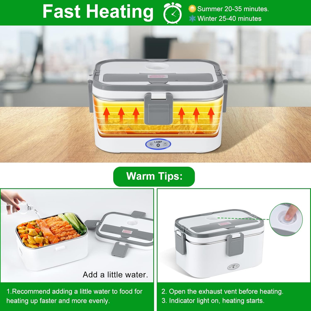 【3-in-1 Electric lunch box】Are you often busy and have to eat cold food? From now on, with our electric lunch box, you can enjoy hot meals anytime, anywhere! This electric heated lunch box supports 110V home/office + 12V car and 24V truck use. You will love this heated lunch box. 【80W Fast heating】Our electric heating lunch box uses an upgraded 80W power supply for heating, once plugged in, the heating lunch box will heat up in 20-30 min. This food heating lunch box is designed with circulating heat to keep your food nutritious and fresh. It not only heats your meals quickly, but is also easy to clean and dishwasher safe.This item is not suitable for children 12 years and under. 【1.8L Super large capacity】1.8L large capacity stainless steel container, you do not need to be hungry.Our food heater lunch box are perfect suited for you! What's more, we provide a 0.45L plastic compartment so you can place different kinds of food separately. There is a and fork on the lid, you can also use it as a cell phone stand to watch movies while eating. 【Leak proof design for you】In order to make the food warmer lunch box better sealed, we designed four sides snaps, plus the built-in rubber seal, you no longer have to worry about leakage of soup.Perfect for students, company office employees, construction workers, trucks and others who want to carry lunch by themselves. 【Warm & Healthy meals】Pls do not wash the electric lunch box as a whole into the water. The portable heated lunch box comes with a insulation bag, don't have to worry about heavy rain and dust, you can carry the lunchbox easily. If the food was taken out of the fridge,the heating time should be extended appropriately. If you have any questions about our electric lunch box, please contact us as soon as possible! Product Description UPGRADE LARGE CAPACITY PORTABLE ELECTRIC LUNCH BOX Say goodbye to greasy fast food, and enjoy fresh, heart-warming, and healthy food anytime, anywhere! The lunch box design can be separated independently, and various foods can be matched at will to achieve balanced nutrition! Enjoy fresh, heart-warming, and healthy food anytime, anywhere! -PRODUCTION SPECIFICATION- DC Power: 12V-60W 24V-80W ; AC Power: 60W/80W ; Voltage: 12-24V ; 110V 60Hz ; 220V 50Hz ; 110V 60Hz/12-24V ; 220V 50Hz/12-24V ; Material: 304 Stainless Steel, PP Material, Rubber ; Capacity: 1.8L for Lunch Box, 0.5L for Fruit Container ; Warm Tips: We recommend adding some stock or water to food before heating, making the food more evenly heated. Don't put lunch boxes in the refrigerator or microwave. Don't immerse the lunch box body in water. Don't add water to the lunch box heated base. Make sure to open the steam port before heating. Remember to unplug the power cord before eating. Any problems while using the lunch box,Please cont~act us. We will provide you the best solution. Please do not repair it by yourself. Home/Car Plugs There are 2 plugs on the portable food warmer, one is a 12/24V car adapter plug, and the other is a 110V/220V home adapter plug. Available anytime, anywhere! 304 Stainless Steel Container Made of food-grade stainless steel, you can use it with confidence. At the same time, it is very easy to clean, it can be rinsed directly in the faucet or put in the dishwasher! Portable Insulated Lunch Bag This lunch bag is lightweight and foldable, Sturdy and durable, easy to carry. Insulated aluminum foil makes the food fresh for hours, it's non-toxic and safe for your food, perfect to pack your foods and lunch containers.