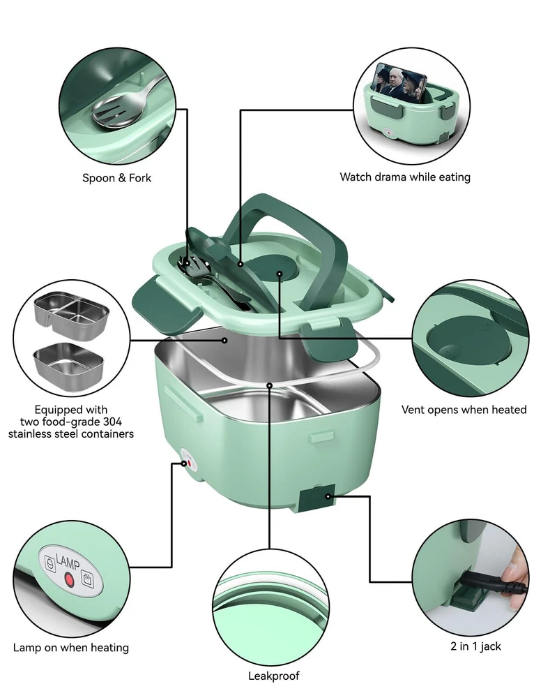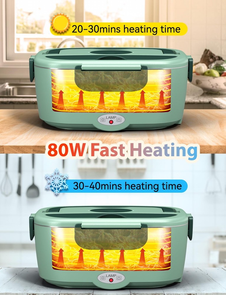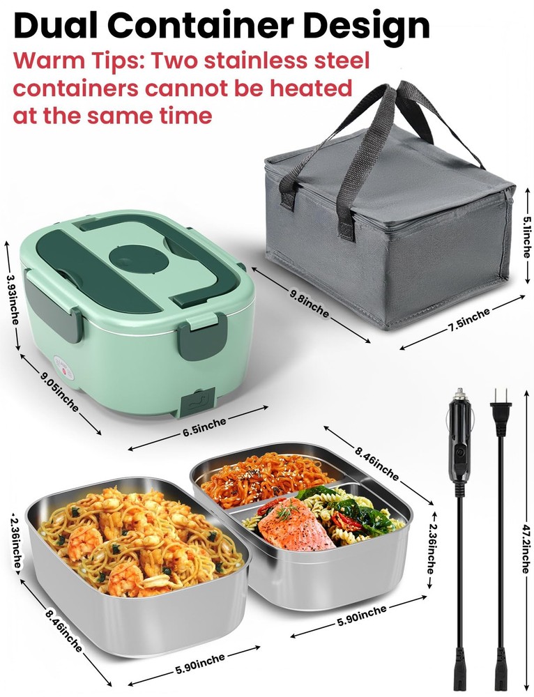 Are you still worried about going out for a cold meal? Are you still waiting in line for the microwave to heat up your meal? With this electric lunch box, you don't have to eat cold meals anymore, and you don't have to wait in long lines for those poor microwave ovens. You don’t have to worry about having no place to heat up meals outdoors far away from home, you can solve this problem in the car. This electric lunch box has a capacity of 1.5L, which can meet the appetite of an adult. At the same time, the package contains two stainless steel containers, which can be heated alternately, suitable for couples who are traveling or working outdoors. The power of 65W is enough for you to heat up the food in about 25-40 minutes. At different temperatures, the heating time is different, please pay attention. 3 IN 1 FOOD HEATER: Do you always have cold meals at work, in the car, or on the go? If so, then our portable heated lunch box is tailor-made for you. The electric lunch box can be heated in cars,trucks,work office and so on 80 W FAST HEATING: Our heated lunch box heats up fast and evenly, with a heating time of 20-40 minutes. It contains Two of 1.5 Liters removable 304 stainless steel containers, which can be used interchangeably. Good sealing, no leakage during driving FOOD GRADE MATERIAL: The food warmer is made of food-grade PP plastic and stainless steel. Do not use steel brushes to clean, it is recommended to use our foam brush. The containers can be washed in the dishwasher, But the heating base can't HEATING QUIET AND ODORLESS: There is no sound when The electric lunch box is heating, no water vapor is released, and there are no peculiar smells. It can be heated half an hour in advance before leaving work without affecting others PACKAGE INCLUDES: One heating base, two stainless steel containers, one insulation bag, one car power cord, one office power cord, one stainless steel spoon, one stainless steel fork, two foam brushes, one packing box, one instruction manual