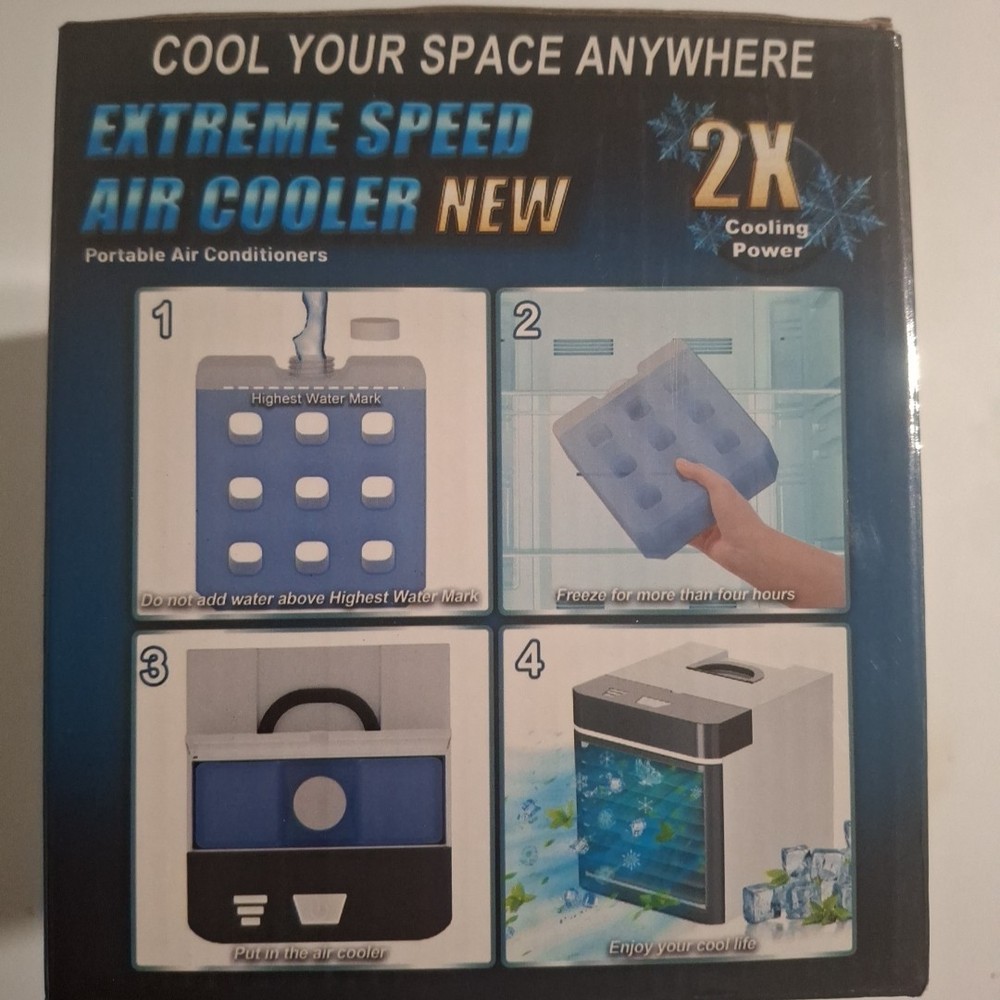 Compact personal air cooler designed for desks, bedrooms, offices, campers, and small spaces. Features 3 adjustable speeds and an anti-leak water tank for mess-free cooling. Easy to use, lightweight, and USB-powered for portability. FEATURES 3-speed airflow control Anti-leak water reservoir Cools, humidifies, and refreshes Quiet operation USB-powered Perfect for personal use in small areas ITEM SPECIFICS Type: Personal Mini Air Cooler Power Source: USB Speeds: 3 Tank: Anti-leak design Condition: New in Box Room Size: Personal/small area Functions: Cooling + humidifying