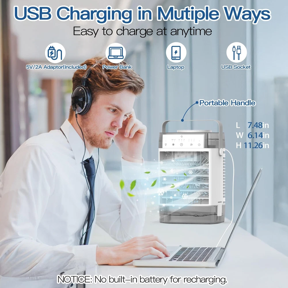 Upgrade Your Summer Comfort Today! Don't let the heat ruin your day—our cooling fan is your ultimate solution for staying cool, comfortable, and relaxed all season long. Whether you're at home, work, or outdoors, this portable air conditioner has you covered. Why You'll Love This Mini Air Conditioner: Instant cooling with mist and airflow options. Long-lasting performance with dual water tanks. Customizable lighting and timer for ultimate comfort. Quiet, energy-efficient, and easy to use. Portable design for home, work, or outdoor adventures. Stay Cool, Save Energy, and Enjoy Comfort Wherever You Go! 【3 Speeds & 2 Misting Levels】Beat the heat with our powerful 3-speed and 2-misting mode cooling fan! Whether you need a quick cool-down after a workout or a gentle mist while relaxing on the porch, this fan has got you covered. With adjustable wind direction (up or down to 60°), you can customize the airflow to your perfect comfort level. 【1000ml & 600ml Tank】Our portable cooling fan features a 1600ml dual water tank system. Fill the top tank with water and ice for 6-8 hours of evaporative cooling, while the detachable bottom tank collects condensate water. Plus, the low-water protection automatically switches to natural wind mode, so you never have to worry. 【7-Color Night Light & Timer Function】Create a cozy vibe with the 7-color night light—cycle through colors or or stays on your favorite hue. The 3-level timer (2-4-8 hours) ensures a comfortable sleep experience, so you can wake up refreshed and ready to take on the day. 【Low Noise & Energy Efficient】Operating at just 55dB, this personal cooling fan keeps you cool without disturbing your peace. With only 9W power consumption, it's energy-efficient and cost-effective—your perfect summer companion for a refreshing breeze. 【Control at Your Fingertips】Adjust all settings with the convenient remote control (up to 16.5ft away) or use the intuitive touchscreen on the fan. (Note: This is a fan with water mist for personal cooling. It's suitable for close range or small spaces to use. It provides a cooling sensation but does not cool your entire room.) 【Portable & Wide Application】Compact and lightweight design with a leather handle for easy carrying. Ideal for bedroom, kitchen, office, RV, and more. Includes a 5V/2A adapter + 4ft Type-C cable, making it easy to power via USB. The ultimate small cooling fan and a thoughtful gift for family and friends.