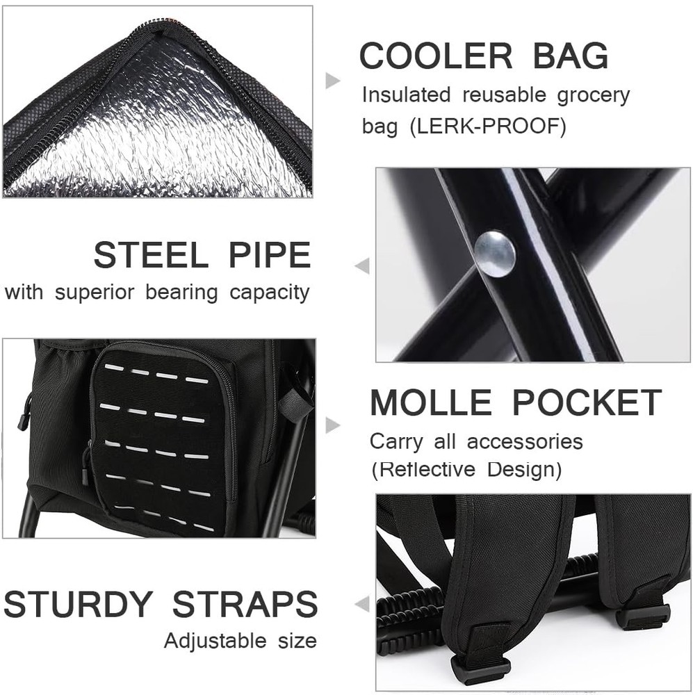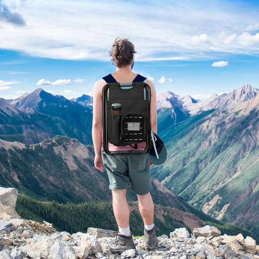 VERSATILE OUTDOORS CONVERTIBLE BACKPACK/STOOL Backpack Chair Material: The durable lightweight nylon is water-resistant and breathable, reinforced with a steel tube bracket securely fixed by rivets. Advantages: Lightweight、comfortable and easy to carry. Paired with a versatile molle pocket and well-insulated cooler bag. Backpack Cooler Chair Size: Chair Size: 18 inch x 11 inch x 10 inch. Folding Size: 21 inch x 13 inch. Insulated Cooler Bag Size: 12 inch x 10 inch x 6 inch. Front Molle Pocket Size: 8inch x 7 inch. Weight capacity: 400LBS. Applications: Outdoor recreational activities (fishing, hunting, hiking), watching sports events and performances (baseball games, Renaissance ceremonies), outdoor workers. MULTI-PURPOSE 3 IN 1 - Backpack, insulated cooler bag, and chair, perfect for camping, hunting, fishing, hiking, picnics, and more outdoor activities/watching sports events. The durable lightweight nylon is water-resistant and breathable, reinforced with a steel tube bracket securely fixed by rivets, can support up to 400 lbs and comfortable for sitting. LERK-PROOF COOLER BAG DESIGN - Our insulated bag has an aluminum foil insulation layer inside, and an upgraded reflective coating on the inner layer that can keep food and drinks warm for longer periods of time and effectively prevent leakage. American Flag Patch with Hook & Loop Backing, Attach to Military Tactical Gear, Jackets, Jeans, Vests, and More. LIGHTWEIGHT FOLDING CHAIR BACKPACK - Backpack stool folds up nicely to travel, pack, and store in the trunk of your car to take with you everywhere you need it. The two outer pockets are suitable for storing tea cups, water bottles, mobile phones, keys, and other items. We have designed a reflective bottom layer for the front molle position, making it convenient for you to use when walking at night. BACKPACK CHAIR SIZE - Chair Size: 18 inch x 11 inch x 10 inch. Folding Size: 21 inch x 13 inch. The backpack cooler chair has lightweight seat, breathable straps with wide shoulders for greater comfort. Ergonomic design also provides extra stability comfortable. IDEAL OUTDOOR GIFTS FOR MEN - If he is a outdoor enthusiasts who likes fishing, hunting, camping, hiking, this folding stool backpack will be perfect as a gift for him on Valentine's Day, birthday, anniversary, Father's Day or any other important holidays.