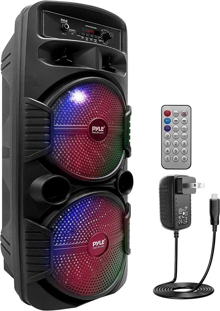600 WATT POWER: This high powered wireless karaoke PA portable bluetooth speaker is equipped with dual 8" subwoofer and 1" tweeter with 600 watt peak power / 300W RMS at 2.6 ohm for full range stereo sound reproduction and impressive bass response.Waterproof : No COMPATIBLE WITH BLUETOOTH: The box type loud bluetooth speaker system is compatible with bluetooth for wireless audio streaming and works with devices like iPhone, android mobile phone, iPad, tablet, PC. Ideal for personal indoor home and outdoor use 3 INPUTS: Pyle bluetooth speaker karaoke PA system is equipped with a USB flash drive reader so it can serve as an MP3 player, a 3.5mm AUX input for connecting external devices & a 1/4” mic / guitar input. Equipped with FM radio with digital LED display FLASHING DJ LIGHTS: The bluetooth party speaker with lights features multi-color flashing disco LED party lights. True wireless stereo system adds life to any occasion, great for patio parties & night gatherings when colorful presence is noticeable RECHARGEABLE BATTERY: This Pyle PA speaker is great for karaoke, stage performances & crowd control. It is fully portable, thanks to its built-in rechargeable battery with level indicator lights, and extending carry handle so you can take it anywhere Features: - True Wireless Stereo System - Portable Speaker System - High-Powered PA Loud Speaker Style - Bluetooth Wireless Music Streaming Ability - Multi-Color Flashing LED Party Lights - Built-in Rechargeable Battery - FM Radio with Digital LED Display - Connect & Stream Audio from External Devices - Aux (3.5mm) Input Connector Jack - USB Flash Memory Reader - 6.5mm Microphone input - Battery Level LED Indicator Lights - Rugged & Durable Molded Cabinet Design - Convenient Extendable Carry Handle - For Indoor / Outdoor Use Bluetooth Wireless Streaming: - Built-in Bluetooth for Wireless Music Streaming - Simple & Hassle-Free Pairing - Works with All of Today’s Latest Devices - Smartphones, Tablets, Laptops, Computers, etc. - Bluetooth Version: 4.1 - Bluetooth Network Name: ‘PYLEUSA’ - Wireless Range: Up to 32’ ft. What's in the Box: - PA Speaker System - Remote Control - Power Adapter Technical Specs: - Material: Polypropylene (PP) - Max Power Output: 600 Watt Max - Sound System: 8’’ -inch Subwoofer x2 + 1” Tweeter - Impedance: 2.6 Ohm - USB Interface Type: 2.0 - Digital Audio File Support: MP3 - Maximum USB Flash Support: 32GB - Remote Control Battery Operated, 1 Piece Button Cell Battery CR-2025 (Included) - Battery Life: Up to 3 Hours (Charge Time: Approx. 4.5 Hours) - Rechargeable Battery: 3.7V, 2400mAh – 8.88 Wh - Power Supply: 120/240V, Switchable (5V/2A Power Adapter) - Dimensions (L x W x H): 9.1’’ x 8.7’’ x 23.2’’ -inches.