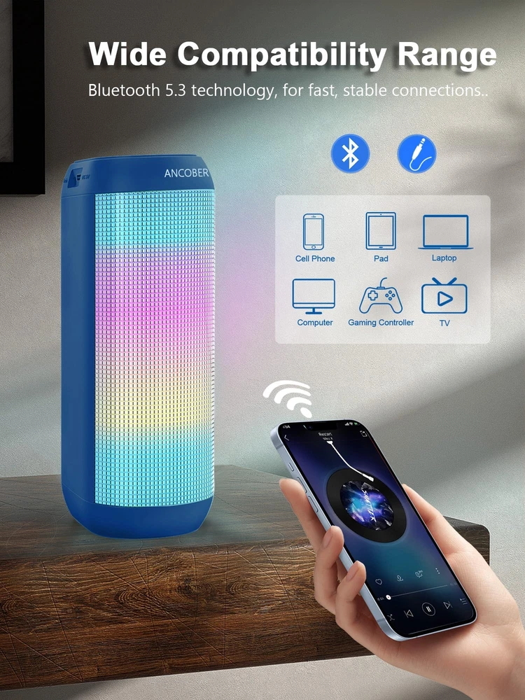 Bluetooth Speaker, Portable Wireless HD Stereo Sound with Cool Lights, IPX4 Waterproof, USB Rechargeable,TWS Pairing, for Party Outdoor Camping Travel Electronics Gadgets,Him Her Dad Boy Teens Gifts Crystal Clear Stereo Sound : Immerse yourself in the high-quality audio of the ANCOBER Bluetooth speaker, delivering crisp and crystal clear stereo sound for an enhanced listening experience. Compact and Portable Speaker : Designed for on-the-go convenience, the ANCOBER wireless speaker is compact and easy to carry, making it perfect for outdoor adventures, parties, or travel. Cool Dazzling Colorful Light Show : ANCOBER Bluetooth speakers are uniquely stylish and have a cool light design, you can enjoy multiple lighting modes that add a vibrant touch to your music listening sessions, creating a dynamic and visually appealing atmosphere for any party or gathering. Long Battery Life : With up to 12 hours of playtime at medium volume with lights off mode, this wireless portable speaker ensures uninterrupted entertainment wherever you go. Wide Compatibility : Benefit from the advanced Bluetooth 5.3 technology, offering wide compatibility and stable connectivity, easy to compatible with iPhone, Samsung, etc., for seamless pairing with your devices such as cell phones, computers, laptops, TVs, tablets, game consoles, projectors, and more. TWS Stereo Pairing : Experience immersive surround sound with True Wireless Stereo (TWS) pairing, creating a dual-channel surround sound effect by connecting two speakers for a more engaging audio experience. USB C Rechargeable : Stay powered up with the convenience of USB C charging, allowing you to quickly and efficiently charge this wireless speaker. (Full charge time: 4 hours) Built-in Microphone for Calls : Take hands-free calls with the built-in microphone, allowing you to stay connected while on the move by this wireless Bluetooth speaker whether you're cooking, working or playing. IPX4 Waterproof : Built to withstand splashes and light rain, the IPX4 waterproof rating ensures the speaker remains protected in outdoor or shower environments. Perfect Gift : With its impressive features and stylish design, the ANCOBER Wireless Portable Bluetooth speaker makes for a ideal gift for music and outdoor lovers, him, her, and teens on holidays, birthdays, or any special occasion. SHIPPING Domestic Buyers - We have confidence in our products, but if you are not fully satisfied please contact us within 30 days of purchase and you will get full refund. - We ship within 3 business days of payment, usually sooner - We offer FREE shipping on all orders! - We only ship to the lower 48 states, no APO/FPO addresses or PO Boxes allowed International buyers – please note: Import duties, taxes, and charges aren't included in the item price or postage cost. These charges are the buyer's responsibility. - Please check with your country's customs office to determine what these additional costs will be prior to bidding or buying. * Order Cancellation Policy ** You can return a product for up to 30 days from the date you purchased it. 1. The seller reserves the right to cancel the special case only due to eBay cancellation fee. 2. The decision of seller is the final. 3. The seller will respond to the cancellation request within 2 business days. Please wait for the result of cancellation. 4. In case the cancellation is not completed by some reasons, the buyer can follow the options below to get the refund. 4.1 The buyer can reject the item when it arrives. 4.2 The buyer can send the item back to the seller within 30 days If the buyer receives item (USA Shipment ONLY). The seller will provide the FREE return label to the buyer when the buyer opens " Return Item" case on eBay by using the reason as "Change my mind" ONLY. 5. When buyer has placed the order. The order will be processed and completed by automatic warehouse system within 5 minutes. In case that buyer sends the cancellation request after 5 minutes of placing the order, the request will be rejected. **Sending direct message to cancel the order is not allowed for every case.* Return Policy For the return case - If buyer would like to return the items for refund or replacement, please CONTACT SELLER to receive the free return label from seller. The refund or replacement will be processed with the tracking number of return label which is provided by seller only. The other ways of return which are not approved by seller will not be processed for the refund or replacement.