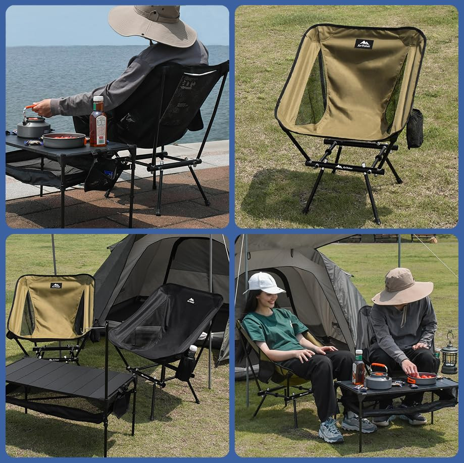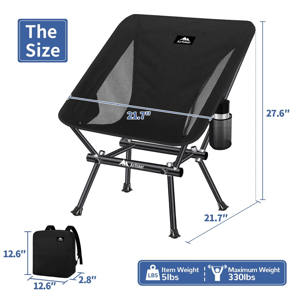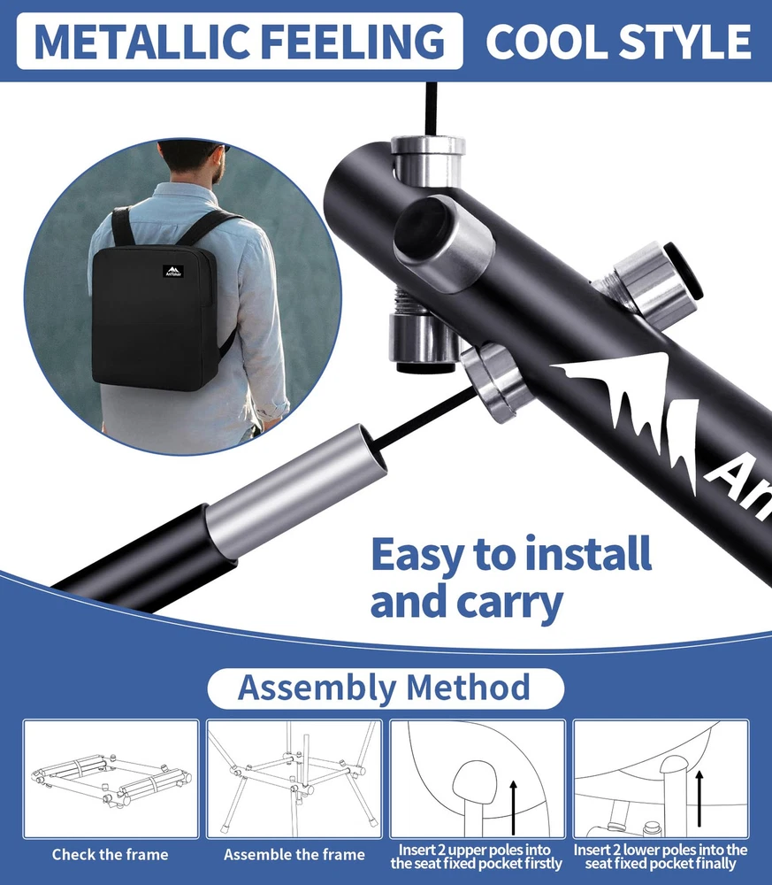 1.【Stronger Stability】: Say goodbye to unstable camping chairs. For ultimate stability, we've designed our camping chair with a square structure and four supporting points. Even better, this robust portable camping chair has a load capacity of up to 330 lbs. 2.【Unique Design】: Exclusively designed by a designer with 30 years of outdoor chair design experience, our chair offers enhanced stability and durability while ensuring a comfortable and compact use experience. We have replaced common plastic components with pure aluminum nuts in the core link section, giving the chair a unique metallic appearance and making it sturdier and more durable. The bracket is made of alloy steel, which is hard and has excellent toughness, providing a sitting experience as comfortable and reassuring as a trampoline. 3.【Practical】: The snug seat and headrest ensure support and relaxing comfort for hours. Also included are three pockets: one back magazine pocket, one side pocket, and one drink holder.These pockets allow you to easily access frequently used small items while using the chair. Additionally, when not in use, you can place your water bottle in the drink holder instead of carrying it at all times. 4.【Complimentary Backpack】: Our backpack can not only hold chairs but also accommodate towels, magazines, and other supplies. It can be used as a separate computer bag or an outdoor camping bag, freeing up your hands for daily activities such as school, cycling, camping, shopping, work, and travel. 5.【Easy Setup & Cleaning】: Setup has never been easier, thanks to the foldable Oxford cloth and metal poles.Simply take out the frame, assemble it by following the elastic connection cords, and then attach the fabric. It's also easy to clean.No handyman skills are required! Just wipe with a damp cloth or soapy water, and you’re good to go. 6.【Super Comfortable】: The upgraded square structure is far more stable than the older models on the market. An ergonomic seat provides an exceptional experience with excellent wrapping and back support. Breathable side mesh panels enhance airflow and help keep you cool. 7.【Global Patent Protection】: Our chairs have design patents in the United States, Europe and Japan. 8.Note: After assembly, please tighten the nuts to stabilize the chair. If you have any questions about the product, please contact us by email, and we will resolve the issue as soon as possible. To keep the chair compact and portable, it requires assembly each time you use it. If this is a concern for you, please purchase with caution.