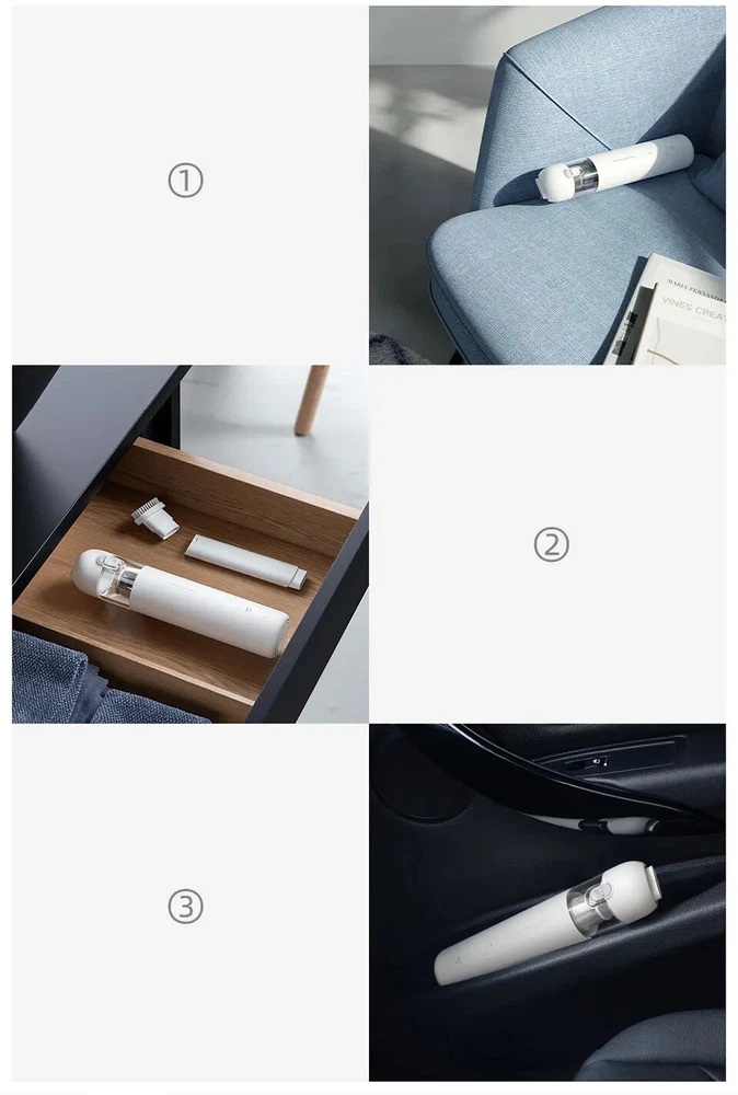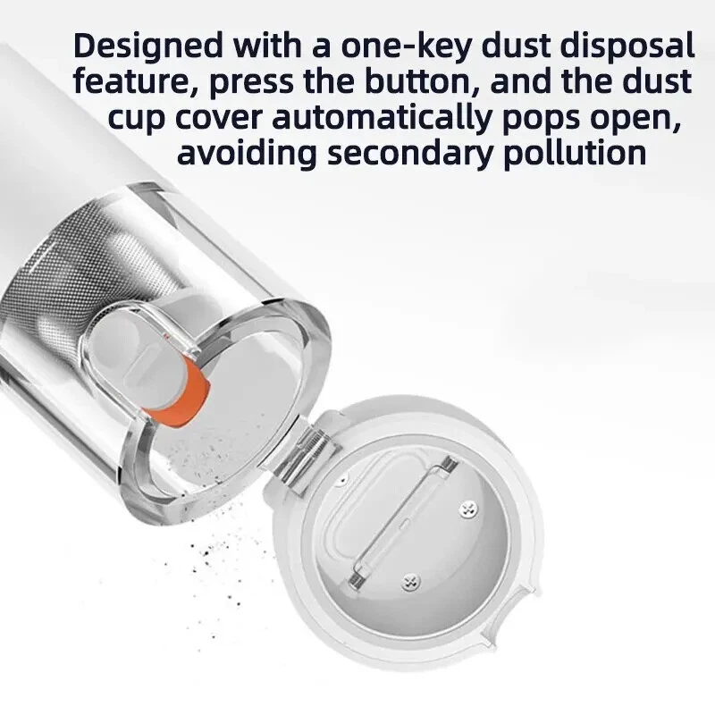• High Suction Power : With a suction power of 13000Pa, this vacuum cleaner can easily remove dust and dirt from your car or home. • Wireless Operation : The wireless design of this vacuum cleaner makes it easy to use and maneuver, allowing you to clean hard-to-reach areas. • Cyclone Suction : The cyclone suction feature ensures that the vacuum cleaner can effectively remove dust and dirt from all surfaces, including carpets and upholstery. • Lightweight and Portable : Weighing only a few kilograms, this vacuum cleaner is easy to carry and store, making it perfect for use at home or on the go. User Instructions: Charging: 1.For the initial use or after prolonged storage, please fully charge the product first. 2.It is recommended to charge every 3 months. 3.Please use a 5V/2A power adapter (to be purchased separately) and the original Type-C charging cable for charging. Nozzle Installation: Select the appropriate nozzle and install it into the nozzle mounting port. Tip: Both nozzles can be used individually or combined. Power On/Off / Mode Switching: Press the power button briefly to cycle through the following modes: Power On (default low speed), high speed, power off. Notice: 1.Avoid charging, using, or storing the product in high-temperature conditions. When placed in a car, avoid direct sunlight, as it may cause overheating, ignition, or explosion. 2.It is recommended to use the product in environments ranging from 0°C to 40°C. Outside this temperature range, the battery may not function properly. 3.Do not use the product to suction any liquids (such as water, cola, etc.). 4.Do not use the product to suction any burning or smoking objects (such as unextinguished cigarette butts). 5.Do not use the product to suction hard or sharp objects (such as construction debris, glass, nails, etc.). Portable car vacuum cleaner Attention to Detail, Clean Up Easily Dual-Use for Cars and Homes, Powerful Suction, Brushless Motor, One-Touch Dust Emptying Slimmer than a Thermos Flask Home Dust Removal, One-Touch Clean Living Free yourself from the constraints of cords for more flexible cleaning. Even dirty and cluttered corners can be easily dusted, allowing you to enjoy a cleaner life. Cleaning Inside the Car, Tidying Up Small Messes In smog and dusty weather, the interior of the car is prone to accumulating dust. With a quick and convenient vacuum, even the finest dust and debris have nowhere to hide. *Strictly prohibited to be placed in direct sunlight. It is not recommended to leave the Xiaomi handheld vacuum cleaner in the car during high temperatures in summer to avoid potential hazards. Brushless motor for powerful performance, dual air passage for efficient cleaning. Equipped with a high-performance brushless motor and an internal straight-through dual air passage design, effectively reducing energy consumption and improving cleaning efficiency. Equipped with a high-speed start-stop function to prevent dust from remaining at the nozzle when the device is turned off. 2 Gears of Suction Power, 30-Minute Long Battery Life Low Gear Battery Life: 30 minutes* High Gear Battery Life: 9 minutes* Innovative Combination Brush Heads for Easy Dust Removal in Various Scenarios Crevice Dusting Flexibly clean hard-to-reach crevices and corners. Keyboard Cleaning Effortlessly remove hidden dust beneath the keycaps. Car Interior Cleaning Instantly sweep away long-hidden fine dust. Compact in size, it doesn't take up space for storage. ① Sofa placement; ②Drawer storage; ③ In-car storage One-key dust disposal, convenient and hands-free. Designed with a one-key dust disposal feature, press the button, and the dust cup cover automatically pops open, avoiding secondary pollution. ①Button lock design to prevent accidental opening of the cup cover. The button lock design allows you to slide down to unlock when dumping the dust, and then simply press the button to open it. ②The initial filter steel mesh is detachable, separating large particles of dust. ③Built-in high-standard filter core.The whole machine has a filtration efficiency of >99.5%. The double filtration system of the initial filter steel mesh and high-standard filter core ensures that vacuuming doesn't create more dust and is not afraid of tiny dust particles. Craftsmanship, quality originates from details. ①Compatible with a Type-C interface, it can be used with mobile phone and mobile power data cables. ②ABS hard dust cover.Closes tightly, effectively preventing dust from leaking. ③The pointed cup lock prevents accidental opening, securely locking the cup cover and preventing accidental opening. ④The dust collection cup assembly is detachable and washable, reducing consumables and extending the product's lifespan. Specifications: Product Name: Handheld Vacuum Cleaner Product Weight: Approximately 0.5kg Rated Power: 120W Product Dimensions: 267 × 55 × 55mm Rated Voltage: 10.8V Package Information: ①Main Unit ×1 ②Crevice Nozzle × 1 ③Brush Nozzle x1 ④ Type-C Charging Cable × 1 ⑤User Manual ×1
