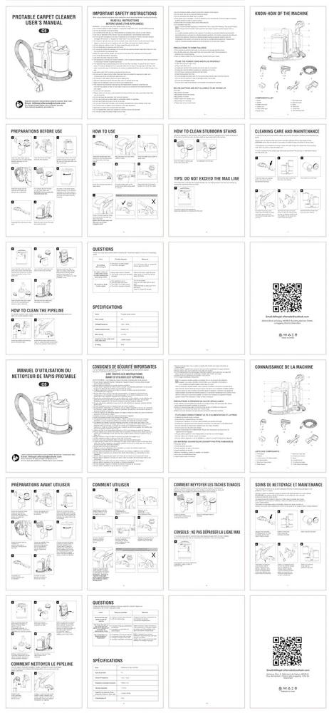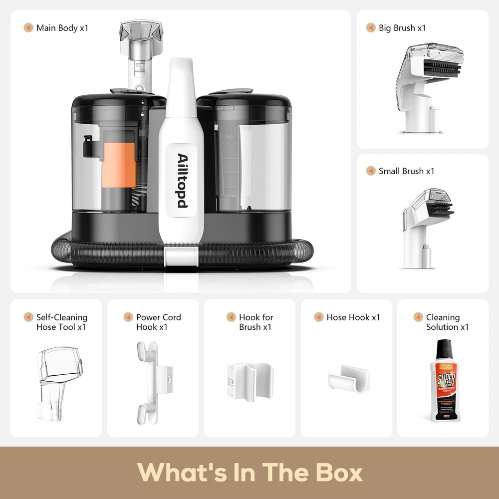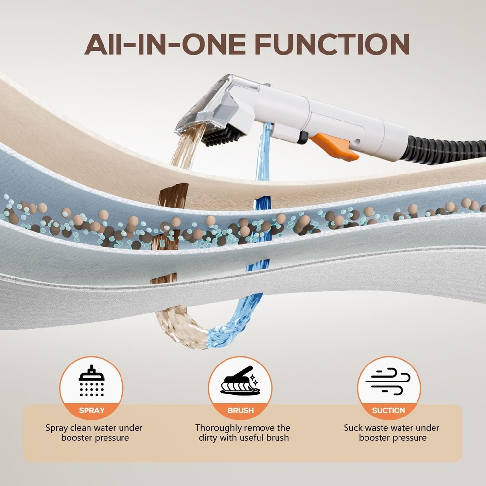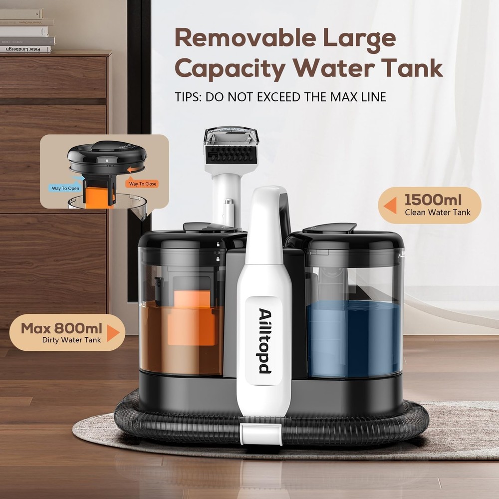 Carpet & Upholstery Spot Cleaner 【SUPER LARGE DUAL TANKS】: The Dual Tank System has a large water tank capacity of 0.8L sewage tank and 1.5L clean water tank,respectively,so you can achieve longer uninterrupted cleaning time by separating clean water from dirty water.and the clean water tank can be added our equipped agent and sprayed evenly on the carpet or pad to ensure better cleaning results(Tips: Do not exceed the MAX line of the water tank, as it may cause the machine to have no suction) 【NEW UPGRADE POWERFUL SUCTION】:The Portable Carpet & Upholstery Spot Cleaner is equipped with a 500W motor, which can provide a super suction force of 15Kpa,and you can easily and quickly clean stubborn stains such as dirt, wine, pet feces, etc. on carpets and indoor decorations through spraying, brushing, and suction steps, ensuring that carpets dry quickly after cleaning and quickly return to normal, making your home environment healthier and safer. 【EASY STORAGE & SPACE EFFICIENT】: Its compact size can be stored under a sink or in a closet, without occupying too much home space.and the wires and hoses can be easily stored on the bracket of the cleaning machine.The brush can be stored on the machine's dual brush hook. Don't take up space in the home. 【WIDE APPLICATION RANGE】: The carpet cleaner machine is for fabric cleaning, and cleans most fabric products that cannot be cleaned as a whole, such as sofa, mattresses,car seat,and other difficult to clean items,and is equipped with two sizes of brush heads, which can be used for different areas of stains and can perfectly handle leaks and accidents for you. 【LONGER REACH FOR LARGER CLEANING】: The upholstery cleaner machine with an ultra long hose (4.26ft) and power cord (16.4ft) and the carpet cleaner is lightweight and easy to move from one cleaning job to the next. Please carefully read the instruction manual for specific operating steps. Jump to more product details