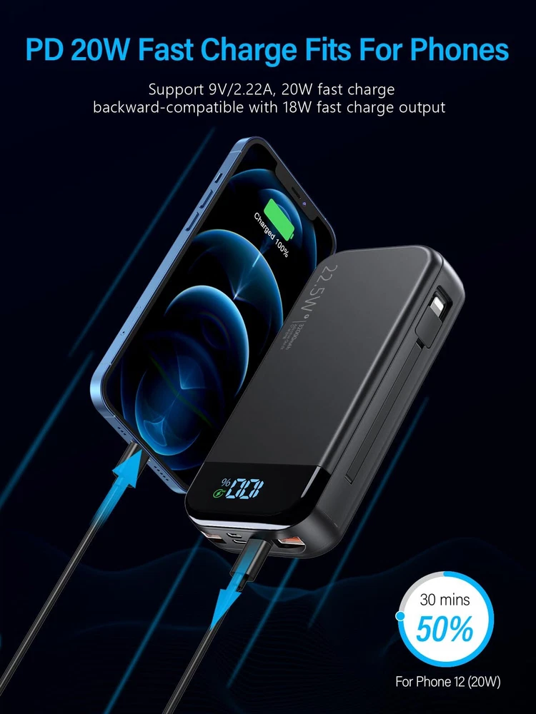 Battery Pack with LED Display: 32000mAh Li-polymer can 8 charges for typical iPhone, 6 charges for Samsung Galaxy, 3 charges for iPad Mini, perfect for a business trip or on the go, you don't have to worry about your phone low battery; Power bank built in cable with LED display shows the remaining battery, and the low power remind will let you know when need be recharged. Portable Charger with Built in Cables: The integrated cables with grooves are convenient for storage, more than 10,000 bending tests prove its durability, tear-resistant, bend-resistant; suitable for most smartphones, or other devices, no worry about the cables when going out. PD 20W Quick Recharging: Micro input, iOS input, Type-C (PD 20W) input & output support bidirectional quick speed charge for most mainstream devices including earphones, mobile phones, smartwatches. Fully recharge this portable charger power bank only need 6.5 hours with a PD 20W charger, which will help you save more time. Power Bank Fast Charging: 2 USB-A QC 22.5W output and 1 Type-C PD 20W output, which only takes 30 mins to charge for iPhone 14 up to 50% and 40 mins to charge for Samsung S20 up to 65% by the original mobile phone charging cable, it greatly shortens your charging time; And you can charge 5 devices simultaneously, perfect for sharing them with your family and friends. (Note: If not charged with the original cable, the charging speed will be twice as slow ) Comfortable and Safe Design: The Ergonomic design fits comfortably and stylish in your palm; besides, the rechargeable power bank is equipped with multiple safety protection including overcharge, overheat, short circuit, etc; which improve your safety and prolong battery life; It weighs less than a 500ml bottle of water, a little heavy but great choice for camping, traveling, hiking or other outdoor activities. What You Get: 1 * 32000mAh power bank, 1 * Type-C fast charging cable, 1 * User Manual. (Reminder: The battery bank is NOT TSA compliant )