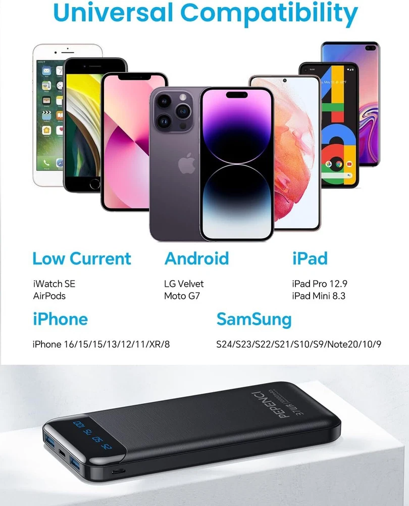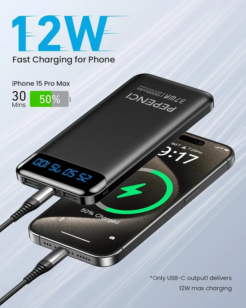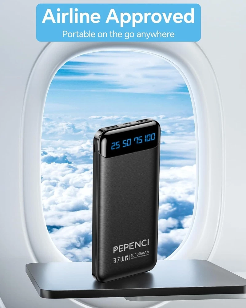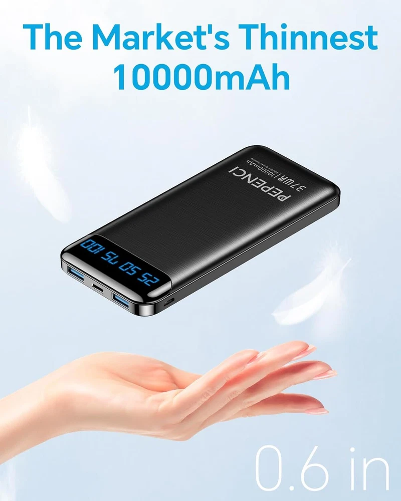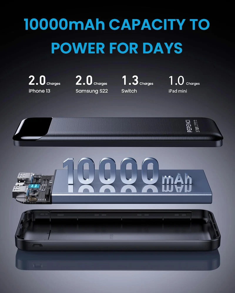 Portable Charger Power Bank 10000mah USB C in&Out, Cell Black Product Details Product Dimensions: 5.55 x 2.63 x 0.59 inches Item Weight: 8.4 ounces Item model number: PB-001 Batteries: 1 Lithium Polymer batteries required. (included) Special features: Digital Display, LED Indicator Lights, Slim, Fast Charging, Pocket Size Other display features: Wireless Color: Black Manufacturer: Pepenci Connector Type: Output: USB-C*1+USB-A*2 Brand: Pepenci Battery Capacity: 10000 Milliamp Hours Special Feature: Digital Display, LED Indicator Lights, Slim, Fast Charging, Pocket Size 【 】Safety is our top priority, the portable charger power bank utilizes a safe, high-density lithium polymer battery module that surpasses traditional lithium-ion batteries in safety standards. It also undergoes rigorous crash test, drop test, puncture test and high temperature test etc, to ensure stable and reliable charging every time you use it. 【 】 Although this slim power bank is only 0.5 inches thick, its battery capacity still reaches an astonishing 10,000 mAh, It delivers an outstanding battery life experience, making it ideal for outdoor activities like hiking without adding bulk. Rest assured, your phone's battery will never leave you stranded with this dependable companion by your side. 【 &】The portable power bank has 1 USB-C port and 2 USB-A ports. Especially USB-C is a breakthrough charging interface protocol, and now you can fully enjoy the convenient and high-speed charging experience it brings. Whether you're using it to charge the power bank itself or your smart devices, it'll keep performing powerful, And it can charge your iPhone to 75% in about 1 hour ! 【 】Cell phone Portable Battery Charger Compatibile with iPhone 16, 15,14, 13, 12, 11 Pro Max/Plus/XR/X/Mini, Samsung Galaxy, Google Pixel,Motorola, Huawei, Xiaomi, iPads, AirPods, LG, Android smartphones, earbuds, Tablet, headphone, speaker, fitness tracker, smart watch and other USB-charged electronic devices. And the power bank also can charge heating vests and some smart wear. 【 】1* 10000mah power bank ; 1* USB Type C-C Cable ; 1* User Manual. The most important thing is that we do have the confidence to provide 10-year care and Long-term One-on-One tech-nical support for our portable battery pack.