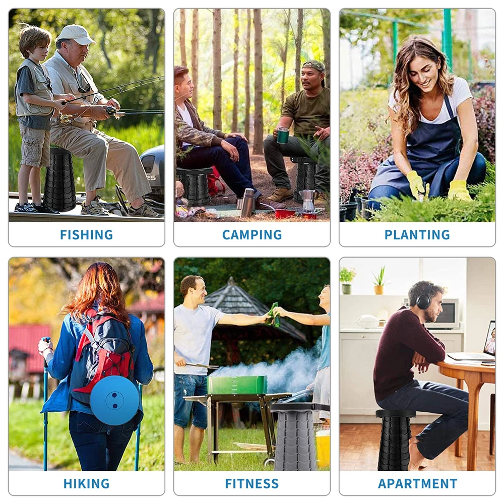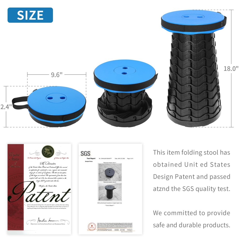 Sturdy & Durable - The Telescoping Stool Is Made Of High Quality Plastic Material, The Newly Designed Fish Scale Structure And Tight Connecting Clasps Improve The Durability And Safety Of The Chair. The Maximum Load Capacity Is Up To 400pounds, Side Support Is Reinforced, Both The Load Capacity And Anti-Tilting Ability Are Stronger Than Other Brands Safe And Stable- The Body Of The Folding Stool Is Made 120 Segments And Each Layer Has Multiple Buckles For Safety,Sturdy,Durability,Stability. Which Makes The Stool More Flexible And Stronger And Not Easy To Break And Deform. The Special Design Allows This Sturdy Folding Stool Effortlessly Bear More Weight. The Anti-Slip Base Ensure The Stability Of The Foldable Stool Adjustable Height- The Camping Stool Is Lightweight And The Unique Locking System Allows You To Adjust The Height Easily, Retractable From 2.5” To 18”, 12 Positions Can Be Chosen According To Your Needs, Fit For Men, Women And Kids Lightweight And Portable-This Telescopic Stool Is Portable And Lightweight, Only 2.54 Pounds With Diameter 9.8 Inches, It Takes Very Little Space, Can Easily Fit Into Any Luggage Or Backpack, It Is Also Designed With A Adjustable Strap So That You Can Carry In Your Hand Or Hang On Your Shoulder Versatility- This Portable Telescoping Stool Is Suitable For Both Indoor Or Outdoor Activities, You Can Put It In Your Kitchen,Bathroom, Garden And Even On The Subway! It's Also Perfect For BBQ, Picnic, Fishing, Camping, Gardening, Traveling, Hiking, Queuing And Even Hunting