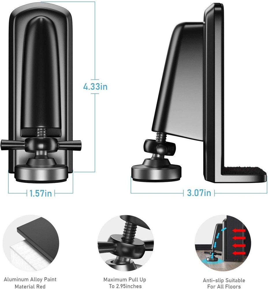 Features There must be a small gap (at least 0.19 inch) between the bottom of the door and the floor to use this portable door lock! 【Security Protection for Home and Hotel】Door jammer is a portable, industrial strength door security device that prevents unwanted entry, It can provide protection when you are at home or when traveling in hotels. Please make sure the base is full seated into the bottom corner of the door. 【Easy to Install】No tools are required to use this door security device - simply place it under your door and turn the screw. And in case of emergency, our unique quick-release feature allows you to immediately remove it with just an upward pulling motion 【High-quality Materials】:The anti-theft door blocker is made of thick aluminum alloy material, which is sturdy and durable, and the bottom is made of high-quality rubber material, which has a strong grip and is suitable for floors of various materials. 【Compact and Exquisite】:The door stopper is very compact and exquisite, Suitable for most doors(The height of the door gap is between 0.2-2 inches) that open inward, you can carry it with you when you are on business or traveling