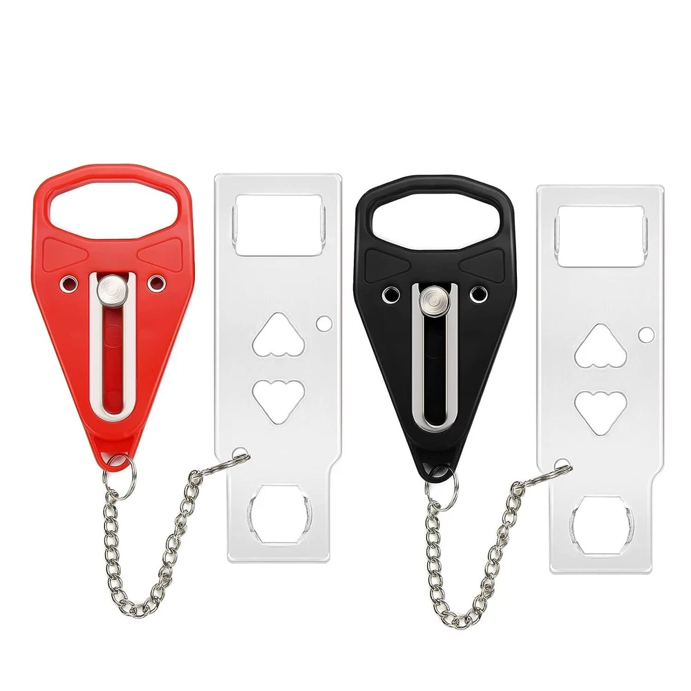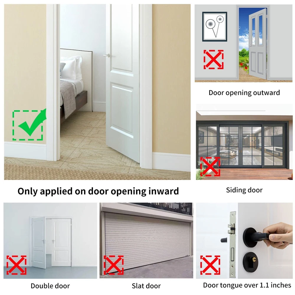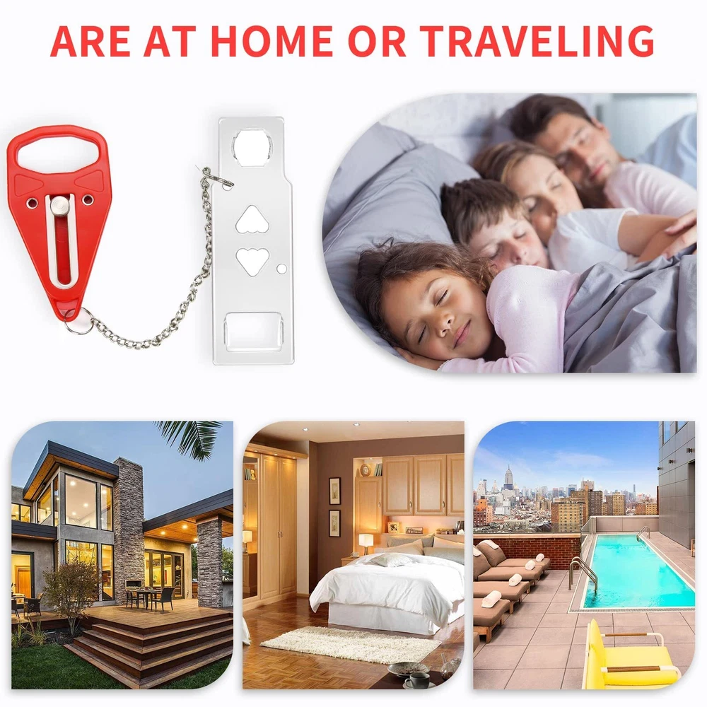 Keep Security and Privacy: This portable door lock provides you with extra security and privacy in travel and home, the door cannot be opened from the outside even with a key, greatly increasing your security and preventing unauthorized entry, is a good helper when you on business, business trips travel or living alone Easy to Use: Easy to install or remove.Just insert the metal piece into the slot of the door lock, close the door, and then put the handle groove to the stud on the metal sheet, then no one can open the door from outside.The door lock can be installed in seconds without any tools, even in emergency situations and in the dark High Quality Material: The door security device is made of strong stainless steel. A strong door lock with high quality may prolonged service life. Rugged ABS plastic cover to prevent damage to doors under pressure. Steel surfaces with electroplating and polishing technology ensure a smooth touch and minimize any injury to your skin Widely Used: The security door stopper contains two holes of different sizes to ensure that all types of door locks are matched. It can be applied to avoid pets going out, and also to prevent children from opening their doors to strangers. Perfect for hotels travel door lock, dormitories, apartments, short-term rentals, Airbnbs, bathrooms, bedrooms, or private rooms Portable Lock: Package comes with two inside lockers,give you and your family a double sense of security. Size 4.3 x 1.26 x 0.4 inches with 0.78 inch (2 cm) and 1.2 inch (3 cm) holes, lightweight and small, you can put it in a pocket or handbag, The perfect travel portable door locks, If you have any questions, please do not hesitate to us