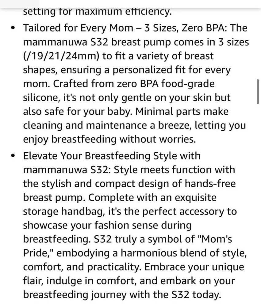 Brand: mammanuwa Power: Battery Operated Size: 24 mm Features: Hands-free, Adjustable Settings, Low Noise Country/Region of Manufacture: China Model: S32 Type: Double Electric Breast Pump Set Includes: Double Pumping Kit Color: White