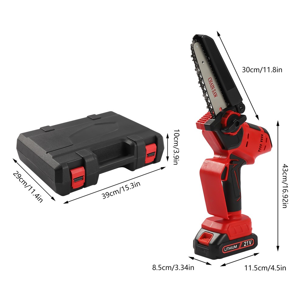 Handheld Electric Compact Chainsaw for Bamboo Forest Cutting Tree Trimming US Description The chain runs at up to 800m/min(43.75ft/s), while the lightweight design limits fatigue during operation. The rechargeable design allows you to stay away from troublesome wires and work comfortably All you have to do is charge it up and hit the switch to start chopping. Key Features High-speed Heat Dissipation System: This lithium chainsaw has a heat dissipation hole design to prevent long-time use burn machine, the machine is used to start the fan to discharge the heat in the machine. Adjustable Baffle: The angle of the baffle on the chain of this lithium chainsaw can be adjusted according to the diameter of the tree, effectively preventing wood chips from splashing while increasing the cutting diameter. One-handed Operation: The lithium chainsaw itself weighs only 4.3 lbs, and can be easily operated with one hand to feel the convenience brought by the lightweight body. More importantly, it can fit into tight spaces that are inaccessible to traditional large saws. Safe and Reliable: The safety lock and switch button must be pressed at the same time to start to prevent an accidental start. Moreover, the handguard baffle protects the hand more effectively, and prevents the branches and leaves from scratching the hand. Sharp and Efficient: The blade of this lithium-ion saw is made of 65#carbon steel and is quenched to make cutting wood and work easier. The chain speed can reach 800m/min(43.75ft/s), which can easily cut large wood of 5.9inch in diameter in a short time. Durable: The lithium battery of this lithium chainsaw has a voltage of 21V and a battery capacity of 1500mAH, which can be used for 20 minutes, and there are two batteries for you to use alternately, doubling the use time. Environmentally-friendly : It uses battery power instead of gasoline for emission-free operation. Compared to gasoline engines, this electric chainsaw is quieter and more friendly to the environment. Thoughtful Accessories: This product is shipped with its own carrying case to store all accessories to prevent damage in transit and ensure the safe delivery of the product. Details Rounded Corners: This handheld lithium chainsaw is filled with smooth rounded corners to prevent knocks and is safe to use. Anti-slip Handle: The handle of this lithium chainsaw is treated with anti-slip, increasing the friction between your hand and the handle, durable and long-lasting grip without fatigue. Application This lithium chainsaw is suitable for bamboo forest cutting, log cutting, logging and pruning, logging, and pruning, etc. Specification Material: Plastic and Copper Blade Material: 65# Carbon Steel Color: Red and Black Guide Plate Length: 15.2cm/6 inches Chain Length: 15.2cm/6 inches Maximum Cutting Diameter: 15cm/5.9in Product Size: 11.5*8.5*43cm/4.5*3.34*16.92in Carry Case Size: 39*29*10cm/15.3*11.4*3.9in Battery Capacity: 1500mAh Lithium Battery Voltage: 21V Plug Type: American Plug 110V Sawing Rate: 800m/min(43.75ft/s) Charging Duration: 2-3 hours Endurance Time: 20 minutes Net Weight: 2kg/4.4lbs Gross Weight: 2.5kg/5.5lbs Package Included 1* Handheld 6-inch Lithium Chainsaw 2* Lithium Batteries 1* Charger 1* Carrying Case 1* English Manual Notes: Please allow the slight color difference caused by the shooting light and 1-3cm error due to manual measurement and make sure you do not mind before ordering. Welcome to ktnsunnyau 💛 If you have any question , please contact us , and we will reply you as soon as possible. Payment Delivery details Terms of sales About us Contact us Payment We accept ebay payment 。 Fees such as import duties, taxes are not included in the item price or shipping costs. These charges are the buyer's responsibility. Delivery details Shipping: 2-9 working days to: USA Terms of sales We maintain high standards of excellence and strive for hundred percent customer satisfaction. Feedback is very important to us. We hope that you contact us immediately before you give neutral or negative feedback, so that we can address your concerns. It is impossible to address issues if we do not know about them! About us Your satis faction is our ultimate goal. We work hard to earn your trust and future business. Our certified technicians have tested each item before shipping. The unit comes with 1 year limited warranty on all manufacturing defects. a) If you receive a defective item, you may return it or ask for a discount. Please contact us within 14 days after you receive the package. b) What you returned must be intact and in its original packaging as re? u. Customer is responsible for shipping costs of the returned item. c) We will cover the cost of shipping back t with the shipping rate indicated in the registration page. We will send you a new unit or refund the full payment you paid. Thank you. Contact us Business Hour Business Hour: Monday To Friday: 8:30 AM to 5:00 PM (Beijing China time) Due to time zones, our reply to your questions may not be immediately. But within above working time, we will reply your email within 24 hours. If it's non-workdays, please kindly be patient and wait till Monday. Please contact us with ebay message. Please feel free to contact us if you have any questions. Monday To Friday: 8:30 AM to 5:00 PM (Beijing China time) Due to time zones, our reply to your questions may not be immediately. But within above working time, we will reply your email within 24 hours. If it's non-workdays, please kindly be patient and wait till Monday. Please contact us with ebay message. Please feel free to contact us if you have any questions. Manufacturer Warranty 3 Years Country/Region of Manufacture Unknown Brand Unbranded Type N/A Material Plastic and Copper Blade Material 65# Carbon Steel Color Red and Black Guide Plate Length 15.2cm/6 inches Chain Length 15.2cm/6 inches Maximum Cutting Diameter 15cm/5.9in Product Size 11.5*8.5*43cm/4.5*3.34*16.92in Carry Case Size 39*29*10cm/15.3*11.4*3.9in Ba