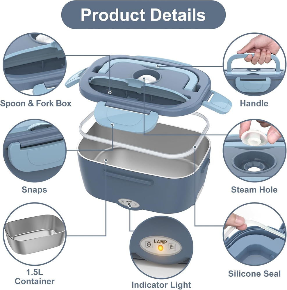 Store New Arrivals Add to Favorite View Feedback Contact Electric Lunch Box Food Heater, Electric Heating Lunch Boxes Lunch for Adults/Men/Truck/Car/Work, 80W 1.5L Removable 304 Stainless Steel Container, 110V/12V/24V, with Fork & Spoon Description Item model number DFH-001 Closure Type Snap Style Eclectic Number of Compartments 1 Capacity 1.5 Liters Number of Items 1 Unit Count 1 Count Color Butterfly Blue Item Form Box Material Polypropylene Shape Rectangular Item Weight 2.14 pounds Theme Car, Construction Site, Gift, Home, Lunch Box, Office, Truck Age Range (Description) Adult Included Components Lunch Box Special Feature function(f) {var _np=(window.P._namespace("DetailPageProductOverviewTemplatesJava"));if(_np.guardFatal){_np.guardFatal(f)(_np);}else{f(_np);}}(function(P) { P.when('A').execute(function(A){ A.on('a:truncate:po-attribute-truncate-4:updated', function(data) { var isTruncated = !data.truncateInstance.getIfTextFits(); var seeMoreElement = document.getElementById('po-attribute-see-more-id-4'); if(seeMoreElement) { seeMoreElement.style.display = isTruncated ? '' : 'none'; } }) }); })); 110V for Work/Home, 12V/24V for Cars/Trucks, 80W Heat up within 20-30 Minutes, A Gift for People Who Are Trying to Eat Healthier on the Go, Comes with a Fork and a Spoon See more Product Dimensions 9.5"L x 6.7"W x 5.5"H Product Care Instructions Hand Wash Only, Microwave Safe Number of Pieces 1 Enjoy Warm & Healthy Meals --- This food warmer lunch box makes you enjoy warm and healthier home-cooked meals, with no microwave need. Get it plugged 20-30 Mins before mealtime for self-heating, you will have a hot lunch and don’t have to pay for fast food. Tip: recommend adding some stock or water to the food for heating up faster and more evenly. Do not add water to the heating base! (Do not add water to the heating base!) 2 IN 1 Car & Home Use --- Electric lunchboxes for adults contains two different plugs: one for Work/Home (110V), one for Car/Truck (12v/24v). People who on the road for lunch or without access to a microwave, such as truck/Uber driver/office worker can enjoy hot homemade food in the car/office. Improved Sealing Lid --- Leak-proof seal gasket is installed on the lid for a better seal to prevent liquid food from spilling out. For closing the cover properly and smoother, please lock the short snaps first and then lock the long snaps. The liquid may leak out from the steam port on the lid, so please don't turn the lunchbox upside down. Safe Material & Easy To Clean --- Portable heated lunchbox made of premium PP plastic and 304 stainless steel, which is safe and durable. Contains a 1.5L removable stainless steel container and a 0.45L plastic box for storage, they are dishwasher safe. Warm Tips: No cleaning the heating base with water, No add water to the heating base to avoid short circuits. Lifetime Satisfaction Guarantee --- We hope the lunch box is worth having and make your life better. Please contact us if there is any problem with it heating up. Even if missed the return window, we will send you a brand new lunchbox or give you a satisfactory solution. Product Description Vabaso electric lunch box contains 2 plugs: 12V/24V power cord for cars/trucks use, 110V for home/office use. Equipped with 80W power, heating faster, about 25-30 mins to warm up meals. This portable electric lunch box will bring convenience to your life, allowing you to enjoy a clean, hygienic and delicious hot lunch. Suitable for company office employees, car/ truck drivers/ construction workers/ teachers, and so on. Package Includes: 1 x Electric Lunch Box 1 x Lunch Box Bag 1 x Cutlery (Spoon & Fork) 1 x Vehicle Powering Cable(12V/24V) 1 x Socket Powering Cable(110V) Portable: The stylish appearance and portable handle allow you to carry food with you. Gift: A perfect gift for your husband, boyfriend, father, and friend or yourself. Vabaso 80W Electric Lunch Box: Supports: 12V Car Use + 24V Truck Use+ 110V Home/Office Use. Even if you are busy at work, this electric heated lunch box can also provide you with a warm lunch. 12V/24V adapter power cord allowing you to heat up food while driving and enjoy hot meals during the journey. Material: Food grade PP material & 304 stainless steel, safe and durable. Removable: 1.5L large capacity stainless steel container is removable, very easy to clean. 1. Don't place the lunch box in the freezer or microwave. 2. Make sure the steam outlet is opened before heating. 3. Don't immerse the heating base in water for cleaning. 4. Please pull out the power cord before eating. Not Microwave Need This portable food heating lunch box make your life better. You don’t have to line up and use the microwave to heat up the food. People who work outdoors can't use a microwave, such as car/truck drivers, construction workers, they can heat and enjoy their warm lunch anywhere and anytime now. 25-30 Mins Heating Using PTC original constant temperature heating, low-consumption heat cycle to keep food at a suitable temperature and keep the moisture of the food. It can be heated to about 70°C in 30 minutes. Portable for Car & Home Use This portable food heating lunch box contains 2 plugs: 12V/24V car/truck power cord, 110V for home/office use. Whether you are on the go or running your busy work in the office, Vabaso electirc lunch box make you enjoy hot meals. Leakproof and Convenient Handle Vabaso electric lunch box is designed with a silicone sealing ring, the buckle fits tightly with the built-in sealing ring to effectively prevent food from leaking out. And equipped with an embedded handle, convenient to carry. Easy to Clean 1.5L large capacity 304 stainless steel removable container which is removable for easy cleaning, and dishwasher safe. Tips: Please don't wash the lunch box as a whole into the water. Portable Insulated Lunch Bag This lunch bag is lightweight and foldable, Sturdy and durable, easy to carry. Insulated aluminum foil makes the food fresh for hours, it's non-toxic 