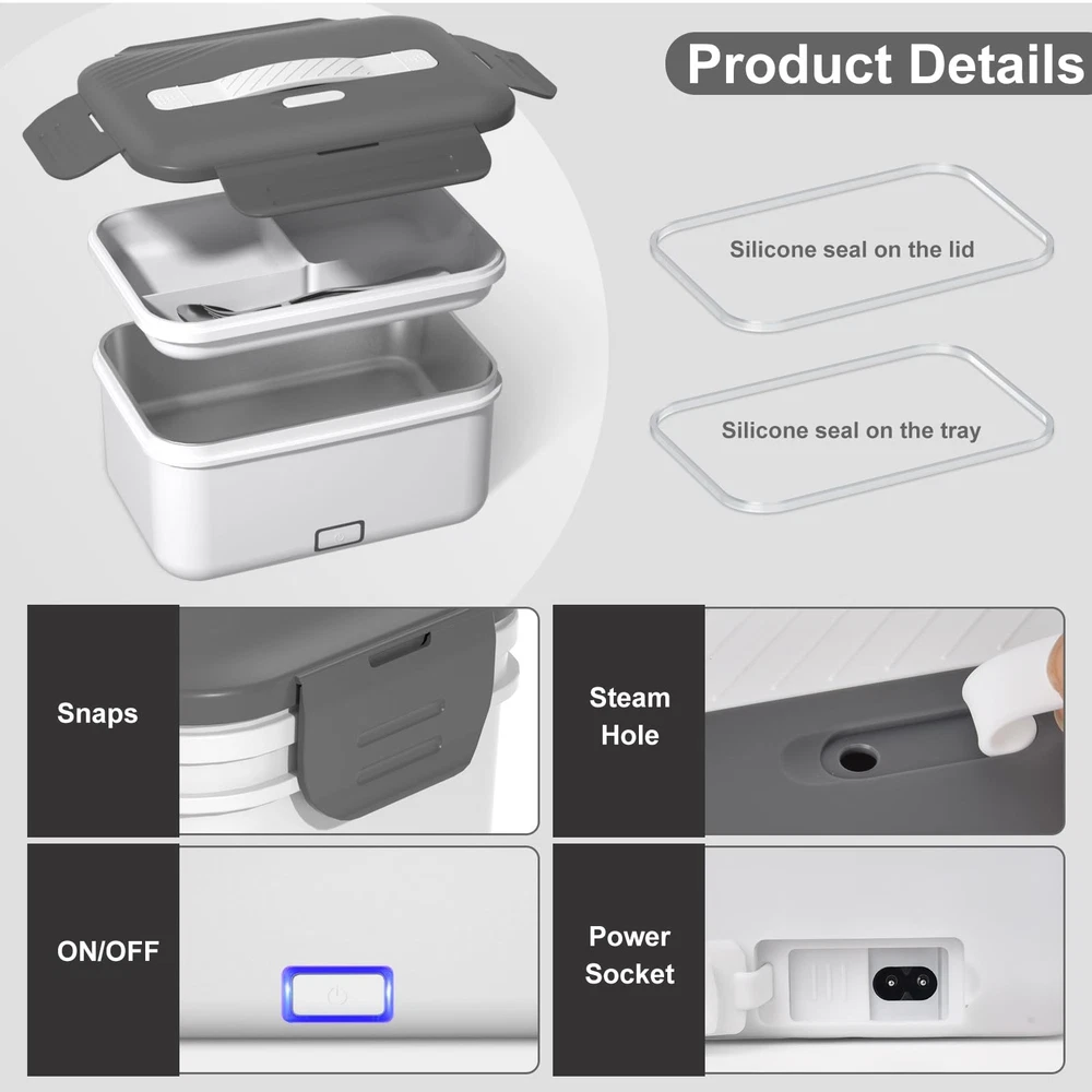 electric lunch box heated lunch boxes for adults loncheras electricas para calentar almuerzo electric lunch box food heater heated lunch box food warmer lunch box portable food warmer heating lunch box for work self heating lunch box lonchera electrica para el almuerzo hot lunch box for adults lunch box warmer portable for work lunch warmer portable for work WARNING: THIS ITEM IS NOT INTENDED FOR USE BY CHILDREN 12 AND UNDER. Large Capacity of 1.8L --- Our heated lunch box capacity is upgraded to 1.8L, up 20% from 1.5L. You can fit more foods like meat, veggies, and staples, great for big - eaters and physical workers to satisfy their hunger. Also, we offer an extra 0.7L plastic container for fruits or sauce. The electric lunch box comes with a bag for easy carrying outdoors. 100W Fast Heating --- With the newly designed PTC constant temperature heating technology and a high power 100W, our electric lunch box food heater features low consumption and high efficiency heat circulation. It can heat your lunch within just 25 minutes while keeping the food moist and fresh. Whether you're in the office, on your truck, or at the construction site, you can enjoy fresh and warm home - cooked meals in no time. (We recommend adding some water to the food for faster and more even heating.) 3-in-1 Electric Lunch Box --- Enjoy fresh and warm home-cooked food anywhere! This electric lunch box for adults can be used with 110V in your home or office, 12V in your car, and 24V in your truck. Whether you're a car/trucker driver always on the go looking to eat healthily or a construction/office worker in need of a hot meal, our heated lunch box is a perfect choice. Compact and Portable --- portable electric lunch box for adults is designed to be travel - friendly and lightweight. It comes with an insulated carry bag that provides excellent protection against heavy rain and dust, keeping your food fresh and clean all the time, making it a great choice for those on the go. Rubber Textured Handle & Spill-Proof Design --- For easy carrying, the electric lunch box's handles are reinforced and have an anti - shedding rubber texture, so they won't break during use. There are four - sided snaps and built - in rubber seals. This double - protection design lets you not worry about soup leakage. Perfect Gift for on-the-go People --- Simply plug it in 20-25 minutes in advance and continue with your work. You'll enjoy warm meals at lunchtime. Ideal investment for busy people who don't have the time or opportunity to eat warm food, including car/truck drivers, office workers without access to a microwave, and anyone who's frequently on the road. Included Spoon and Fork --- We offer complimentary stainless - steel fork and spoon. The size of the spoon and fork is designed according to the shape of the heated lunch box and can be placed in the lunch box. use the complimentary spoons and forks right away when opening the lunch box. For those in various workplaces, no need to carry extra utensils. They can dine easily whether it's a rushed lunch or outdoor meal. Satisfactory Service --- We hope this electric lunch box food heater makes your life better and more convenient. Please if you encounter any problems during use, such as stopped heating, or missing charge cord, and we will provide you with a satisfactory solution.