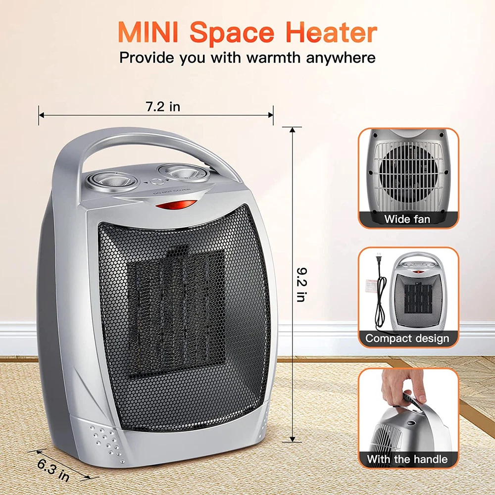 Store New Arrivals Add to Favorite View Feedback Contact Portable Electric Space Heater 1500W/750W Personal Room Heater with Thermostat, Small Desk Ceramic Heater with Tip over and Overheat Protection ETL Certified for Office Indoor Bedroom (Silver) Description Power Source electric Power Source electric Heating Method electric Max Temperature Setting 158 Degrees Fahrenheit Fuel Type Electric Room Type Bedroom, Home Office, Study Room Model Number PTC-906E Heating Coverage 200 square feet Heating Element Radiant Additional Features Digital Display Form Factor Cabinet Heat Output 1500 Watts Indoor/Outdoor Usage Indoor Number of Speeds 3 Special Feature Digital Display Amperage 12.5 Amps Mounting Type Floor Mount Color Silver Item Dimensions D x W x H 11.06"D x 8.39"W x 6.57"H Indoor Outdoor Usage Indoor Heating Method electric Voltage 120 Volts Recommended Uses For Product Office, Desk Safe for kids and pets: The heater is made of flame retardant material to achieve zero fire hazard; automatic overheat protection system will shut the unit off automatically when reaching overheat limit; tip over switch at the bottom will be triggered and the unit will be shut off in tilted or tripped over condition; power indicator indicating it’s plugged in; ETL certified, safety tested Speedy warming: With PTC ceramic heating tech and high speed fan, this heater put out tons of heater to heat up 200 square feet in minutes. Helps to save electric bills by heating up needed small spaces instead of heating the whole house with other centralized heaters. Lower than 45 decibel while working, quiet enough and better heat dispersal for indoor sleeping, reading and working Easy to use: Adjust the knob on the right to turn the unit on. "I" is for producing heat at 750 watts, "II" will produce heat faster and hotter at 1500 watts, and “Fan” will blow out cool air. Then turn the thermostat knob on the left toward the + sign. The adjustable temperature range is 0℉ to 158℉. It will get the heater to cycle on and off according to if the room’s temperature reaching heater's setting temperature Portable and mighty: Dimensions: 8 x 6 x 10 inch. Easy carry handle and lightweight make this space heater easy to place in room or move from the floor to the table. No more concern about taking up too much space in a crowded place. An ideal space heater for office and a thoughtful gift for friends and family in winter Long serving life: Tip over swicth, overheat protection and ceramic speedy heating and cooling for its steady operation and a long serving life, no extra worry on accidental damage for winter life Product Description Brightown 750W 1500W Ceramic Space Heater ETL Listed Electric Heater Portable Heater with Adjustable Thermostat and Overheat Protection for Office Bedroom Kitchen Dorm and Home. KEY FEATURES Safe ceramic element Adjustable thermostat Overheat protection Multiple heat settings Carrying handle Why Choose Us? With the cold weather coming, it is not always easy to make you feel warm and cosy immediately while you are in the office or in the room! Designed with safe ceramic element interior and cool-touch exterior, Overheat Protection prevents accidents or damages from occurring. When the unite is tipped forward or backward tip-over switch will shut off the heater automatically. The portable heater allows you to heat up the spaces you are in to reduce energy consumption. You can lower your thermostat and lower your energy bills. Material: plastic Input: 120V AC 60Hz Dimension: approx. 8.34" x 6.55" x 11.66" Operating Modes: High, Low and Fan Safe and Durable Space Heater has Automatic Overheat Protection & Tip-Over Protection. It will shuts the unit off automatically when the parts of the heater overheat or it is tipped. User-Friendly Controls Brightown Ceramic Heater features three different settings with an adjustable thermostat, when the temperature of the heater is too high, the thermostat will automatically turn the heater off for your safety. Easily select your Heating Preference for instant warmth. Carry handle You can feel free to move the space heater in anywhere you want to go and convenient to warm whenever you are! Exclusively designed for bringing warmth to the office, home and school dormitory. High performance and versatility heater Keep quiet and uncluttered with Brightown 750W/1500W/Fan Powerful Ceramic Space Heater. Easy to use controls allow you to convenient and comfortable warming. ABOUT US We offer the best prices around on high quality products. Our E-store includes media such as books, movies, music and games while offering electronics, toys, sporting apparel, clothing, tools, general home, garden items and more. SHIPPING We are always working hard to ensure your package arrives as soon as possible. Please understand that some factors like weather, high postal traffic, and the performance of shipping companies are outside of our control. We offer free shipping to the lower 48 states and ship within 2 business days of payment, usually sooner. We do not accept P.O. Boxes. Please provide a physical address. For shipping outside of the continental USA, we only use eBay's Global Shipping Program.The item is shipped to KY and then sent to the rest of the world. International customers are responsible for all duties and taxes. Continue to check out in order to calculate costs for shipping the item to your country. Messages regarding eBay's Global Shipping Program MUST be directed at eBay EXCLUSIVELY. RETURNS We offer a 30-Day Return Policy on items which you are not completely satisfied with. You have the option for a full-refund or an exchange of the item. No returns are available on items shipped outside of the USA. PAYMENT We accept PayPal. CONTACT US This page content is yet to come Please ad us to your favorite seller and visit again later Thank You CUSTOMER SATISFACTION We try our very best to make sure every customer is completely satisfied. If there's a problem, message 