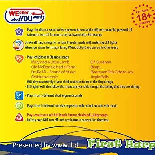 Portable First Harp Musical Instrument - Educational Toy for Children’s Learning and Entertainment Portable Size for Car Travel - Small size for easy travel for your little ones for easy grasp. Perfect for travel and even for bedtime. There are 10 Lullaby musical tunes for continuous play Play Along with the Music - Teach your baby music concepts. One of two color combinations was selected at random. Rated for kids 18 months to 4 years Interactive Music Education - Sing along to an additional 8 classic children’s songs with LED lights. Baby can toggle the music on and off with Harp strings Ideal Gift - First Harp musical instrument is a perfect gift choice. Little children will love to touch and enjoy this musical toy. With IR device to detect baby’s fingers and plays recorded harp sounds. Automatic turn-off function. Great for Mom on the go and car rides Safe Certified Product - 2 AA Batteries INCLUDED. Safe with secure battery cover. Strong ABS plastic ASTM USA Certified Shipping We offer FREE shipping on all orders! We use a selection of shipping services such as UPS, FedEx, USPS etc. We only ship to the lower 48 states, no APO/FPO addresses or PO Boxes allowed. Local pickups and combined shipping options are not provided at this time. Return You can return a product for up to 30 days from the date you purchased it. Any product you return must be in the same condition you received it and in the original packaging. Please keep the receipt. Payment We accept payment by any of the following methods: PayPal Please pay as soon as possible after winning an auction, as that will allow us to post your item to you sooner! Feedback Customer satisfaction is very important to us. If you have any problem with your order, please contact us and we will do our best to make you satisfied. Contact Us If you have any queries, please contact us via ebay. We usually respond within 24 hours on weekdays. Please visit our eBay store to check out other items for sale! Thank you for shopping at our store.