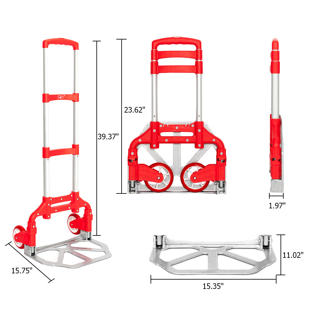 Product Description Introducing our Portable Foldable Telescopic Trolley Cart, the perfect companion for effortless transportation of groceries, luggage, or daily essentials. Designed with convenience and portability in mind, this versatile trolley cart features a lightweight yet sturdy frame that can be easily folded and unfolded, making it an ideal choice for home use, travel, or outdoor activities. The telescopic handle allows for adjustable height settings to suit different user preferences, while the smooth-rolling wheels ensure easy maneuverability on various surfaces. Whether you're heading to the supermarket, airport, or park, this compact and durable trolley cart is designed to simplify your life. Key Features 1. Lightweight & Durable Construction:•Constructed from high-quality aluminum alloy or reinforced plastic, this trolley cart combines durability with a lightweight design. It can support loads up to [maximum weight capacity] without compromising on strength, ensuring-lasting performance. 2. Easy Fold & Compact Storage:•The innovative folding mechanism allows the cart to be quickly collapsed into a compact size for convenient storage and transport. When not in use, it takes up minimal space, fitting easily under a bed, in a closet, or even in a car trunk. 3. Adjustable Telescopic Handle:•Equipped with an extendable handle that can be adjusted to multiple height settings, this feature enhances user comfort by allowing customization based on individual needs. The ergonomic grip provides a secure and comfortable hold during use. 4. Smooth-Rolling Swivel Wheels:•Featuring four all-terrain swivel wheels, the trolley cart effortlessly navigates through different terrains, including pavements, grass, and stairs. The wheels are equipped with durable bearings for smooth rolling and stable movement, reducing effort when pushing heavy loads. 5. Versatile Usage & Safety Design:•Ideal for a wide range of applications such as shopping, traveling, gardening, or moving items around the house. Additionally, safety features like anti-slip handles and brake systems (if applicable) provide peace of mind, ensuring safe and reliable operation in any environment. 1. Model: 106-3A 2. Material: Aluminum PP 3. Color: Red 4. Product size: 100*40*39CM 5. Package size: 29x29x28cm 6. Gross/net weight: 3.8/3.5kgs 7. Included accessories: each car with a rope 8. Packaging material: Each product bubble bag wrap export mail order carton packaging (requires five layers of double corrugated B C to strengthen the carton, good quality) Includes: Luggage cart *1 Rope *1