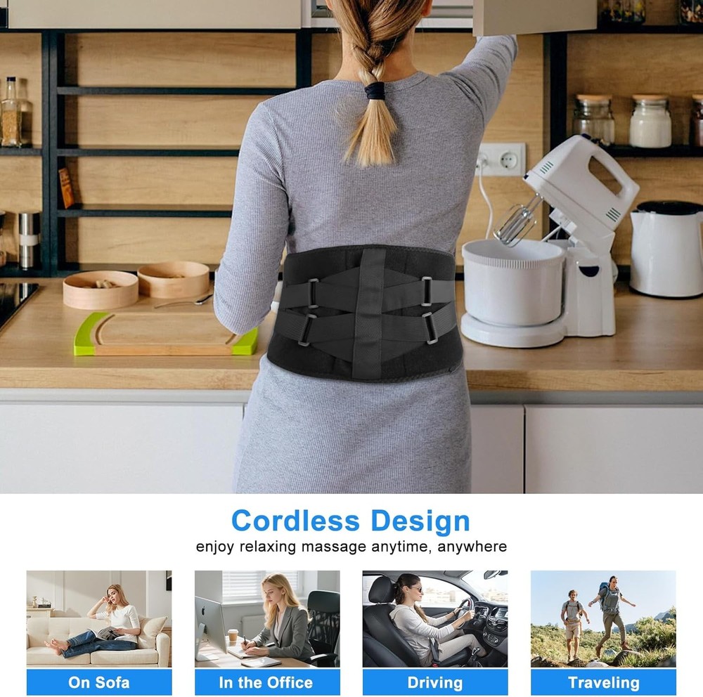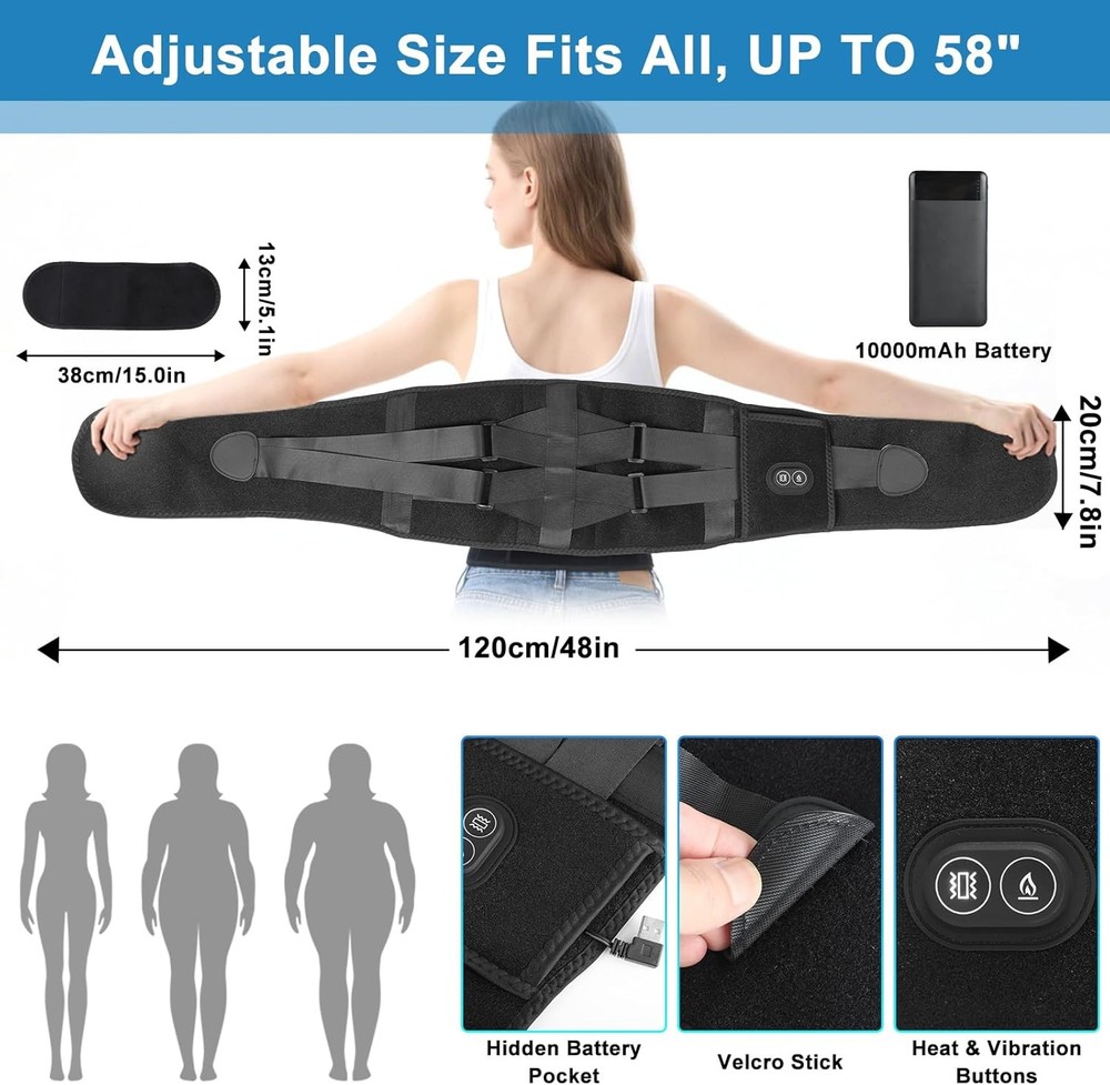 Experience Ultimate Relaxation with Our Portable Heating Pad & Massager! Introducing the Youth Feast Portable Heating Pad for Back – the perfect solution for soothing lower back pain and tension. With its advanced features, this cordless heating pad combines heat and vibration for a customizable and comfortable experience, wherever you are! Key Features: 10000mAh Cordless Heating Pad: Enjoy 2 weeks of daily massage cycles without frequent recharging. Take your relaxation anywhere – at home, in the office, or at the gym. Comfortable Wear: Perfect for relaxing while doing chores or during long trips. This heating pad melts away your cares and provides warmth on chilly days. 3 Heating and 3 Vibration Settings: Choose from three heat levels (45℃-65℃) and three vibration modes, allowing you to find the perfect combination for your comfort. Lower Back Support: Features three non-removable support poles for superior lower back support, ideal for long hours of housework or heavy lifting. Pain Relief: Combines heat and vibration to effectively relieve hip and waist pain, muscle tension, and more, making pain management easier. Adjustable Fit: The extension band stretches up to 58", ensuring a snug fit for various waistlines and allowing for hands-free use. Important Reminders: Charger not included; use your own USB charger. Battery may arrive not fully charged for safety during transport. Why You'll Love It: This portable heating pad is all about convenience and comfort. Imagine relaxing in your favorite chair, or even while doing household chores, with soothing heat and vibrations working to ease your tension. Its lightweight design means you can take it on the go, providing you with the relief you need during long car rides, flights, or any time you're away from home. Enjoy your daily activities while giving your back the care it deserves!