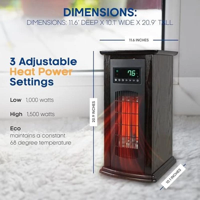 You may also like Energy Efficient Portable Electric Ceramic Heater 400W Compact Design Indoor Use 17.97 USD 18.92 USD Free shipping 5% off Portable Electric Personal Space Heater 750W Fan 2 Settings Tip-Off Protection 37.7 USD 39.68 USD Free shipping 5% off About this item Indoor space heater efficiently warms up a 1500-square-foot area, making it a versatile heating solution for various spaces like bedrooms, living rooms, and basements Incorporates 3 infrared quarts and advanced infrared technology, ensuring energy-efficient heating while offering 3 adjustable heat power settings for customized warmth Built with user-friendly controls with a large LED display simplify temperature adjustments and includes remote control that allows you to manage the heat from anywhere in the room Comes with a safety features such as an automatic shut-off during overheating and a cool touch exterior that makes it a secure option for households with children and pets Crafted with sleek furniture-grade wood that seamlessly complements various furniture and decor setups; Measures 11. 6 inches long, 10. 2 inches wide, and 20. 9 inches tall, and weighs 20. 9 pounds Brand:LIFESMART GLOBAL Special Feature:Cool Touch Exterior Color:black Form Factor:Tower Indoor/Outdoor Usage:Indoor Power Source:Corded Electric Heating Method:Radiant, Convection Item Weight:24. 6 Pounds Heat Output:5100 British Thermal Units You may also like Genuine OEM Replacement Trimmer Line Durable 118" Diameter Twisted Shape NEW 27.74 USD 29.2 USD Free shipping 5% off Grey Metal Food Storage Canister Set 5pc Freshness Seal Cookie Box 5 Cup Cap New 51.29 USD 53.99 USD Free shipping 5% off Silver Poodle Kitchen Scene Dish Mat 14x21 Breed Artwork Polyester Foam New 27.11 USD 28.54 USD Free shipping 5% off English Pointer Breed Specific Bone Treat Jar 9" Tall Full Color Artwork New 78.39 USD 82.52 USD Free shipping 5% off 10 Shelf Organizer Shoe Rack w/ Zip Down Fabric Cover Lightweight Hold 30 Pair 38.23 USD 40.24 USD Free shipping 5% off 20-Piece Flatware Set Stainless Steel Satin Finish Service 4 Kitchen Dining New 31.93 USD 33.61 USD Free shipping 5% off Hairball Control Cat Food 7lb Bag Salmon Rice Protein Digestive Vision Support 35.92 USD 37.81 USD Free shipping 5% off ABS Wireless Digital BBQ Grilling Thermometer Built-In Timer LCD Display Screen 26.64 USD 28.04 USD Free shipping 5% off Natural Chicken Beef Wet Cat Food 3oz Cans 12 Pack Gravy Added Nutrition New 24.27 USD 25.55 USD Free shipping 5% off Stretch Plush Recliner Slipcover Set Furniture Protection & Refreshment New 28.41 USD 29.91 USD Free shipping 5% off Healthy Kitten Wet Cat Food Chicken Salmon 3oz Cans 12 Pack High-Protein Formula 26.43 USD 27.82 USD Free shipping 5% off 12.5" Sea Green Non-Stick Aluminum Skillet Healthy Cooking on All Cooktops New 44.73 USD 47.08 USD Free shipping 5% off