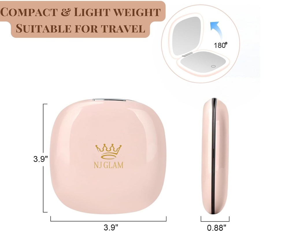 Lighted Makeup Mirror for Women, Portable, LED Light, USB Charging, (Pink) Product Details Color: Pink Brand: NJ GLAM MPN: RM312-DL UPC: 198715622027 EAN: 0198715622027 Brand: NJ GLAM Room Type: Any room Shape: Square Product Dimensions: 0.9"L x 3.9"W Frame Material: Plastic Brand: NJ GLAM Room Type: Any room Shape: Square Product Dimensions: 0.9"L x 3.9"W Frame Material: Plastic Mounting Type: Hand held Special Feature: 2-Sided , dual light ,touch button, compact Color: Pink Number of Items: 1 Material: Acrylonitrile Butadiene Styrene Assembly Required: No Magnification Maximum: 10 x Manufacturer: Dongguan Huayuanxing tech Co Ltd UPC: 198715622027 Item Weight: 7.4 ounces Country of Origin: China Item model number: RM312-DL Batteries: 1 Lithium Ion batteries required. (included) Date First Available: June 11, 2024 Dual-Sided Illumination: Compact mirror with dual LED lights for evenly lit makeup application. Portable and Rechargeable: USB charging cable included for cordless, on-the-go use. Adjustable Brightness: Three brightness settings to customize lighting. 1X/10x Magnification: One side regular, one side 10x magnified for detailed application. Compact Design: Foldable and travel-friendly at The NJ glam compact mirror with dual light is the ultimate portable vanity companion for on-the-go touch-ups and makeup application. This sleek and stylish mirror features dual LED lights that provide natural, even illumination to ensure your makeup looks flawless in any lighting condition. The compact size (approximately 4 x 0.9 inches or 10.7 x 8.9 cm) and included USB charging adapter make it easy to slip into your purse or travel bag. Whether you're at the office, in the car, or out for a night on the town, this lighted makeup mirror ensures you'll always look your best. With its pink hue and modern design, it's not just a practical tool but a fashionable accessory as well. Touch up your makeup with confidence and achieve a seamless, radiant look anywhere you go.