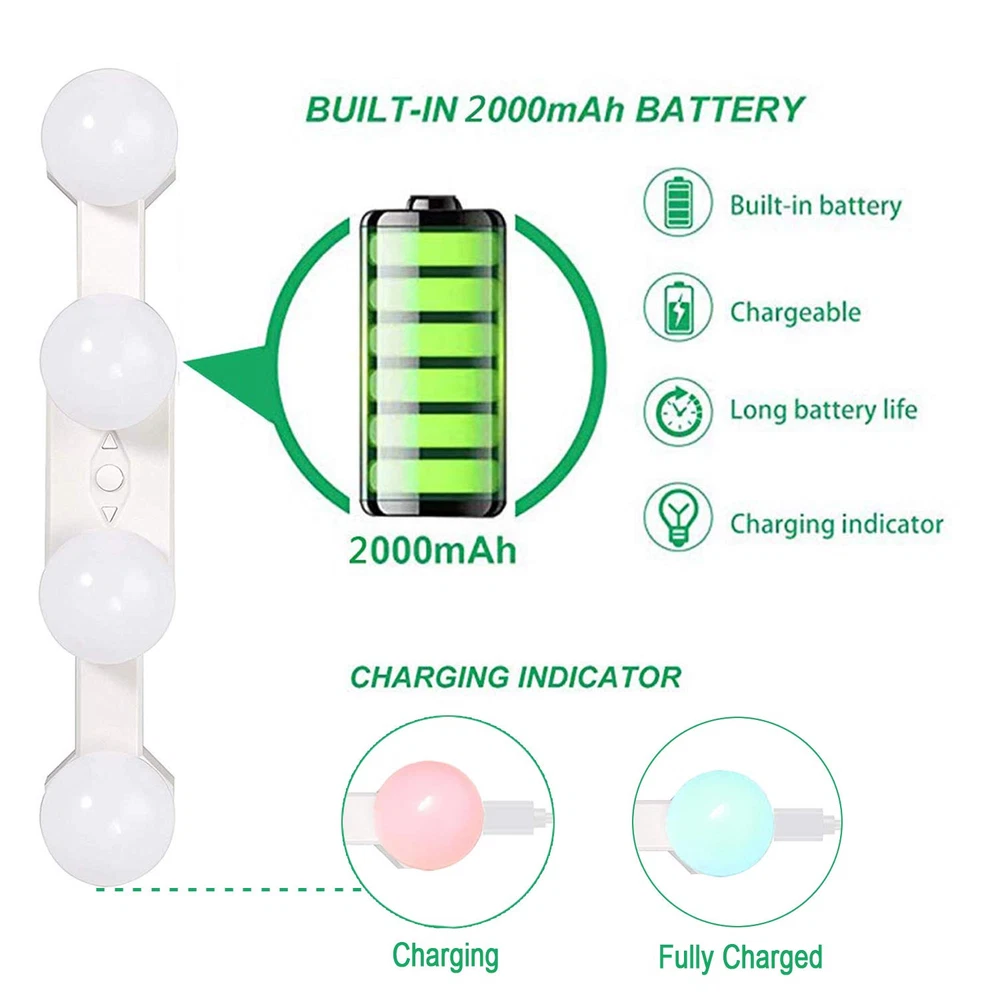 Hollywood Style Rechargeable LED Vanity Mirror Lights Bulbs Features: 1. Simulated Natural Daylight, gives you the most natural, even illumination. 2. Rechargeable, Build in 2000mHA lithium battery. 3. Dimmable Switch, With 10-level brightness dimmer, 3200K-6500K LED color temperature adjustment buttons. 4. Cordless design, installs in seconds using included suction cups, no tools or wiring required. 5. Portable Design ,Take it off the mirror and on the road, easily fits in a suitcase or duffle bag. 6. Perfect makeup lights makes a great gift for moms, grandmas, sisters, daughters, friends & bridesmaids. Specification: Type: LED Mirror Light Material: ABS + PC Color: White LED Color Temperature: 3200K - 6500K Charging time: 2-3 H Use time: maximum brightness 5H, minimum brightness 40H Product Size: 30 * 5 * 6cm / 11.8 * 1.9 * 2.3in Product Weight: 258g / 9.1oz Package List: 1 x LED Mirror Light 1 x USB Cable 4 x Suction Cup 4 x Adhesive Pad 4 x Magnet 4x Screws 1 x User Manual How to install? 1. Wipe the mirror and the three suction cups with a wet towel. 2. Gently attach the mirror light to a clean mirror. 【Super bright & eye protection】 4 Bright hollywood style LED light bulbs glow evenly without glare. 【Rechargeable & wireless】 Vanity lights is built-in rechargeable lithium battery 2000mAh,can be charged by USB cable, say goodbye to those pesky wires. 【3 Color Modes】 Daylight white and warm white and Natural light 3 light color options meet your different needs in different occasion. 【4 Installation Modes】 Suction cups ,3M rubber , screws , magnet,different installation methods can be installed in different places. 【Multi-Applications】Multi-functional led lights,which can be widely used for kitchen cupboard lights, wardrobe lamp, writing desk lights, bathroom lights, makeup dressing table lights, light, etc.