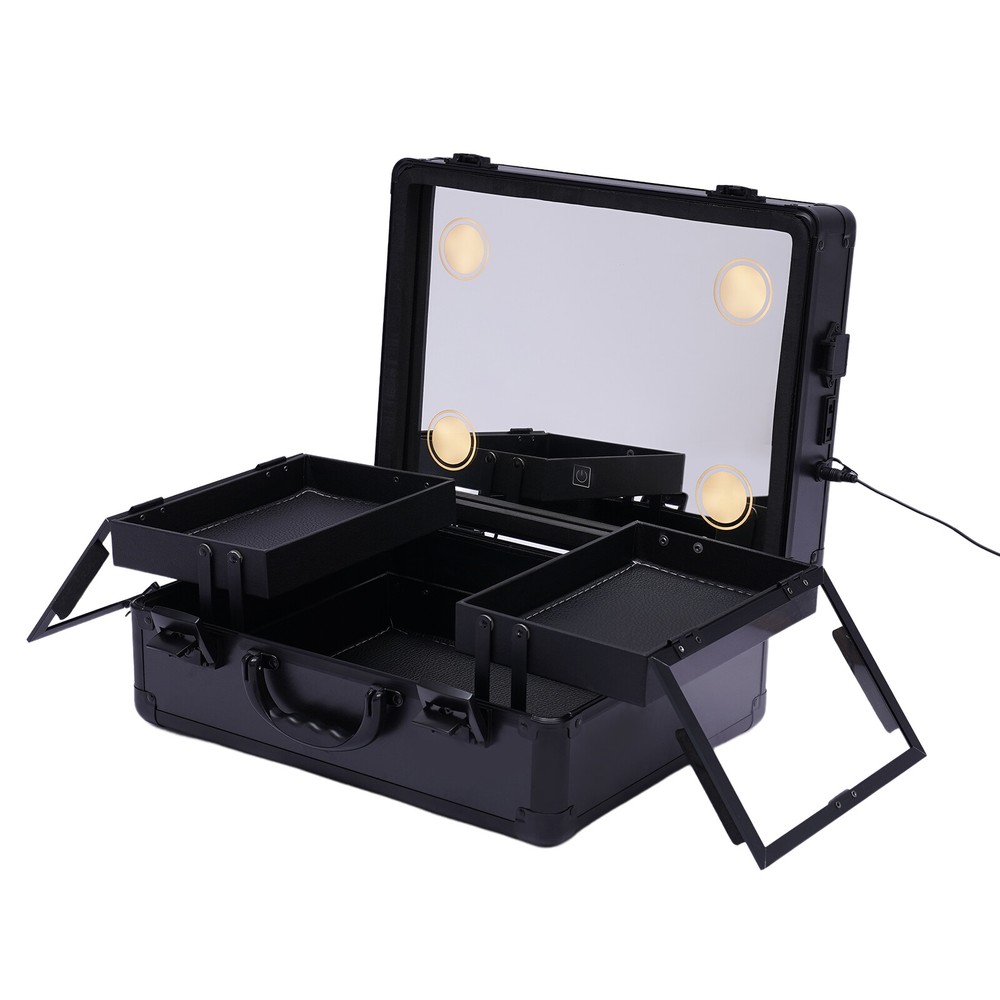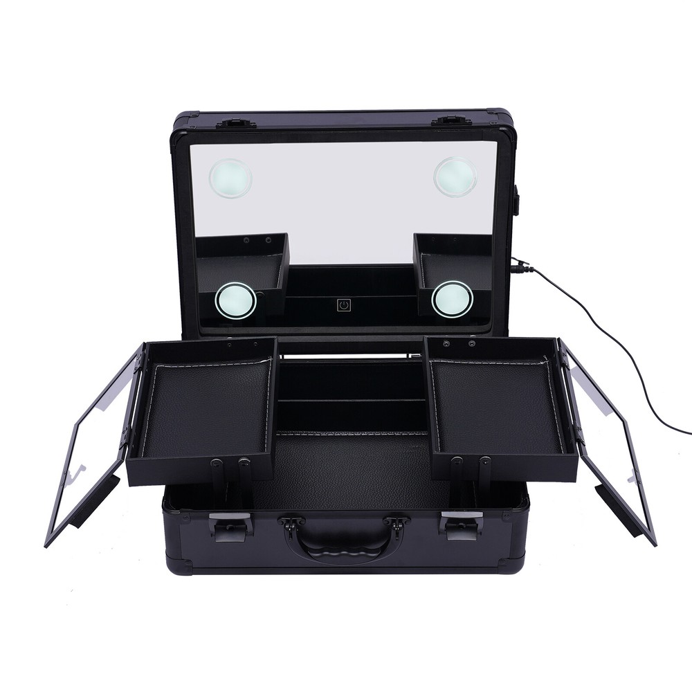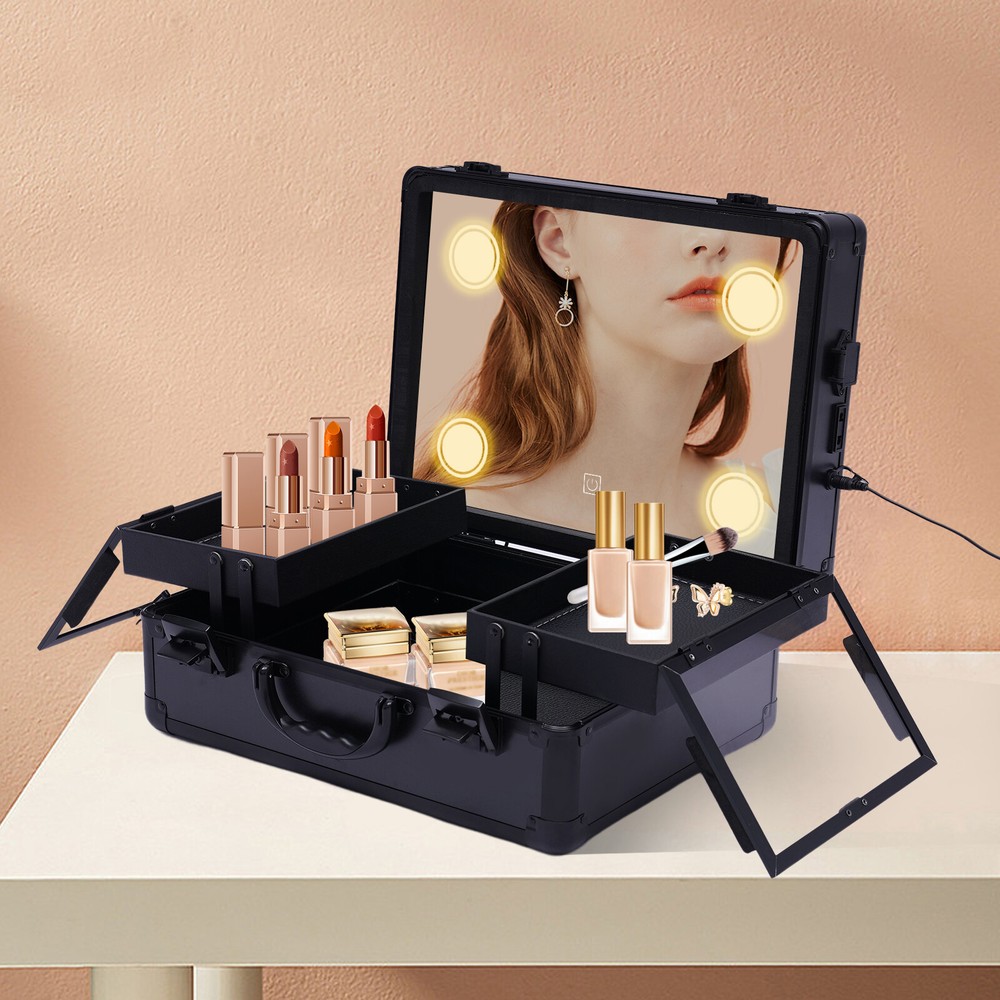 Professional Travel Makeup Train Case Portable Cosmetic Organizer Bag+LED Light Portable Train Makeup Case with 3 Level LED Light Mirror Multifunction w/ Lock Key Features Large Capacity Zoned Storage : It has two layers. The upper layer consists of 2 separate trays of 5.9*8.7*1.6inch for your usual lipsticks, brushes, blushes, etc. The lower layer is a 14.6*11*3.7in a one-piece tray that provides more space for your nail polish, essential oils, foundation, etc, so you can say goodbye to a cluttered desktop. Elegant Look : It is made in black style with all the components matching that color and keeping in line with the specially made handles for an impressive look. Makeup Assistant: It comes with 4 LED lights designed in the corners of the lid and a top mirror. The LED lights can adjust the light color between cold white, warm white and natural light, and the brightness of the makeup lights can be adjusted by touching the screen, allowing you to apply makeup anytime and anywhere. Security Protection : It comes with 2 locks to protect privacy and security during travel. Therefore, it is also suitable for holding watches, bracelets and some other valuables. Considerate Design :This make-up case comes with a 12V rechargeable jack, an external power supply jack, and a power jack. And the power cord can be used for an external curling iron, mobile phone, and hairdryer power when it is powered up to meet your needs while working. High Quality : It is made of high-quality ABS material, which is sturdy and durable, and the metal reinforced corners have good wear resistance . It can be used for many years. Easy to Clean : ABS stain-proof plastic is easy to clean. If the tray gets dirty with cosmetics, just wipe it with a damp cloth and it will be as good as new. Humanized Design : In addition to the makeup fire compartment itself which is closed, the two separate trays on the upper level also have their separate lids, which can effectively prevent dust and stains on your cosmetics. Ideal Gift : This elegant makeup train case is what every girl needs, so it is a great gift for girls. Portable : It is designed as a mini suitcase with dimensions of 5.9*8.7*1.6in and weighs only 6.61lbs. The curved grip makes it easy to hold and carry on your journey. Details Enhanced Corners : Durable aluminum material for long-term use can hold all your daily cosmetics and tools and keep their shape. Glass Lids : The two separate trays on the upper level feature clear glass lids, making it easy for you to be able to find your cosmetics at a glance. 5.91ft Power Cord : It comes with a 5.91ft power cord, allowing you to have plenty of length at your disposal. Therefore, it is more convenient for you to use it. Application This product is suitable for storing cosmetics and skin care products, as well as jewelry, such as necklaces and earrings. Besides, it also can be used in dark places for makeup. Specification Main Material: ABS Color: Black Plug Type: US Light Source: LED Light Color: Cold White, Warm White and Natural Light Voltage: 110-240v, 50-60Hz Power Cord Length: 1.8m/5.91ft Package Size: 40*21*35cm/15.75*8.27*13.78in Top Cover Mirror Size: 37*28*6.5cm/14.6*11*2.6in Bottom Tray Size: 37*28*9.5cm/14.6*11*3.7in Overall Case Size: 37*28*16cm/14.6*11*6.3in Center Tray Size: 15*22*4cm/5.9*8.7*1.6in Gross Weight: 4kg/8.82lbs Net Weight: 3kg/6.61lbs Package Included 1*Makeup Train Case 1* Power Cord Notes Please allow the slight color difference caused by the shooting light and 1-3cm error due to manual measurement, and make sure you do not mind before you order. Dear friend, Welcome to my store . Wish you have a nice day and happy shopping. If you have any questions or more information about promotion, please leave me a message and we will reply to you as soon as possible. Thanks for your patience. Payment Delivery details Terms of sales About us Contact us Payment We accept ebay payment 。 Fees such as import duties, taxes are not included in the item price or shipping costs. These charges are the buyer's responsibility. Delivery details Shipping: 2-9 working days to: USA Terms of sales We maintain high standards of excellence and strive for hundred percent customer satisfaction. Feedback is very important to us. We hope that you contact us immediately before you give neutral or negative feedback, so that we can address your concerns. It is impossible to address issues if we do not know about them! About us Your satis faction is our ultimate goal. We work hard to earn your trust and future business. Our certified technicians have tested each item before shipping. The unit comes with 1 year limited warranty on all manufacturing defects. a) If you receive a defective item, you may return it or ask for a discount. Please contact us within 14 days after you receive the package. b) What you returned must be intact and in its original packaging as re? u. Customer is responsible for shipping costs of the returned item. c) We will cover the cost of shipping back t with the shipping rate indicated in the registration page. We will send you a new unit or refund the full payment you paid. Thank you. Contact us Business Hour Business Hour: Monday To Friday: 8:30 AM to 5:00 PM (Beijing China time) Due to time zones, our reply to your questions may not be immediately. But within above working time, we will reply your email within 24 hours. If it's non-workdays, please kindly be patient and wait till Monday. Please contact us with ebay message. Please feel free to contact us if you have any questions. Monday To Friday: 8:30 AM to 5:00 PM (Beijing China time) Due to time zones, our reply to your questions may not be immediately. But within above working time, we will reply your email within 24 hours. If it's non-workdays, please kindly be patient and wait till Monday. Please contact us with ebay message. Please feel free to contact us if you have any questions. Warranty 5 Years Manufacturer Warranty 10 Years Herstellergarantie