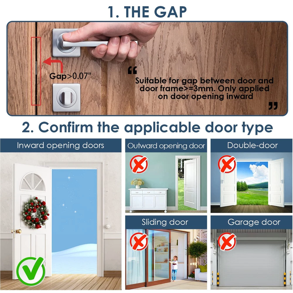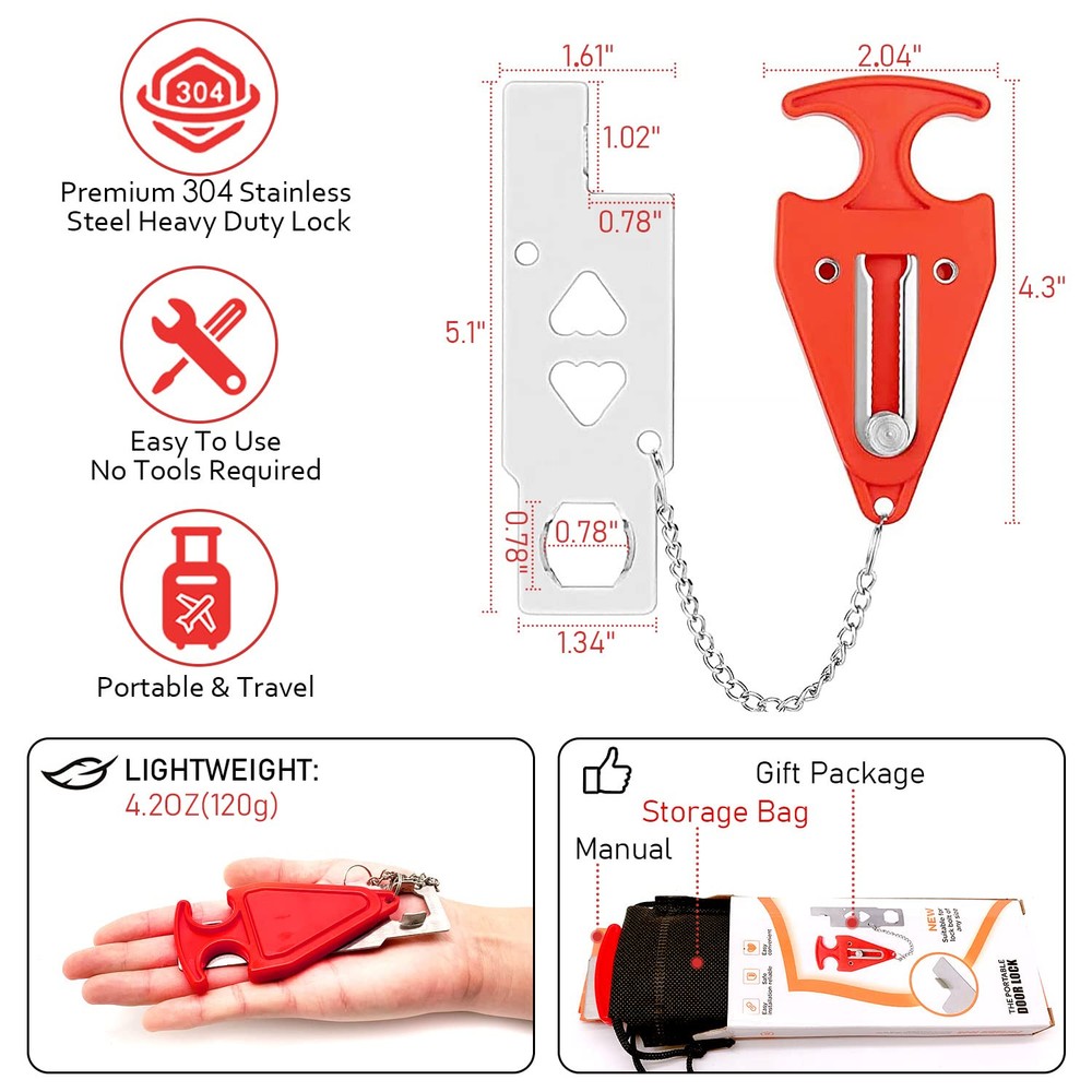 UPGRADE UNIVERSAL L-SHAPED PORTABLE DOOR LOCKS: For portable door locks on the market with only two sizes of holes, there are size restrictions on the length and width of the deadbolt that uses the door lock, and most door locks are not suitable. In response to this problem, our portable door lock adopts a new L-shaped design, which can perfectly fit all door locks and is suitable for door locks of various lengths, widths and shapes. SECURITY AND PRIVACY -: This portable door lock provides you with extra security and privacy, greatly improving your security and preventing unauthorized entry, so the door can't be opened from the outside, not even with a key; Hotel door lock are small and come with a cloth bag, and it's TSA compliant and will not be confiscated in your carry-on luggage if you are traveling by air. Which is a great helper for you when you are on business trip and travel , or live alone. INSTALLED & REMOVE IN SECONDS - WITHOUT ANY TOOLS: Door lock security installs in seconds without tools, requires no drilling or installation. Just put the metal piece goes into the hole on the door jam then you close the door, take the red handle, and insert it into the lock in place, and then no one can open the door from outside. Even in emergency situations and in the dark, you could remove the lock in seconds! HEAVY DUTY LOCK: The portable door lock is made of heavy duty steel, thick and rigid, with better performance and durability, While ensuring the life of the lock. Rugged ABS plastic cover to prevent damage to doors under pressure. Used the latest electroplating and polishing tech to ensure a perfect smooth touch, avoid any injury while using door lock. Provides secondary security for hotel, apartment, dorm room, bathroom, bedroom. WIDELY USED: It is a great gift idea for women living alone, It may be applied to avoid pets going out, and also to prevent children from opening their doors to strangers. it can provide additional security and privacy for family or pets. Perfect for hotels, Airbnbs, apartments, short-term rentals, dormitories, bedrooms, bathrooms or private rooms.