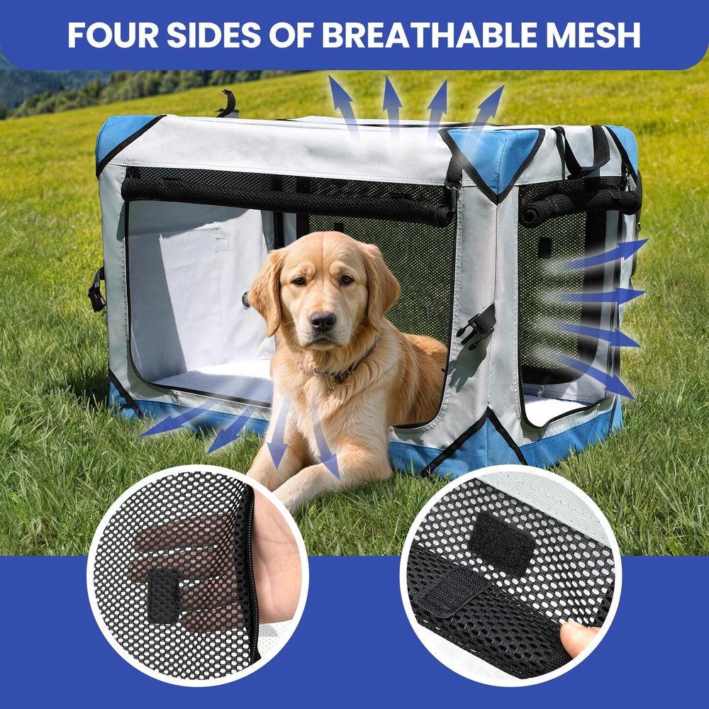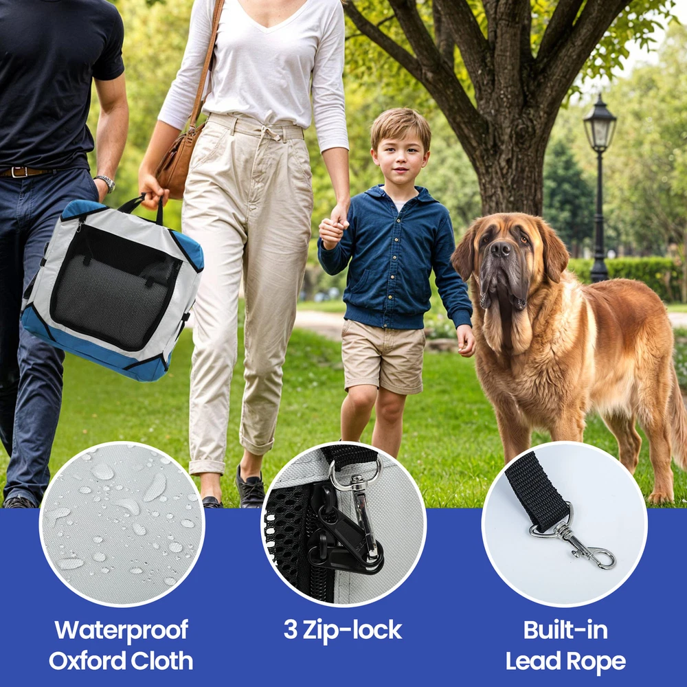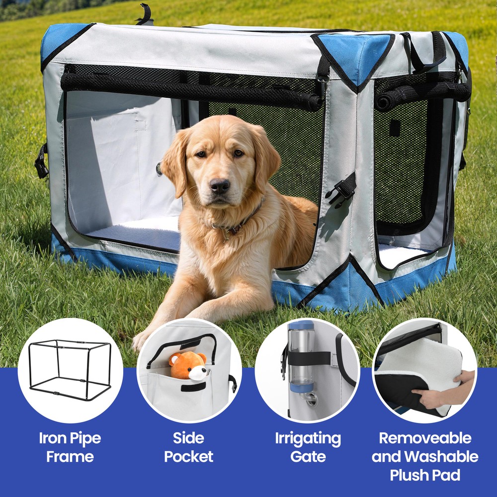 Portable Dog Crate Large Pet Travel Carrier Waterproof Camping Cage w/ Plush Pad < /div> Product Description NOTE: Professional Installation would be Highly Recommended. Description: 1. Color: Light Gray + Deep Blue 2. Material: Iron Tube, 600D Oxford Fabric, Eyelet Mesh Fabric 3. Special Design: Waterproof, Zipper Closure, Storage Bag, Three Sides Doors, Top Openable 4. Suitable for: Large Size Dog/Pet, Travelling Carrier, & Camping Cage Features: 1. Spacious and Convenient: This collapsible dog crate measures 36" L x 25" W x 25" H, providing ample space for pets up to 32" L and 21" H, with a maximum weight of 70 lb. Perfect for home and travel use. 2. Portable Design: Lightweight at 10.2 lb, this dog crate is easy to transport. The included storage bag makes it convenient to pack and carry, perfect for on-the-go pet owners. 3. Versatile Access: Features three side doors and a top that can be opened, allowing easy access and flexibility. The zipper closures ensure your pet remains secure while providing hassle-free entry and exit. 4. Durable Construction: Built with a sturdy iron tube stand and reinforced with spray coating. The 600D Oxford fabric and 190g eyelet mesh fabric ensure durability and breathability for your pet's comfort. 5. Waterproof and Easy to Clean: The waterproof fabric ensures easy maintenance and cleanliness, keeping your pet dry and comfortable in all conditions. Ideal for both indoor and outdoor use. Dimensions: 1. Overall Dimensions: 36" L x 25" W x 25" H 2. Maximum Pet Size: 32" L x 21" H 3. Maximum Weight: 70 lb 4. Item Weight: 10.2 lb Package Included: 1. 1x Dog Crate 2. 1x Accessory Kit 3. 1x Instruction Shipping 1. Normally the item will be dipatched within 1 business day if payment is cleared before 12pm PST. 2. Please verify the correct shipping address in your PayPal account before making the payment. We only dispatch the item to the address that is sent to us at the time of checkout. 3. We don't ship to Hawaii, Alaska, Puerto Rico, APO/FPO/PO Boxes. 4. We don't provide local pick-up service. 5. Normally we will use USPS, UPS, FedEx & LTL to dispatch items. Payment 1. We accept PayPal and credit card. 2. We will ship to the confirmed Paypal shipping address that is provided with the payment only. Return 1. 30 days Money Back Guarantee. 2. Please contact our customer service to receive a RMA form first if want to return the item. 3. All returned items MUST in new condition with the original package. Contact If has any problem, please contact us by sending an ebay message. Our customer service will resolve the problem as soon as possible. On Feb 13, 2025 at 02:28:40 PST, seller added the following information: