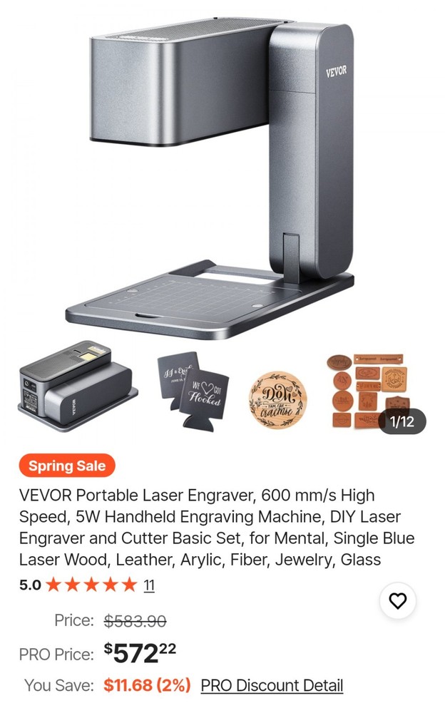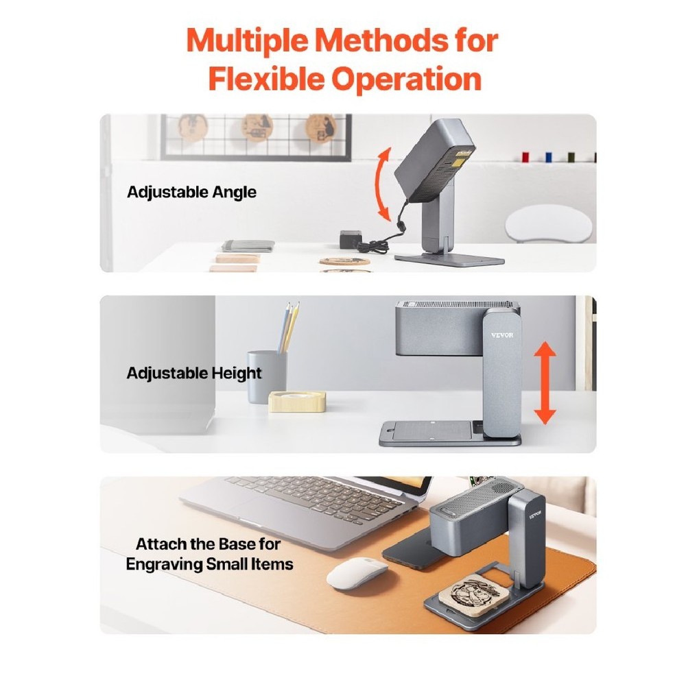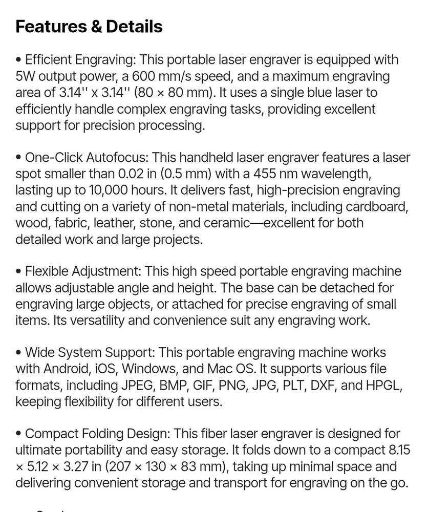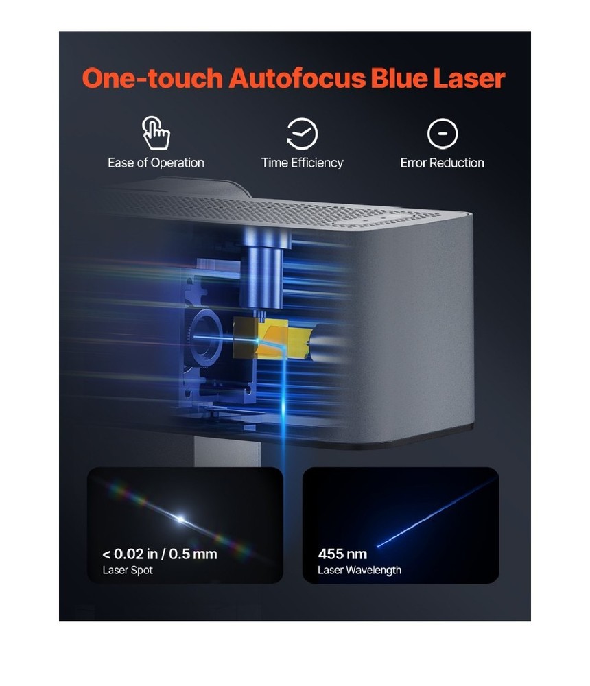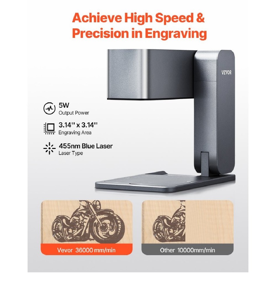 BRAND NEW IN THE BOX! The Portable Laser Engraver by VEVOR is a high-speed handheld DIY engraving machine that offers a laser spot size of 0.02'' / 0.5 mm and an engraving area of 3.14'' x 3.14'' / 80 x 80 mm. It uses a single blue laser with a wavelength of 455 nm and a power of 5W, providing precise and efficient engraving capabilities. Made of high-strength aluminum alloy with surface oxidation, this portable laser engraver is compact with a folded size of 8.15 x 5.12 x 3.27'' / 207 x 130 x 83 mm and a net weight of 5.95 lbs / 2.7 kg, making it convenient to use on the go. Perfect for various engraving projects in the printing and graphic arts industry.