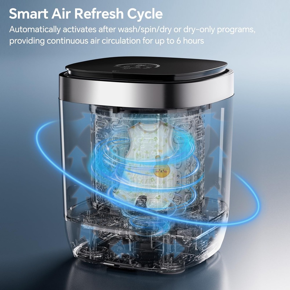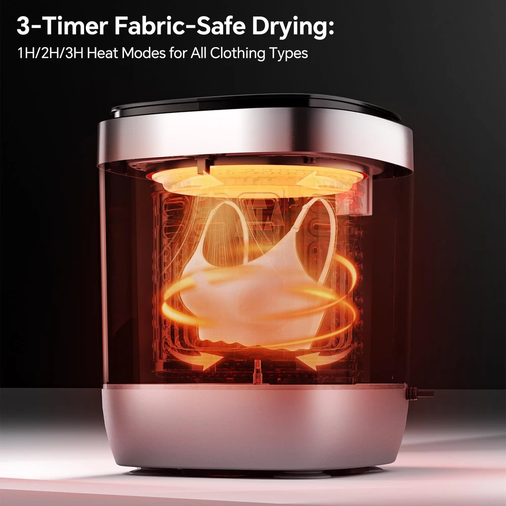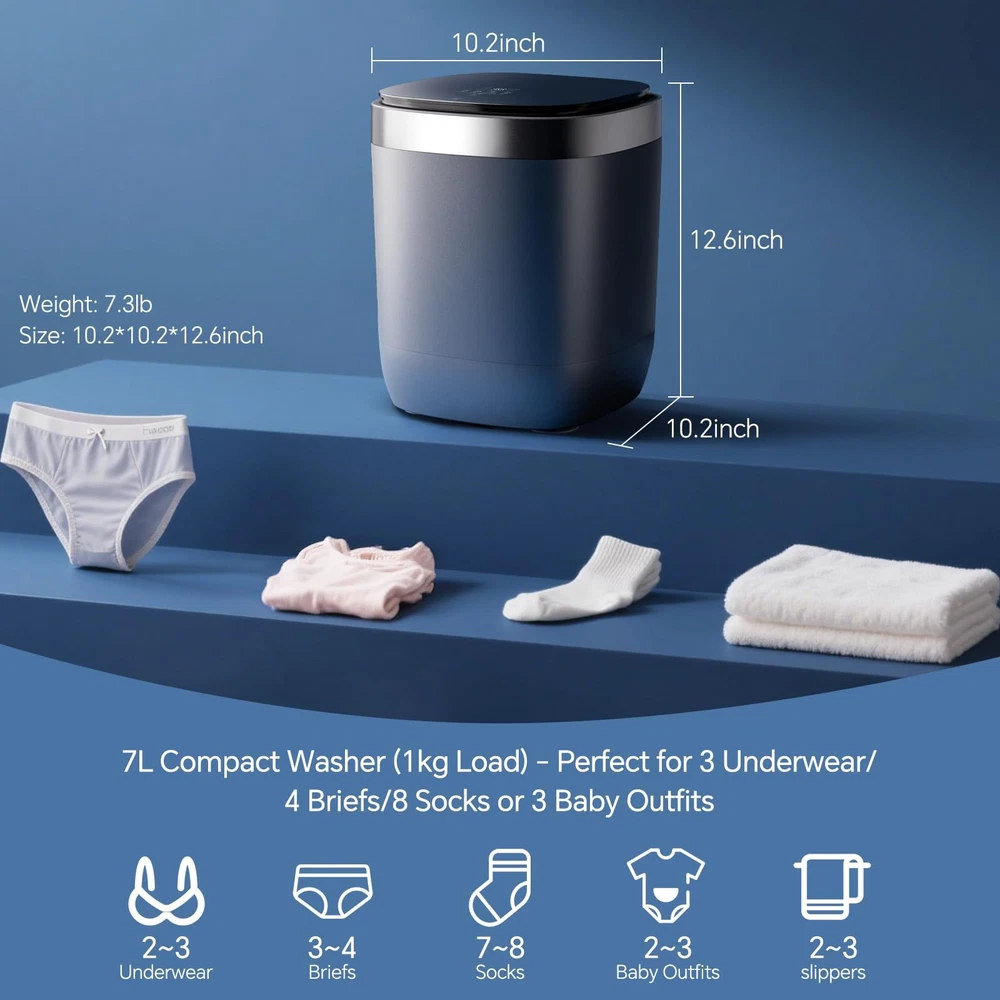 Looking for a Convenient, Space-Saving Laundry Solution? This Portable Mini Washing Machine is designed to make your life easier with its all-in-one functionality and compact design. Here's why it’s the perfect choice for small spaces, dorms, or travel: 1. All-in-One Design: Wash, Spin, Dry, and O₃ Deep Clean This mini washer does it all in one compact unit: ✔️ Washes your clothes thoroughly. ✔️ Spins out excess water for faster drying. ✔️ Dries your garments with hot air, even in cold or humid weather. ✔️ O₃ Deep Clean using advanced cleaning technology to eliminate odors. 2. Automatic Water Inlet & Drain System Simplify your laundry routine: ✔️ The machine automatically fills and drains water through its 4-point water inlet and drain system . ✔️ Just add detergent, turn on the faucet and power, and let the washer handle the rest. 3. Active Oxygen Stain Removal Say goodbye to stubborn stains: ✔️ The active oxygen cleaning technology penetrates deep into fabric fibers. ✔️ Removes tough stains while keeping your clothes fresh. 4. Hot Air Drying for Comfort Stay comfortable no matter the weather: ✔️ The built-in hot air drying function ensures your clothes are dry and ready to wear. ✔️ After drying, the machine switches to a circulating air mode (up to 6 hours) to keep your garments fresh. 5. Spacious 7L Capacity Despite its compact size, this mini washer can handle: ✔️ 2-3 pieces of underwear. ✔️ 3-4 pairs of panties. ✔️ 2-3 towels. ✔️ 2-3 baby clothes. ✔️ 7-8 pairs of socks. Perfect for everyday use or specialized laundry needs like delicates, baby clothes, and more. Why Choose This Mini Washer? ✔️ Compact and Portable: Ideal for small apartments, dorms, or travel. ✔️ Energy-Efficient: Designed to save water and electricity. ✔️ Easy to Use: Simple controls and automatic functions make laundry effortless. ✔️ Versatile: Handles a variety of garments, from underwear to towels. Kind Tips 1. Not suitable for washing large shirts and jeans: The capacity of the mini washing machine is only 7L, so large shirts and jeans are not supported! 2. Automatic Drainage: Connect one end of the drain pipe to the washing machine and place the other end in the sink or other place where water can be placed. The clothes will be automatically drained after washing. If the water cannot be drained out, or the water cannot be completely drained, the clothes will not be able to be dehydrated or dried. Please check whether the drain outlet of the drain pipe is lower than the bottom of the washing machine. 3. Proper Detergent Usage: Please make sure to put in the right amount of laundry detergent or liquid. Too much detergent will not only cause waste but may also lead to incomplete rinsing and leave residue on the clothes. The recommended amount of washing powder and laundry liquid for a 7L mini washing machine running at full load is: Washing Powder: Light soiling: 40-50 grams Medium soiling: 50-60 grams Heavy soiling: 60-70 grams Laundry Liquid: Light soiling: 40-50 milliliters Medium soiling: 50-60 milliliters Heavy soiling: 60-70 milliliters Upgrade your laundry experience with this efficient, reliable, and space-saving mini washing machine. Order now and enjoy clean, fresh clothes without the hassle! Automatic Water Inlet & Drain System:This mini washing machine features a convenient 4-point water inlet and drain design for quick and effortless water filling and draining. Simply add detergent, turn on the faucet and power, and let the machine handle the rest. Smart Dehydration & Drying Modes:With its advanced drying technology, this mini washer automatically washes, dehydrates, and dries your clothes. After hot drying, it switches to a circulating air mode (up to 6 hours) to keep garments fresh and comfortable. Hot Air Drying Function:Ideal for cold or humid weather, the built-in drying function ensures your underwear, socks, and delicates are thoroughly dried and ready to wear every day. Active Oxygen Stain Removal:Utilizing ozone technology, this mini washer penetrates deep into fabric fibers to remove stubborn stains and sanitize clothes, leaving them clean and odor-free. Spacious 7L Capacity:Despite its compact size, this small washing machine can handle up to 2-3 pieces of underwear, 3-4 pairs of panties, 2-3 towels, 2-3 baby clothes, or 7-8 pairs of socks, making it perfect for everyday use.