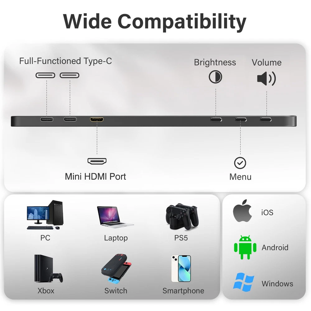 [Full HD Portable Monitor ] 15.6inch portable laptop monitor with 1920*1080 resolution delivers a truly immersive viewing experience that lets you enjoy High-Definition entertainment and gaming. The 15.6-inch Full HD IPS portable screen offers a 178°Full viewing angle and Eye Care technology that keeps your eyes from getting tired during prolonged use [Extensive Compatibility & Plug & Play] portable monitor features 2 full-featured Type-C ports and 1 MINI HDMI port.HDMI & USB C ports design makes this portable gaming monitor more convenient to connect your laptop, smartphone, PC, PS3, PS4, XBOX ONE, or Nintendo Switch etc. portable computer monitor is ideal for extending your screen or playing games on business trips, travel, or home entertainment. Without battery, No WiFi, You can also connect the screen extender to your device by HDMI cable with power cable(included) [Lightweight Ultra Slim for Travel ] With a slim 0.3-inch profile and just 1.76 pounds, 15.6 inch portable external monitor is ideal for your life, work, or travel to make a simple setup on-the-go dual-monitor and mobile presentations [Stand Cover ] has added a smart cover to fully protect our monitor. The cover case of this portable screen is made of PU leather to provide excellent protection for the entire monitor and can be folded into different positions to create a stand(Note:portable monitor comes with a built-in screen protector directly from the factory. Therefore, no additional screen protector is provided with the package) [Dual Speakers & HDR Mode ] 2 built-in speakers in the computer monitor efficiently helps display multi-media files especially when listen to music/watch movies/play games. HDR mode support excellent mainstream transmission so that you can enjoy great video transmission in game and other entertainment