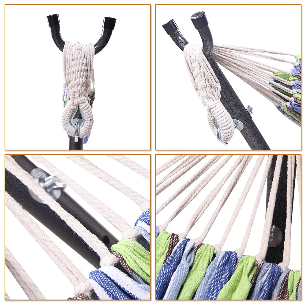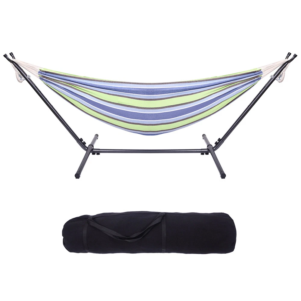 Warning: 1. Please make sure to lock all the plastic nuts and S hooks before using. 2. Never allow young children to use the hammock or stand unaccompanied by an adult. 3. DO NOT EXCEED THE LOAD LIMITATION OF 250LBS. (This load limitation has been tested for when you swing back and forth gently on the hammock. If you sit still, the load limitation is about 250 LBS.) Introductions: Enjoy yourself in our Portable Outdoor Polyester Hammock Set at any! It is composed of a hammock, a hammock stand and a portable handbag. Each item in this offer is made with premium material and delicate workmanship, with ensured quality and durability. Thus, you can carry it along easily for all kinds of outdoor activities. Also, the hammock could bear up to 135Kg weight to the maximum so that even two persons are allowed to lie on it freely without any worry and concern. What are you waiting for? The intoxicating leisure is waving its hands to you! Features: 1. With a hammock, a hammock stand and a handbag included 2. Compact, lightweight and portable for easy carrying and storage 3. Could bear up to 135Kg weight to the maximum 4. Comfortable and easy to use, great for all kinds of outdoor activities 5. Bring you an amazing leisure in the open air 6. Suitable for outdoor camping, travel, beach and indoor use Specifications: 1. Material: Polyester 2. Dimensions: (102.3 x 41.33 x 39.37)" / (260 x 105 x 100)cm (L x W x H) 3. Weight: 30.64 lbs / 13.9 kg 4. Color: Green 5. Weight Capacity: 250lb / 135kg Package Includes: 1 x Hammock 1 x Hammock Stand 1 x Handbag