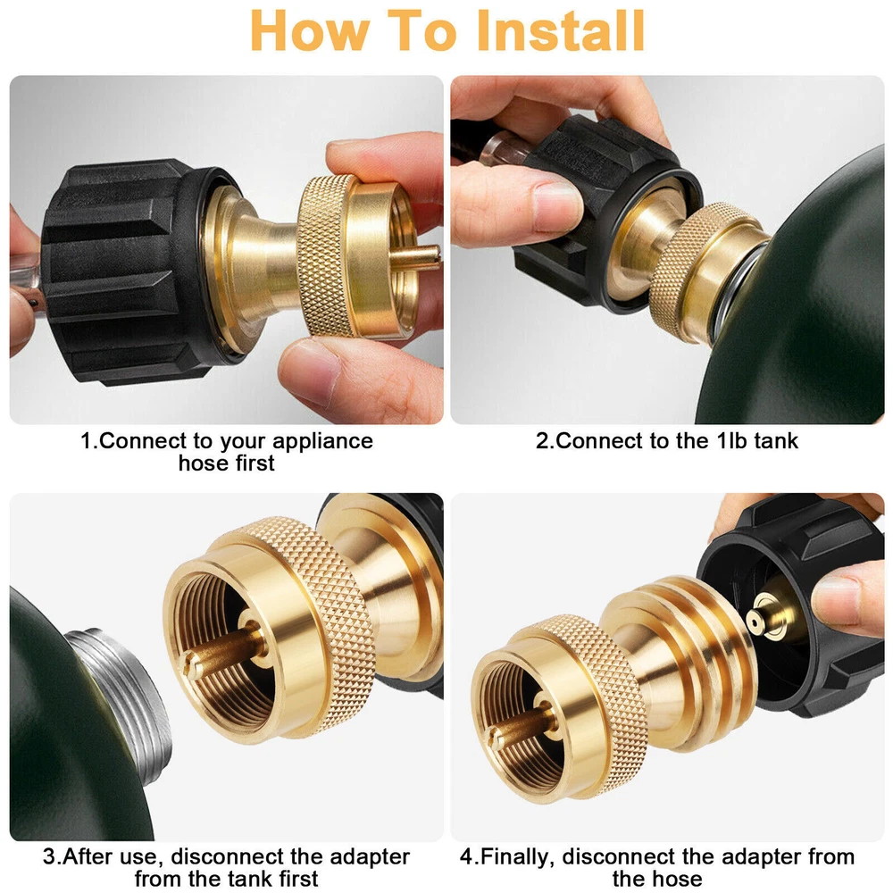 Product Description Portable Outdoor Propane Refill Tank Adapter Fill 1 Lb Bottle From 20 Lb Tank Features: Universal Interface: Equipped with a 1""-20 Female Disposable Cylinder x QCC-1 and Female P.O.L. connector for wide-ranging compatibility. Durable & Corrosion-Resistant: Crafted from high-quality solid brass, ensuring exceptional longevity and resistance to corrosion. Simplified Connection: Effortlessly link a standard 1lb propane tank to your conventional BBQ gas grill for seamless operation. Enhanced Portability: This adapter eliminates the need to transport cumbersome 20lb propane tanks, optimizing convenience for outdoor cooking. Easy to Use: Easy and quick to install to propane appliances.Suitable for BBQ gas grills, heaters,camping stoves,lanterns,tabletop frills and so on.Make your outdoor life more convenient. Warm Tips: ①Only used for outdoors. ②Make sure the valve is closed before refilling. ③When installing, first connect the hose and then the 1lb propane cylinder; when dismantling, remove the cylinder first and then the propane hose. Specifications: Type: Propane Adapter Material: Solid Brass Fuel Type: Propane Inlet: 1"-20 Female Throwaway Cylinder Outlet: QCC-1 Thread and Female P.O.L. Application: Used for camping, cooking, heating and more Suitable: Universal for most propane appliances Package Include: 1 x Propane Adapter About Us Welcome to the our store! You can chat with us about anything to do with our products. we dedicated to provide best products and services. Payment All ebay verified payments are accepted, if you have any questions about the payments, you can let us know, we will try our best to solve this for you. Shipping We usually ship all packages within 24 hours after payment and 48 hours at latest for a small part of our products. Returns Always believe we can solve your questions about our products with communication. And if it comes to a return at last, the item must be intact and the same condition when you received it, also the return is only available within 30 days after delivery. Contact Us You can contact us at any time via ebay messages, we will reply at the first time in the working times. We will always be here for you! Working time: 9am to 6pm, Monday to Friday. You may also like New High Quality Sapphire Watch Glass Replacement Part For Casio MDV-106 24.99 USD 3.69 USD 100Pcs Microphone Pop Filter Hygiene Mike Foam Cover Odor Removal Disposable 13.96 USD 4Pcs Upgrade Axle Arms With Motor(2A+2B) For E58 JY019 FPV RC Drone Quadcopter 13.99 USD 3.69 USD 1/4 Screw Adapter Mount Base With Screws For GoPro Max Hero 10 9 8 Black Camera 13.99 USD 3.69 USD Anti Snore NASAL DILATORS Stop Snoring CONES Breathe Easy NOSE Congestion 8.45 USD 3.69 USD 8 in 1 USB Programming Cable+Software CD For Motorola Baofeng Kenwood HYT Radio 15.95 USD 3.69 USD powered by