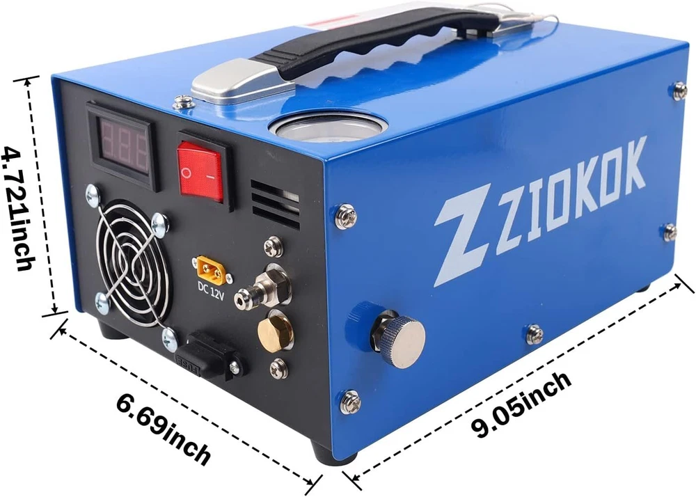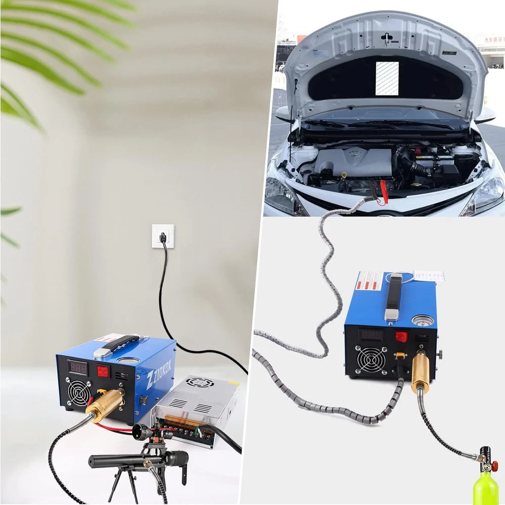 Product Description Package included: 1 x PCP Air Compressor 1 x AC Power Cord 1 x Battery Clip Cord 1 x Air Hose 1 x Accessory Kit 1 x Detailed Instruction Portable PCP Air Compressor-4500PSI High performance and durable This is a brand new PCP air compressor with fast charging speed. It takes about 18 minutes to inflate a 0.5 liter cylinder from 0 to 300 bars. The compressor has the characteristics of excellent performance, easy operation and simple maintenance, which can be powerer by AC 110V or car DC 12V. The rated power is 350 watts. It can easily handle air gun inflation at home or in the wild. Auto-stop Built-in Adapter Oilless and Waterless Efficient Cooling Fan Large Filter Newly Upgraded Portable Car or Home PCP Air Gun Compressor: BUILT-IN POWER ADAPTER can be powered by the 12V car battery, also can be powered by the home 110V/220V AC. Inflate your equipment PCP air rifles, air pistols, paintball guns, and HPA tanks anywhere and make it ready for action anytime. 8MM Quick Connector & Oil-Water Separator: The inflation nozzle is a 8MM female port, which can be quickly connected and disconnected. It is suitable directly for nipples of PCP air rifles/pistols and paintball tanks.The activated carbon separator on the hose can be used repeatedly. It can efficiently filter oil and water in the air and output clean and dry high-pressure air. Water/Oil-Free & Oil-Moisture Filter: There is no need to add oil and circulating cooling water, which reduces the trouble of connecting an additional water pump and simplifies the operation. The built-in high-power fan can improve the cooling efficiency greatly and make the compressor fill your airgun continuously. The temperature monitoring function is added this time. When the temperature reaches 90 degrees, please shut off the compressor for cooling and keep the cooling fan running. Features & Details Newly Upgraded Portable Car PCP Air Gun Compressor: BUILT-IN POWER ADAPTER can be powered by the 12V car battery, also can be powered by the home 110V/220V AC. Inflate your equipment PCP air rifles, air pistols, paintball guns, and HPA tanks anywhere anytime.The Air Compressor can easily achieve 300Bar/4500Psi/30Mpa.It is recommended that the air cylinder volume is limited to 1L (60ci).The net weight is 5-8 kg.The top side is slightly larger than your open palm convenient to carry and store. Oil/Water-Free & Oil-Moisture Filter: The Air Compressor no need to add oil and circulating cooling water, which reduces the trouble of connecting an additional water pump and simplifies the operation.Instead, a high-power side fan is built-in to dissipate heat. An oil-moisture filter has been integrated at one end of the hose. It can efficiently prevent oil and moisture from corroding your airguns or air tanks. 8MM Quick Connector & Oil-Water Separator PCP Air Compressor: The inflation nozzle is a 8MM female port, which can be quickly connected and disconnected.The activated carbon separator on the hose can be used repeatedly. Inflating Speed: 500CC tank, from 200BARS to 300BARS takes about 7-9 minutes;The duty cycle of this pump is: continuous inflation for 25 minutes and rest for 10 minutes. The rated power of this air compressor is 350W. Small Weight & Compact size & high quality: The Air Compressor net weight is 5-8 kg.The top side is slightly larger than your open palm convenient to carry and store. What you will get: 1 x PCP Air Compressor,1 x AC Power Cord,1 x Battery Clip Cord,1 x Air Hose,1 x Accessory Kit,1 x Detailed Instruction. Every compressor from us has a one-year worry-free warranty. Providing customers with high-quality products and services is our constant pursuit.