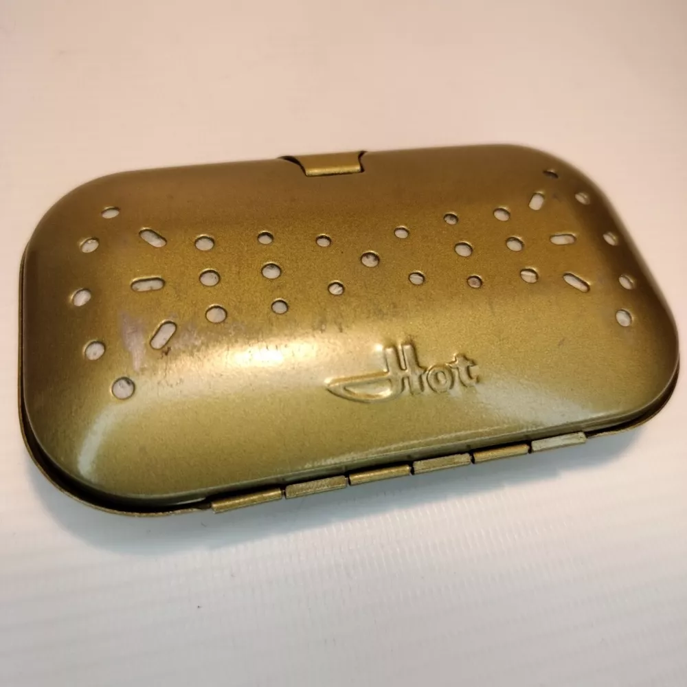 This vintage 1960's portable pocket hand warmer is a must-have for any camping enthusiast. It is perfect for those chilly evenings around the campfire, and can also double as a charcoal fuel type for your barbecue needs. The gold color adds a touch of elegance to your outdoor heating, cooking, and eating setup. This hand warmer is designed for convenience and portability, making it an ideal addition to your outdoor gear. It is perfect for keeping your hands warm while cooking or eating, and can also be used as a heat source for other outdoor activities. Its compact size makes it easy to carry around, and its vintage design is sure to impress. Get your hands on this unique piece of outdoor history today!